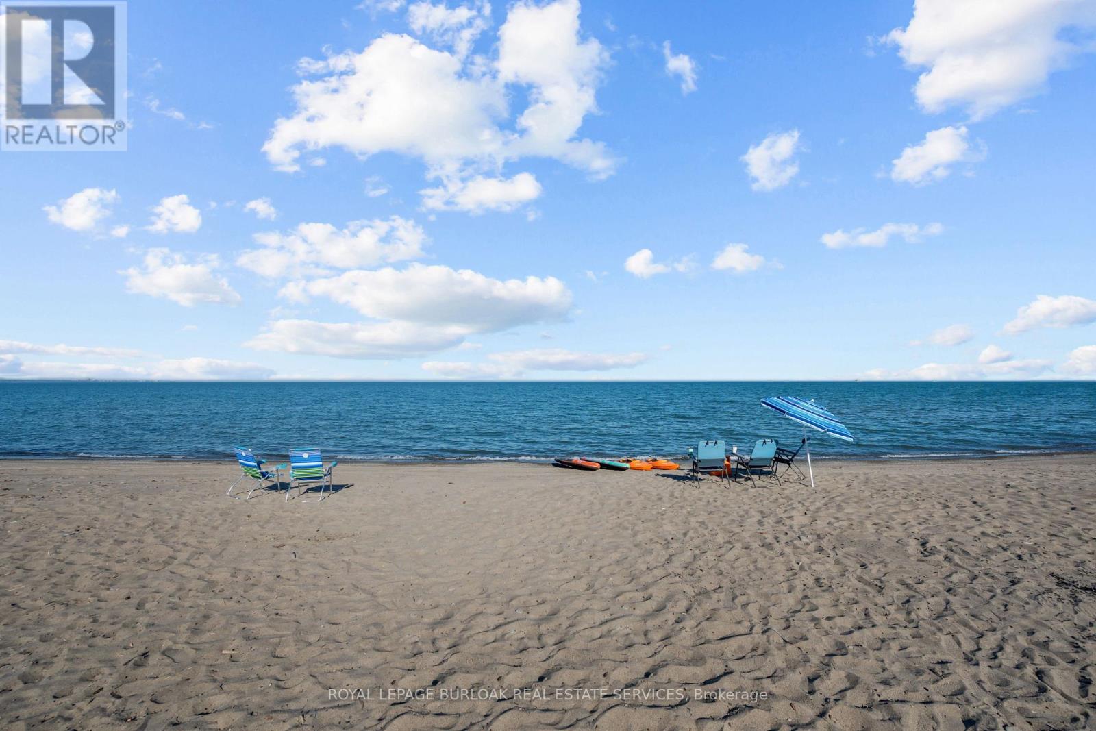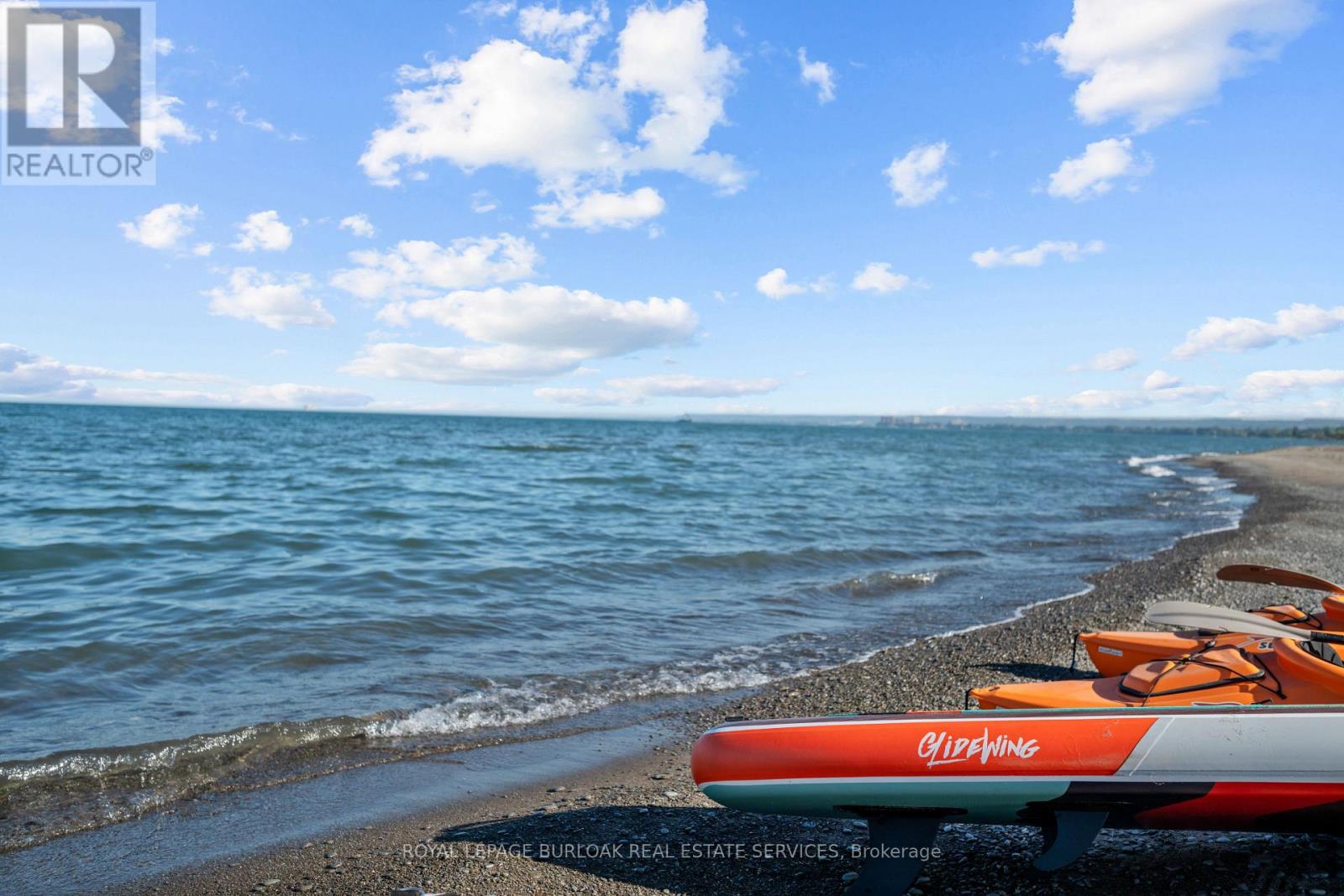 Welcome to lakeside luxury living at its finest. With panoramic views of Lake Ontario from nearly every angle, this sophisticated residence invites you to experience the water as part of your daily life. This 2+1 bedroom, 2-bath townhouse features 1,415 sq. ft. of fully updated living space across three levels, designed to complement its breathtaking waterfront setting. The bright, eat-in kitchen features stainless steel appliances, quartz countertops, two-toned cabinetry, and ample storage-perfect for everyday living or entertaining. The open-concept dining and living area showcases built-in shelving, upgraded lighting, and unobstructed views of Lake Ontario. Step out to your 9' x 15' partially covered balcony complete with a gas BBQ hookup and stairs leading directly to the beach-ideal for summer gatherings and quiet morning coffees. New hardwood stairs with sleek metal banisters lead to the upper level, where you'll find the beautiful primary bedroom with large windows framing more stunning lake views, a second spacious bedroom, and a tastefully renovated 4-piece bathroom. The versatile lower level offers additional living space for a gym, office, or playroom, featuring a walk-out to the private patio and relaxing hot tub overlooking the lake, plus a modern 3-piece bath and inside entry from the garage. Recent updates include: flooring (2023), kitchen and appliances (2023-2025), lower bath (2025), upper bath (2024), hardwood stairs & metal railings (2025), upgraded lighting (2023), custom living room built-ins (2024), hot tub (2023), deck updates (2025), and roof shingles (2021). Enjoy parking for two cars, an EV charger, and a low condo fee that covers snow removal, gardening, and irrigation. Savour evenings by the fire with neighbours, paddle boarding or kayaking from your backyard, and the soothing sound of waves at night. Just minutes to restaurants, shopping, Confederation GO Station, and downtown Burlington-this is turn-key lakefront living at its best. (id:4555)