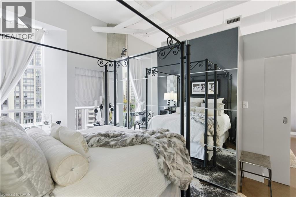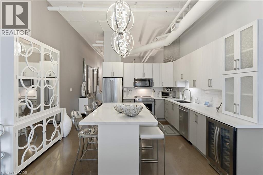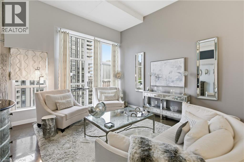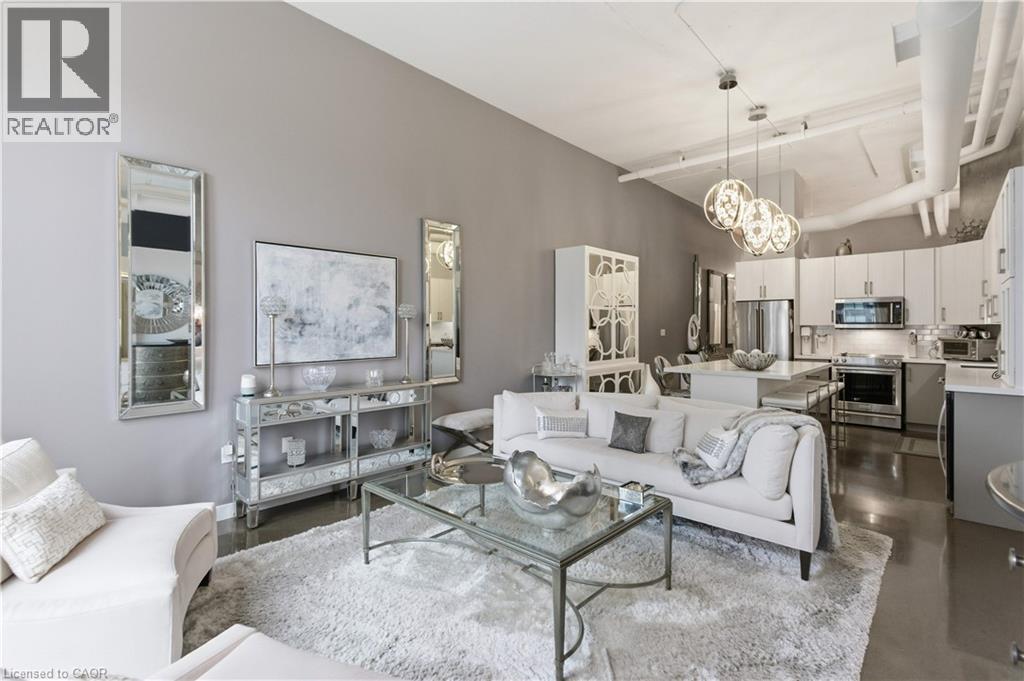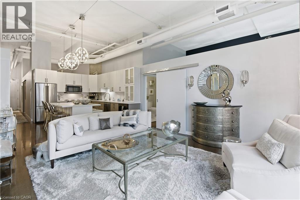 Welcome to Core Lofts - Hamilton’s premier loft condominium, ideally situated in the city's coveted Durand neighbourhood. Once a former Bell Canada office building, this landmark conversion seamlessly blends industrial character w/ sophisticated urban design. This exceptional 1143 sq ft, 2-bdrm, 2-bath penthouse offers an elevated living experience w/ western exposure. Polished concrete floors, soaring 12.5' ceil & expansive windows create a striking open-concept environment filled w/ natural light. The custom-reno'd kitch is a true showpiece, feat bespoke cabinetry, quartz counters, a stylish tiled backsplash, S/S app (incl a beverage fridge) & a large centre island w/ dual overhang seating for up to 8. The spacious liv rm opens to a Juliette balcony overlooking the city skyline, while the primary retreat feat an oversized closet, custom oversized wardrobe & a luxe upgraded 3-pc ensuite w/ an oversized glass shower & modern finishes. A 2nd bedroom, currently utilized as a den, provides flexibility for a home office or guest suite. The beautifully updated 4-pc main bath feat a tub/shower combo w/ a glass enclosure. Add highlights incl in-suite laundry, upgraded lighting, a tandem 2-car parking space (#59 PL-2 Lvl A), & an oversized storage locker (#23 on penthouse lvl). Steps away from access to a rooftop terrace w/ panoramic views of the city & topography, complete with BBQ areas & multiple seating zones. Add amenities incl a well-equipped gym, a stylish lobby, & a modern meeting room. Recent notable building improvements incl elevators, HVAC systems, & improved entry security. The location is second to none - steps to vibrant James St, the GO Station for easy commuting to Toronto, restaurants, shops, St. Joseph’s Hospital, & the Downtown Arts District. Walk to parks, trails, cafés, & everything downtown has to offer. This rare penthouse combines timeless industrial style, urban convenience, & luxe comfort - truly one of Hamilton’s most impressive loft residences. (id:4555)