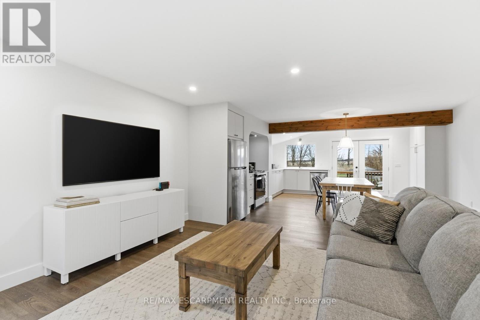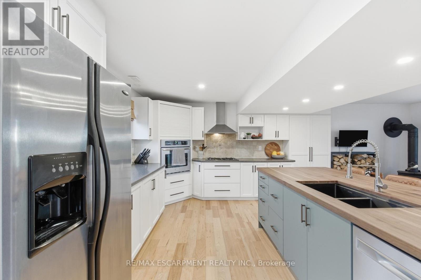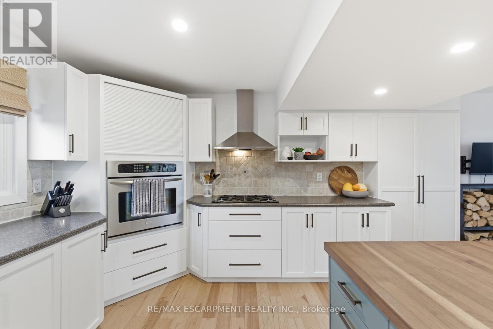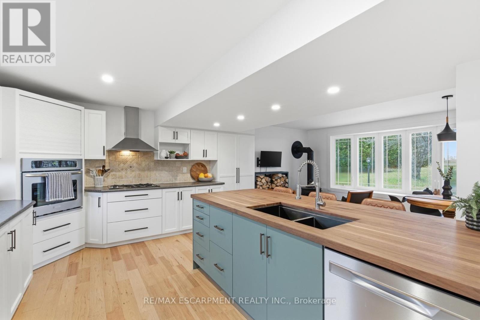 Incredible opportunity to own this rare two-family home set on a full one-acre property, just seconds from downtown Binbrook. Both units are fully above grade and feature completely separate front and rear entrances, offering versatility for multi-generational living or rental income. North Suite: Step inside to an updated kitchen equipped with built-in stainless-steel appliances, a butcher-block island, modern trim work and beautiful hickory engineered flooring. The bright living/dining area provides the perfect space for family gatherings and entertaining. The lower level features a renovated rec room with a cozy fireplace-ideal for movie nights. Upstairs are two bedrooms with excellent storage and an updated 5-piece bathroom. South Suite: The professionally designed kitchen showcases a warm, inviting aesthetic with a gas stove, stainless steel appliances and quartz countertops. Enjoy a spacious family room filled with natural light, two main-floor bedrooms and an updated full bathroom. A generous mudroom with separate laundry completes this level. A third bedroom is located in the finished basement. Outdoor Living: You'll love the stunning sunsets on summer nights. The expansive 1-acre yard offers everything you need-an on-ground pool, a 3-car garage/workshop, extensive vegetable gardens and a charming garden house with lots of potential. There is ample space for entertaining, relaxing and enjoying country living just moments from town. RSA. (id:4555)