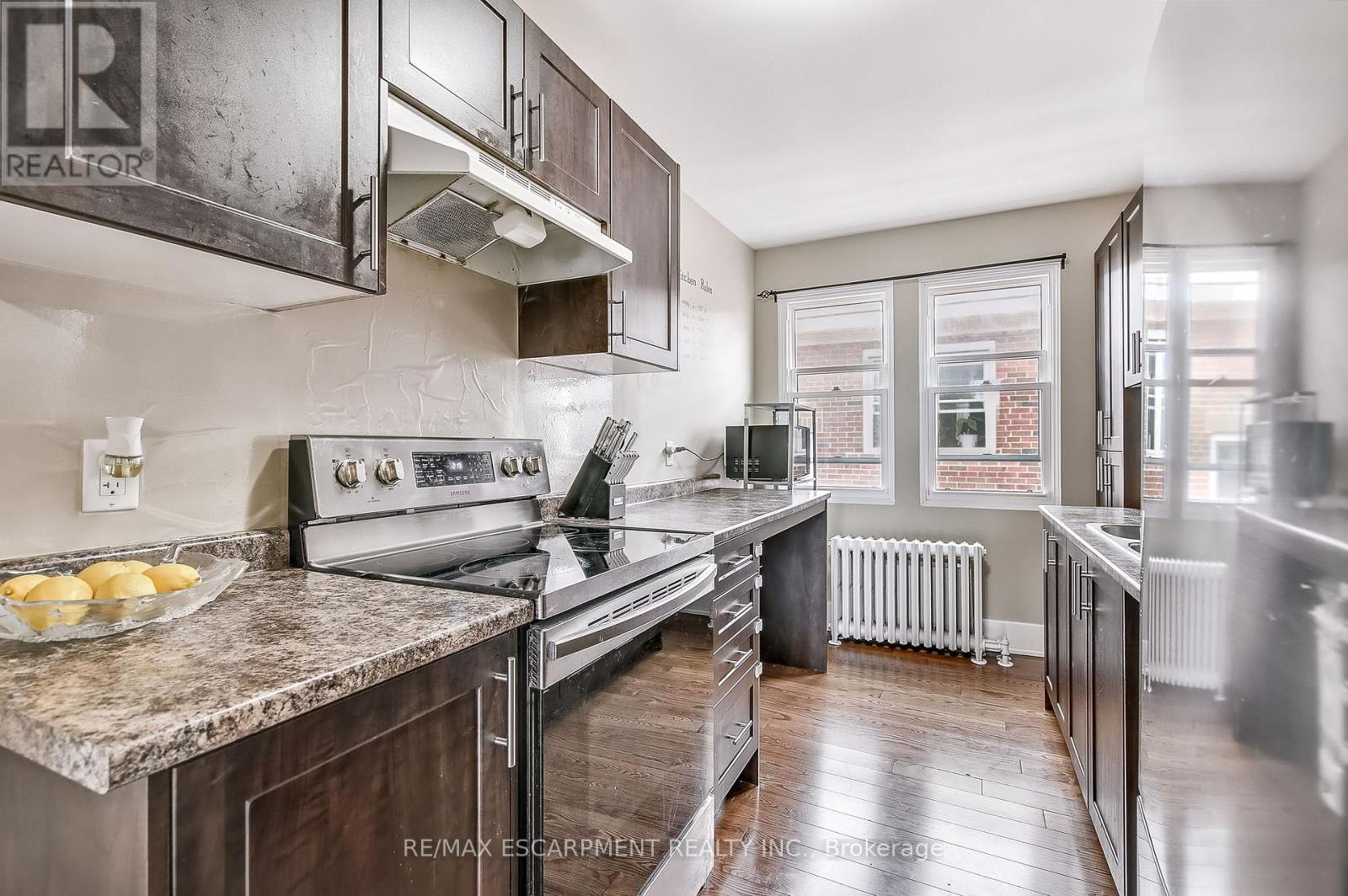 Fabulous 2 Bedroom Condo with Escarpment Views! Bright and spacious approx. 950 sqft. top-floor corner unit offering stunning west and south-facing views over the city and escarpment. This beautifully renovated condo features hardwood flooring throughout, a large sun-filled living room, separate dining area, and a functional kitchen with laundry hook-up. Enjoy two generous bedrooms and a full 4-piece bath. Permit parking available. Conveniently located close to walking trails, public transit, and St. Joseph's Hospital, perfect for professionals or downsizers seeking comfort and accessibility. (id:4555)