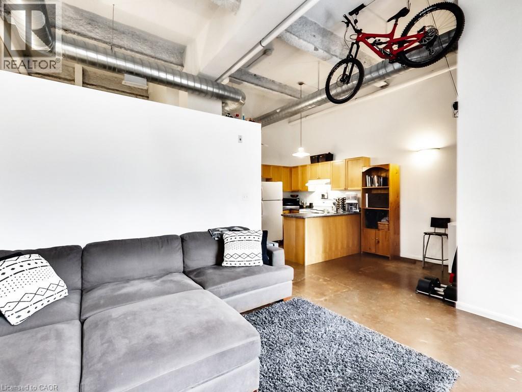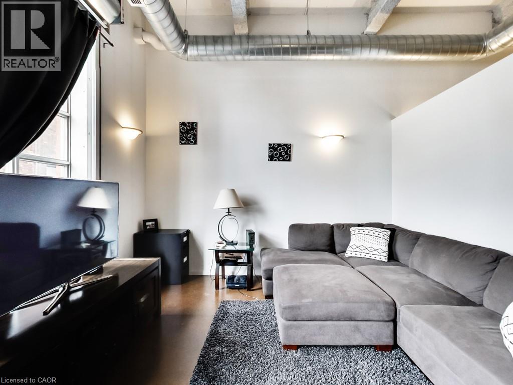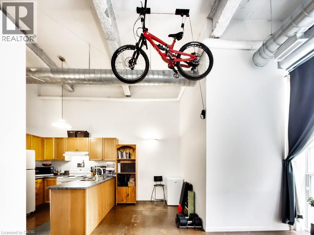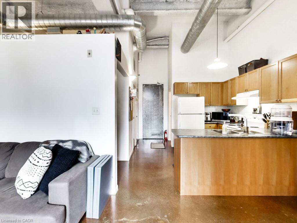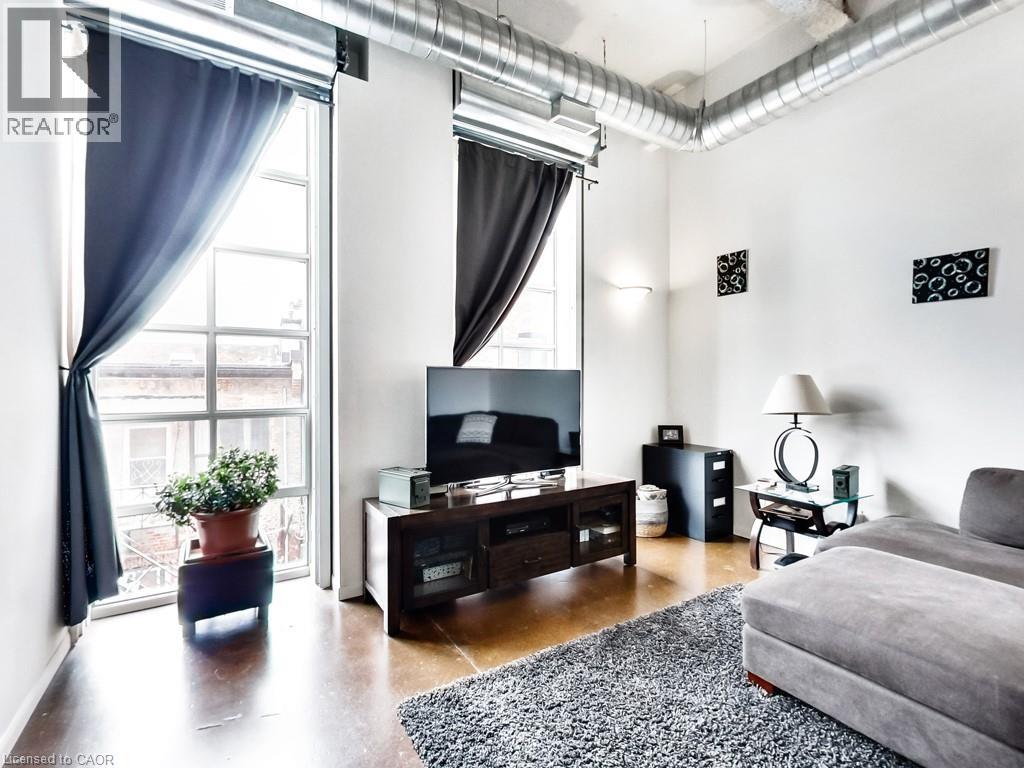 Discover executive urban living in one of Hamilton’s most sought-after boutique loft conversions. Perfectly situated in the heart of downtown, this stylish unit offers an unbeatable Walk Score of 99, placing you steps away from everything the city has to offer — HSR transit, Gore Park, Jackson Square, James St. N restaurants, cafés, and shops, plus an easy walk to both the Hunter GO Station and the new West Harbour GO Station. Augusta Street’s vibrant dining scene is also just minutes away. Inside, this impressive suite features soaring 14-foot ceilings, creating an expansive, airy atmosphere with endless possibilities — build a lofted second sitting area or even a second bedroom. Massive 10-foot windows flood the unit with natural light, highlighting the polished concrete floors, exposed ductwork, and industrial-chic finishes that define the Annex Lofts. The kitchen offers generous eat-in space with warm maple cabinetry, while the convenience of in-suite laundry, a dedicated locker, and access to an adjacent parking lot (current rented spot can be transferred) add to the ease of downtown living. The building also includes a party room. Ideal for young professionals, creatives, commuters, or investors, this unique loft-style condo combines modern character, unbeatable location, and exceptional lifestyle convenience in one dynamic package. (id:4555)