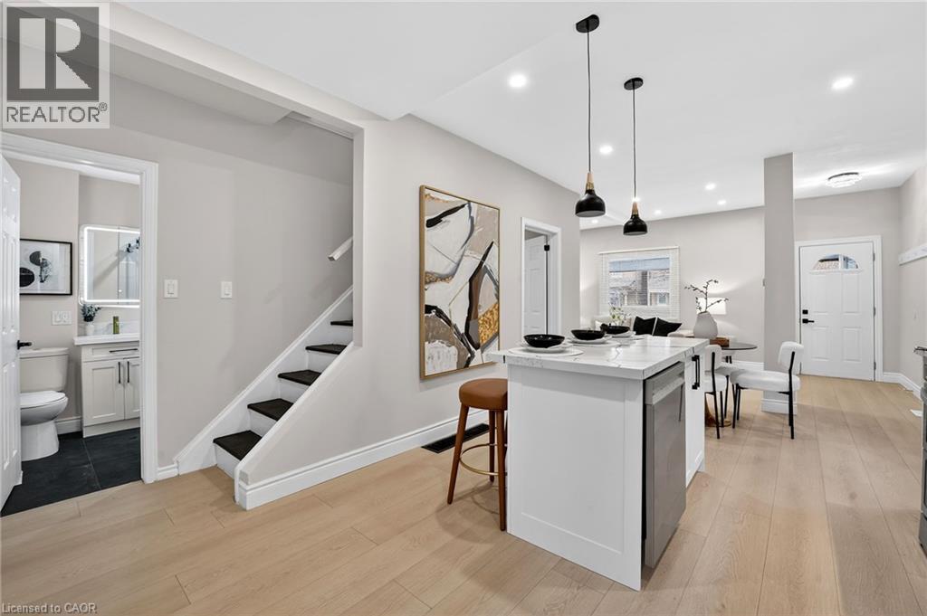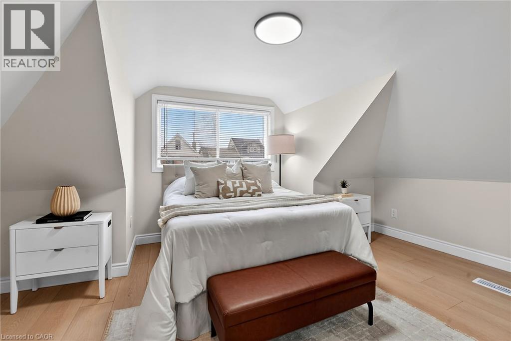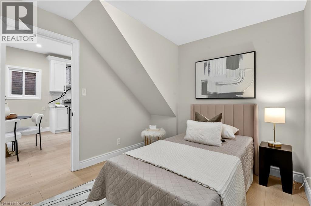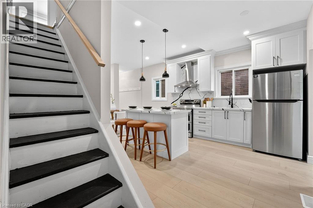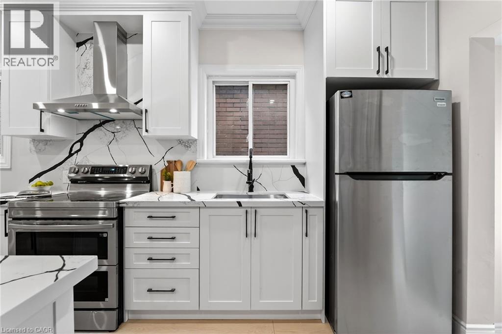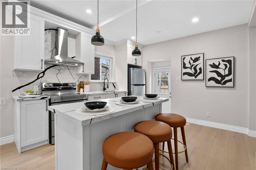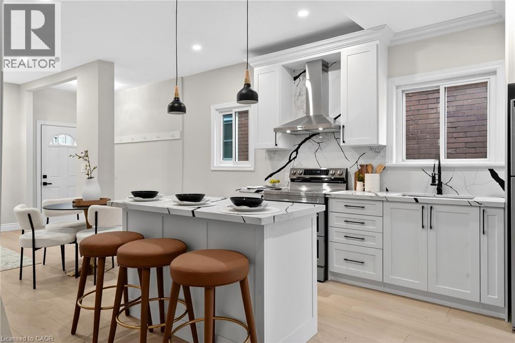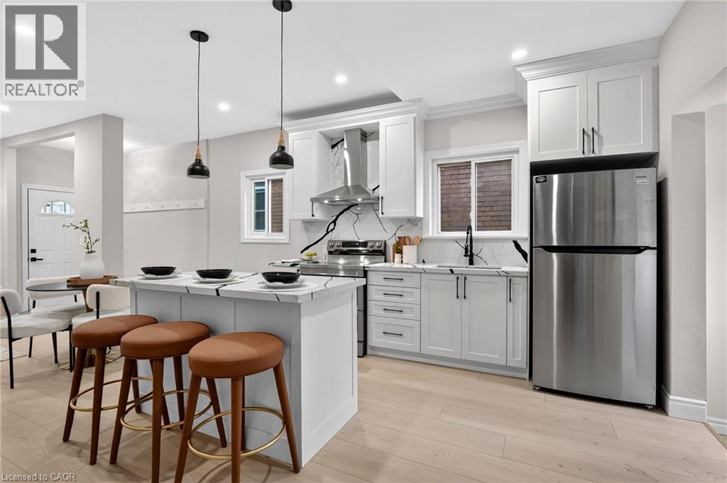 Welcome to 201 Grosvenor Avenue, where modern design meets community charm in one of Hamilton's coolest neighbourhoods-Crown Point. This beautifully updated 2+1 bedroom, 2 bathroom home is the perfect blend of style, comfort, and functionality, ready to create years of great memories.Step inside and you're immediately greeted by soaring ceilings and a bright, cozy living space featuring a statement feature wall and electric fireplace, all anchored by an oversized window that looks out onto your private deck-ideal for both relaxing evenings and lively gatherings.The open-concept designer kitchen flows seamlessly from the living area, making it perfect for entertaining and everyday family life. Finished with stainless steel appliances, modern cabinetry, and plenty of prep space, this kitchen truly sits at the heart of the home. The main level also offers a versatile bedroom-ideal as a home office or guest room-along with oversized laminate flooring and a full bathroom complete with a glass-enclosed standing shower.Upstairs, retreat to your private primary suite, featuring an oversized bedroom, a custom built-in his-and-hers closet, and a spa-inspired ensuite with a four-piece bath, standing shower, tub, and a window overlooking the backyard.Outside, the home continues to impress with an oversized poured concrete patio and a generous backyard designed for entertaining. Enjoy the built-in bar setup, TV inserts, and a shed for extra storage-perfect for hosting friends, family, and game nights.Additional highlights include two parking spaces and a prime location just minutes from Ottawa Street, known for its vibrant shops, cafés, and community atmosphere.This is modern Crown Point living at its best-move in, unpack, and enjoy. (id:4555)