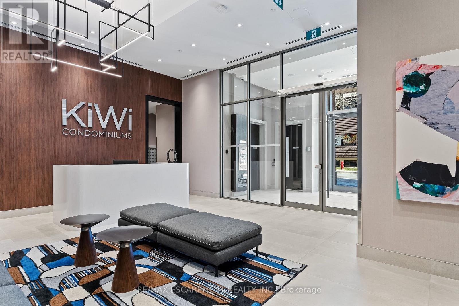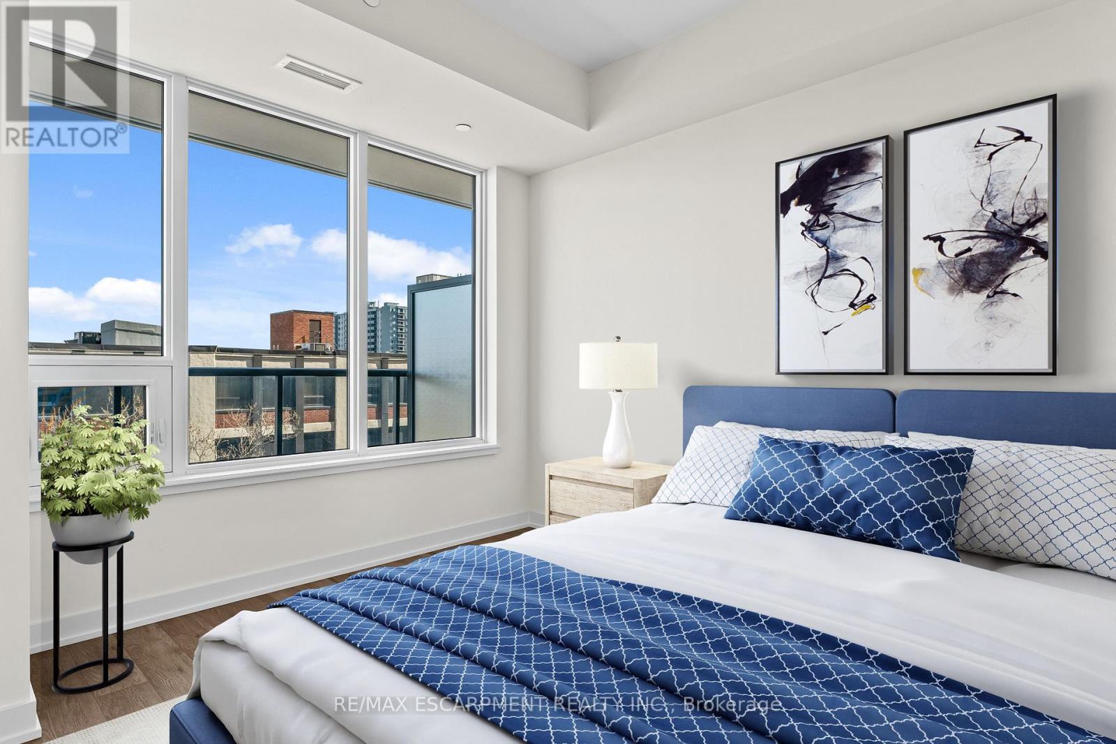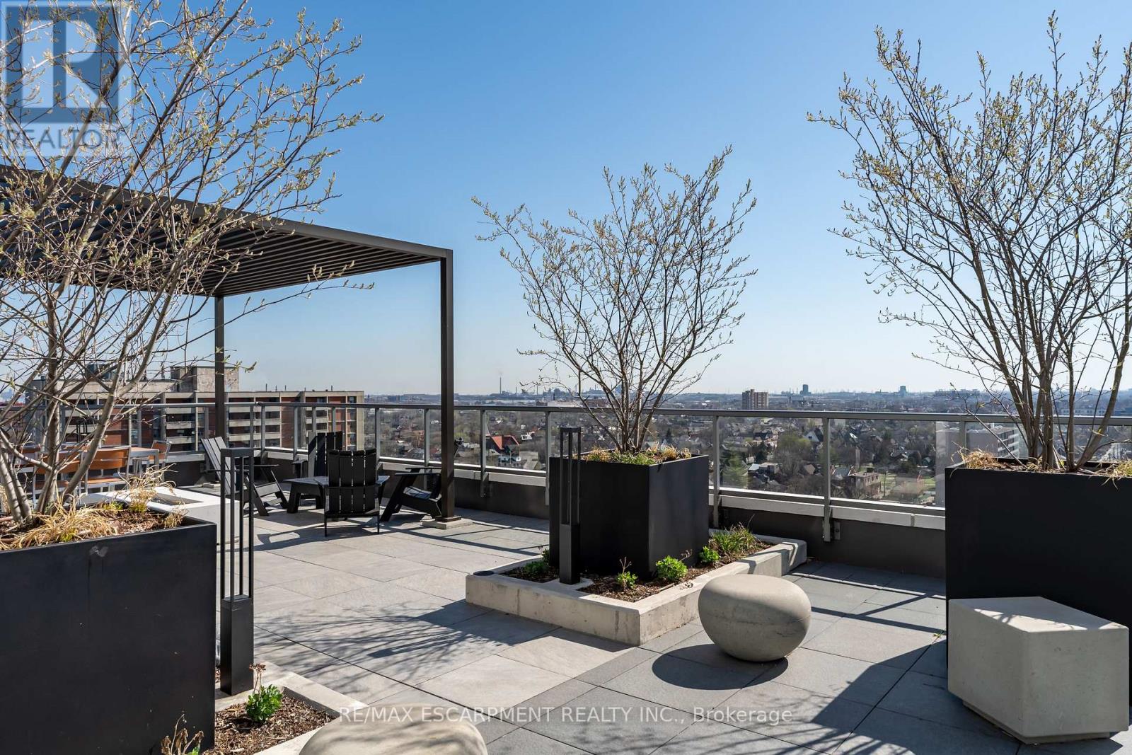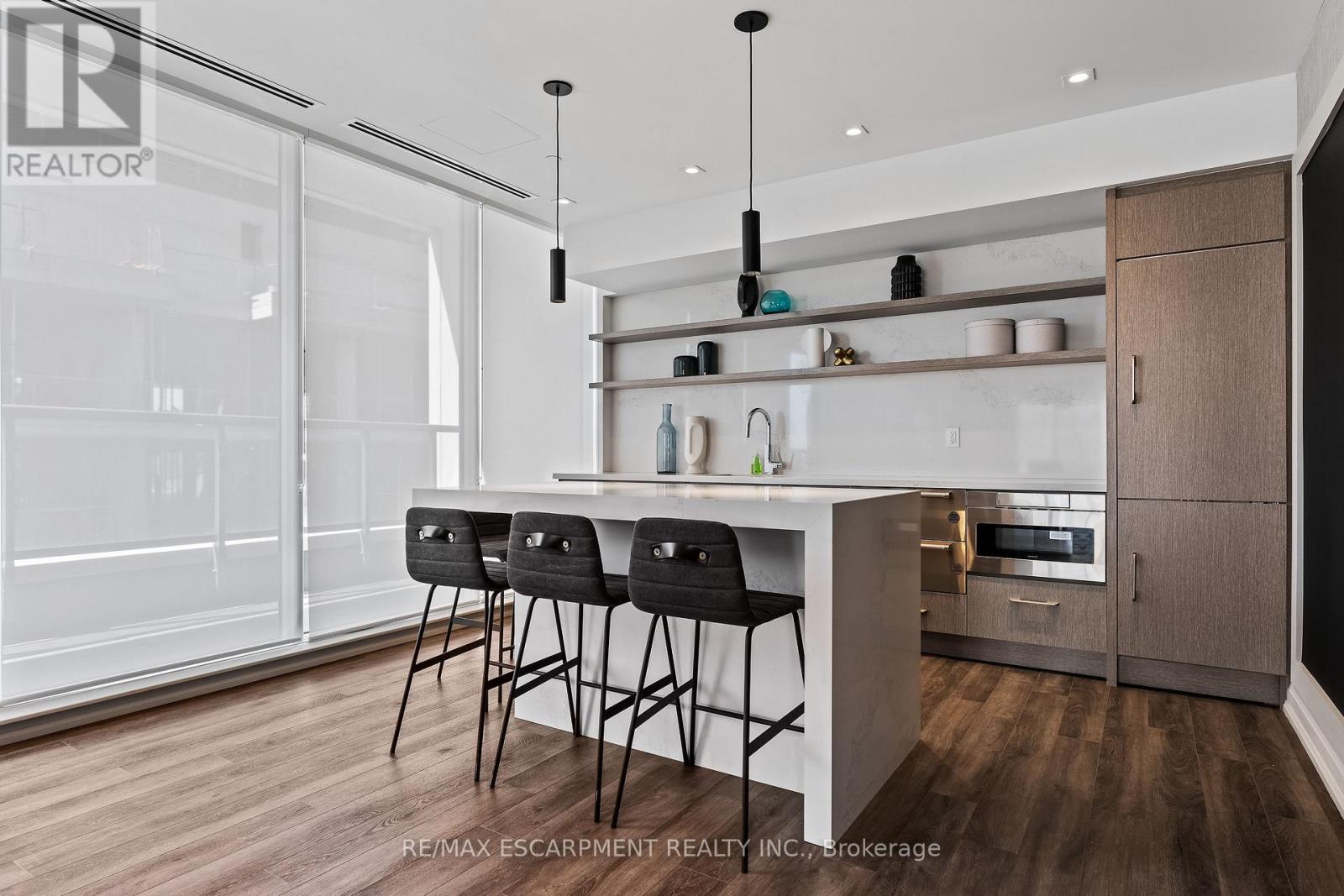 Beautiful, freshly painted 1+1 Bed condominium in walkable downtown Hamilton close to amenities. Fabulous Kings Cross model offers 658 square feet. Open kitchen with white cabinetry, backsplash and stainless steel appliances. Living room with walk out to incredible 100 square foot balcony. Desirable den for home office or entertainment space. Spacious primary bedroom and 4 piece bathroom. In-suite laundry, stainless steel appliances and owned locker for storage. Building amenities include roof top patio for entertaining and BBQ, party room, gym and a concierge. Ready to move in! You will love entertaining on the spectacular roof top! (id:4555)
