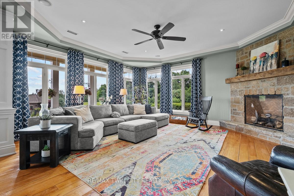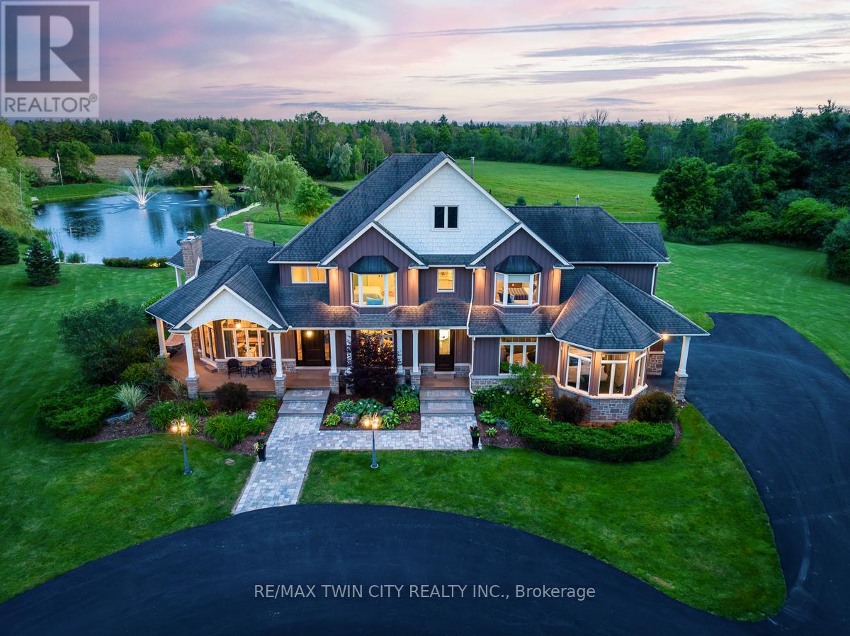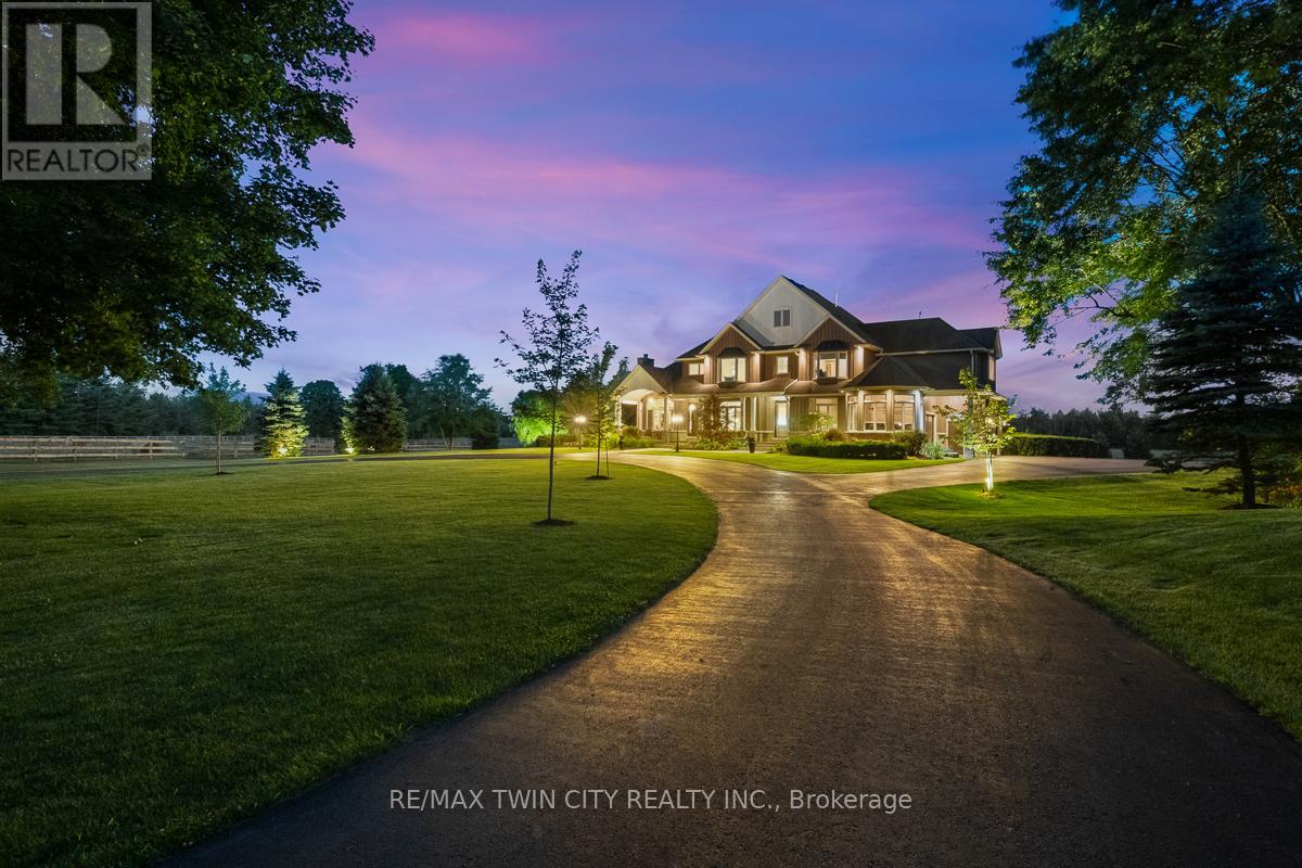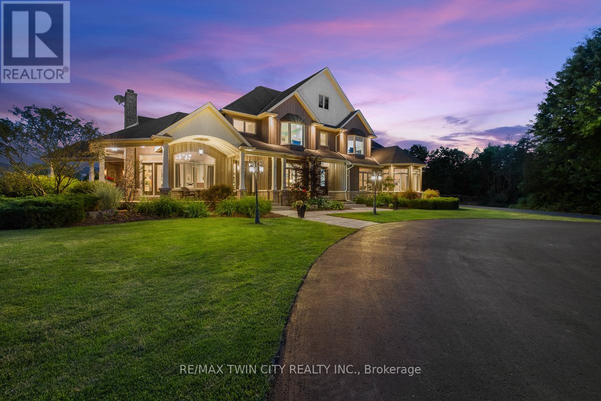 Scenic Flamborough is a part of southwestern Ontario known for farms and horse ranches. Located between Cambridge and Hamilton is this completely private, calendar book property on 90 acres. The home is set back from the main road with mature natural beauty as a buffer. A manicured tree line separates the driveway from the paddocks leading up to the home with approximately 15 acres of cultivable land, pastures, and gardens. The barn is suited for horses, complete with hydro, running water, four stalls, tack room, and massive hay loft. Attached to it is an oversized 3 bay garage providing space for utility vehicle storage and a workshop. In the centre of the property is a beautiful two story home at over 6800 square feet of finished space including the basement, with in-floor heating throughout the entire home and subdivided triple car garage. The board and batten/stone skirt exterior, wrap around porch, large windows, and soaring ceilings give the home its luxury farmhouse feel. It offers capacity for living and entertaining with 3 bedrooms plus a spa like primary suite, 6 bathrooms, beautiful living room with stunning fireplace, gourmet kitchen with butler pantry, and oversized dining room open to the nook and family room also featuring an elegant stone fireplace with timber mantel. The main floor office and laundry offer convenience. The basement was designed with recreation in mind offering a games room, wet bar and home theatre with surround sound and projection system. The basement level is also directly accessible from the garage via the second staircase. Relaxation extends to the outdoors with a backyard heated saltwater pool, 20' x 30' Muskoka room and wood burning stone fireplace and chimney. The views are gorgeous in every direction; to the south it overlooks a private acre pond complete with beach and aerating fountain, and behind it over 74 acres of forest with a 4 km network of trails for walking and riding. A truly stunning property! (id:4555)