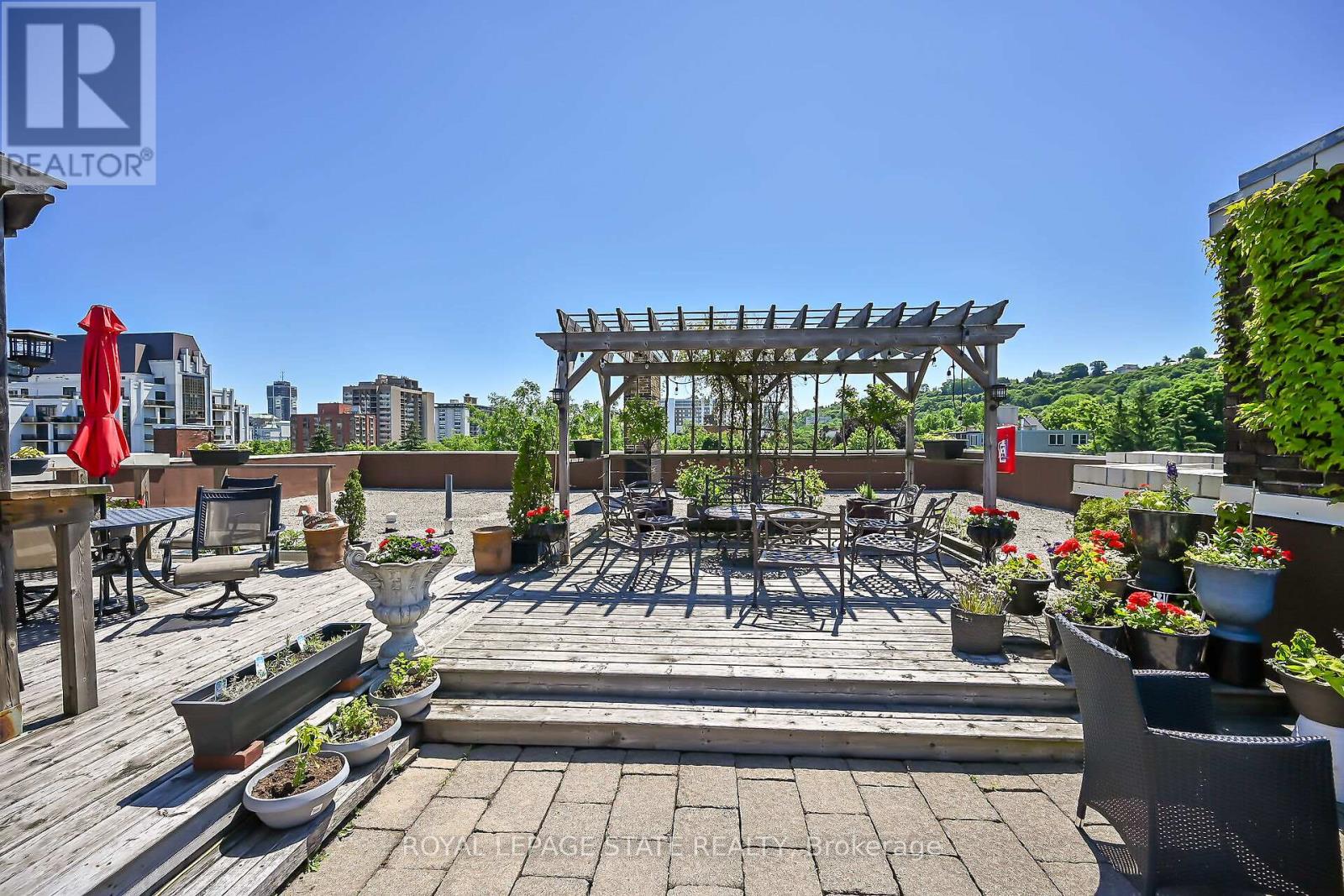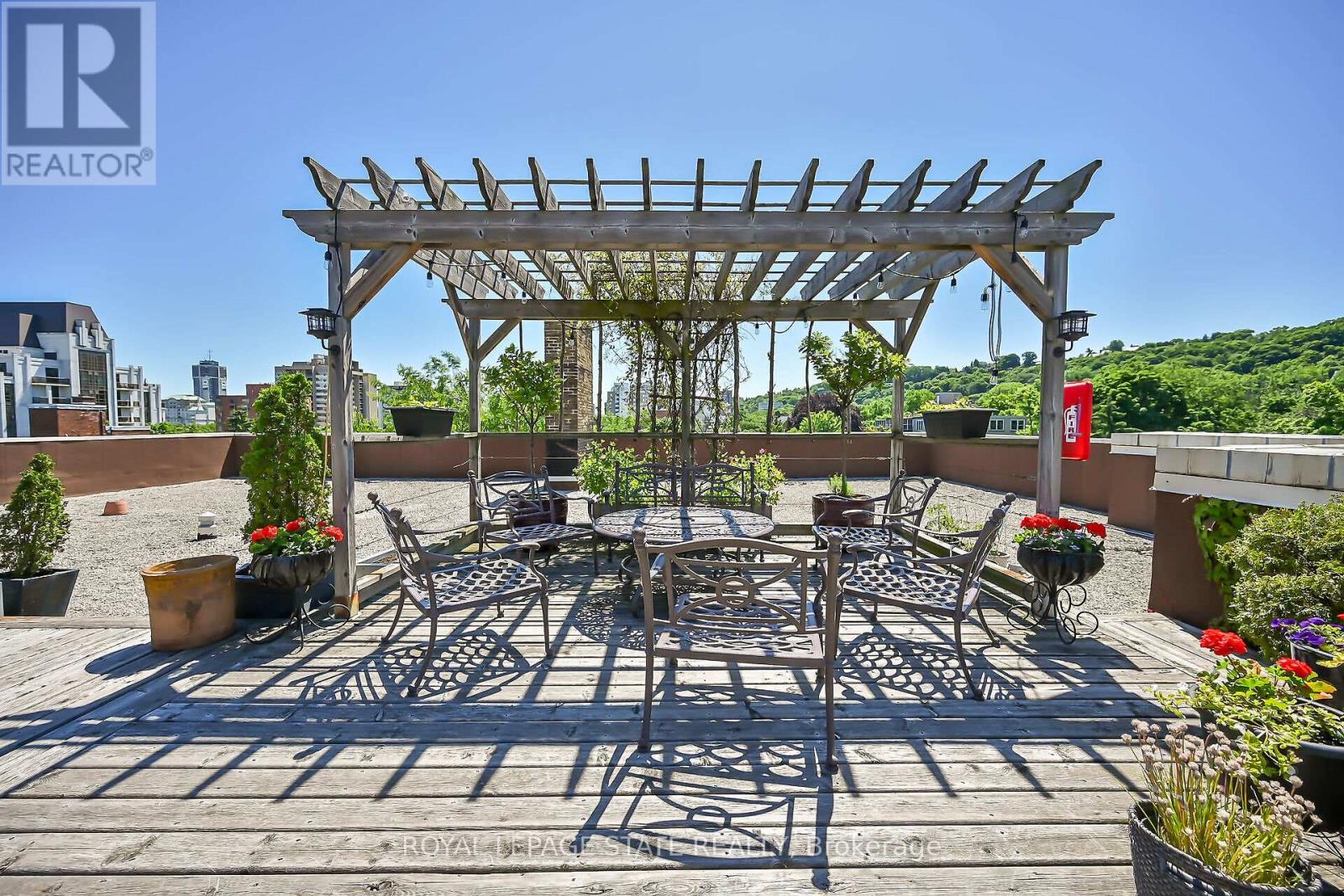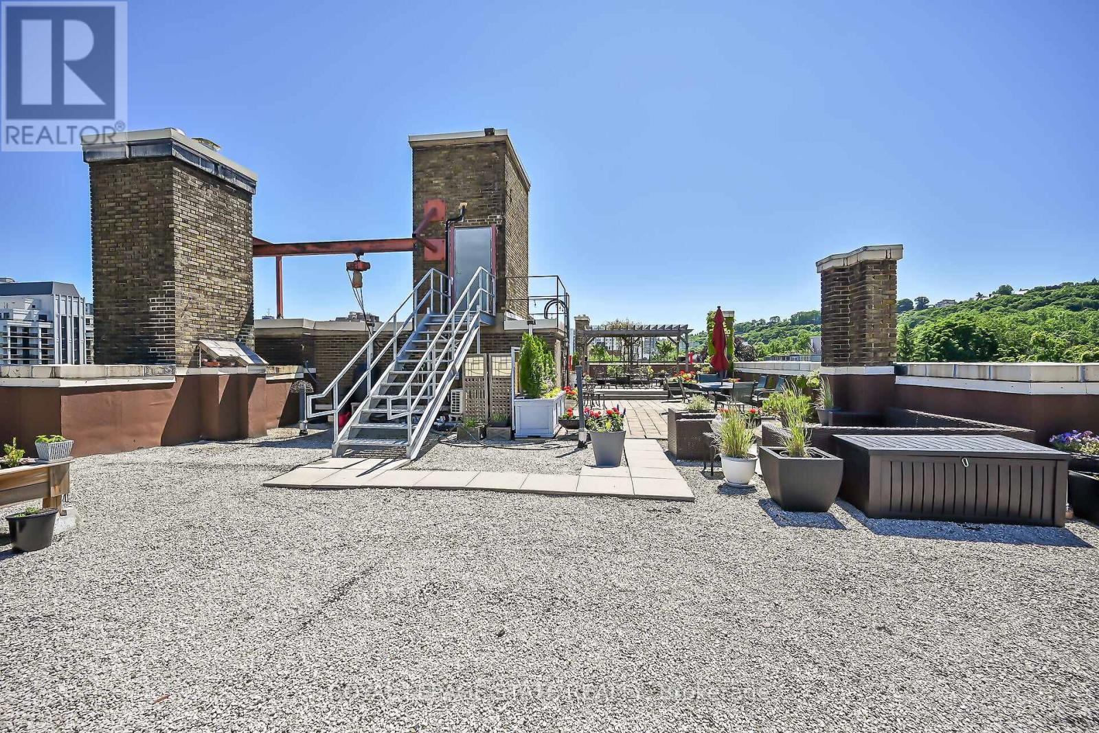 Rare Find! Welcome to this timeless penthouse in the Historic Herkimer Apartments! Located in the heart of Hamilton's prestigious Durand neighbourhood, this spectacular 2-bedroom, 1.5-bathroom condo blends historic elegance with modern convenience. This penthouse unit features inlaid hardwood floors, coffered 10' ceilings, crown mouldings, pot lights, and a gas fireplace in the living room with built-in cabinetry. The open-concept kitchen boasts granite counters, an island with breakfast bar, and abundant cabinetry. Enjoy the 3 piece jacuzzi shower, in-suite laundry, and two separate entrances for added flexibility. Relax in the sunroom with breathtaking views of the Niagara Escarpment, through oversized windows, or entertain on the rooftop deck and terrace available to residents. Including in the terrace breathtaking city views, are sitting areas, gas bbq and gas fire table under a large gazebo. For added peace of mind, the in unit Furnace and Air-conditioning has been replaced in November 2025. Includes garage parking, locker, and all the charm of a historic building with the modern lifestyle of today. Don't miss this rare opportunity to own a piece of architectural history in one of Hamilton's finest neighborhood's! RSA (id:4555)