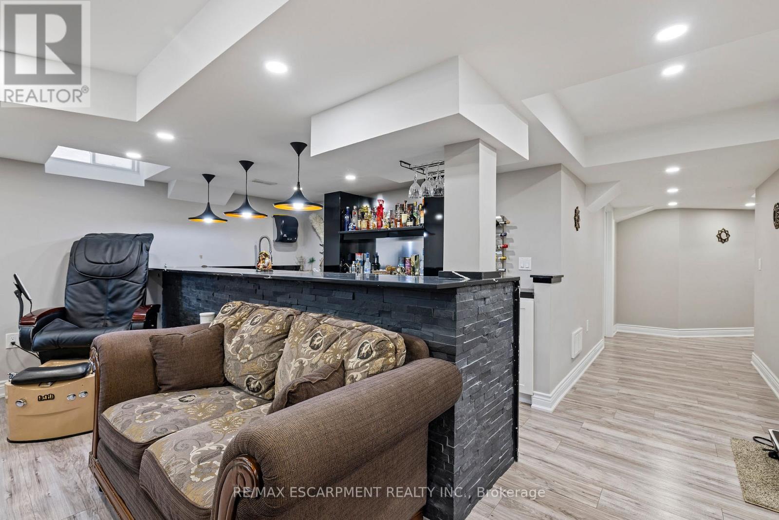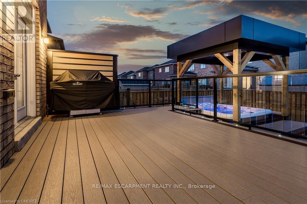 Welcome to 114 Chaumont Dr and step into refined living in this beautifully appointed Stoney Creek Mountain home, offering soaring 9-foot ceilings, and impressive grand foyer, main-floor laundry, and a convenient separate entrance for In-Law Potential. Rich hardwood floors, California shutters, and in-ceiling speakers complement the thoughtfully designed layout, featuring separate living and dining spaces, a gas fireplace, and a bright open-concept kitchen with a breakfast bar, quartz countertops, designer stone backsplash, premium appliances, and a French door walkout to the backyard, all filled with an abundance of natural light. The second level offers four generously sized bedrooms and two full bathrooms, including a Jack-and-Jill layout, while the spacious primary suite features a walk-in closet and a luxurious five-piece ensuite. The finished basement, complete with a separate entrance, is designed for entertaining and relaxation, showcasing a large recreation area, custom stone wet bar with built-in wine cooler, sleek quartz countertops, a striking stone feature wall, an electric fireplace, and pot lighting throughout. Outside, enjoy an expertly crafted composite deck with gas BBQ hookup, a custom cabana, and a stunning illuminated hot tub for year-round hosting and enjoyment. Ideally located in the heart of Stoney Creek Mountain, just minutes from top-rated schools, parks, shopping, and quick highway access, this exceptional home is a must-see! (id:4555)