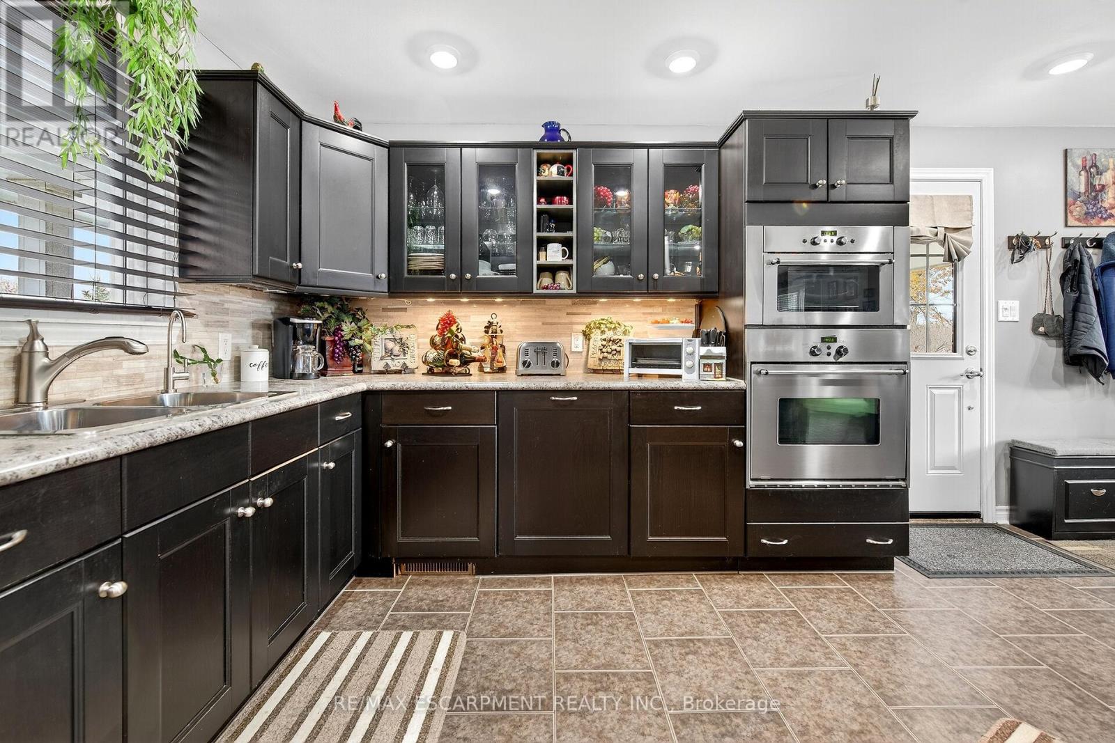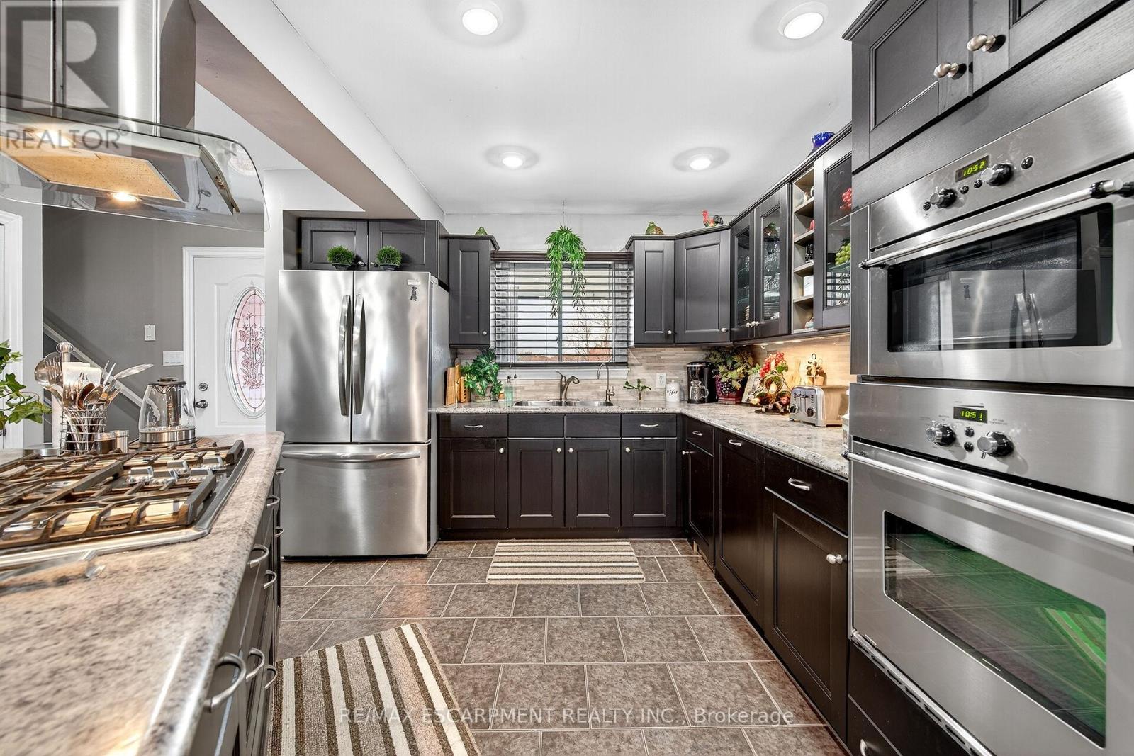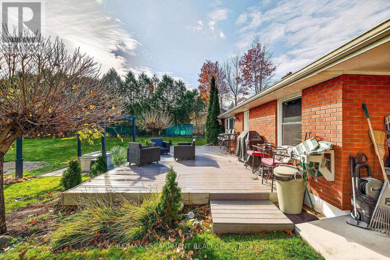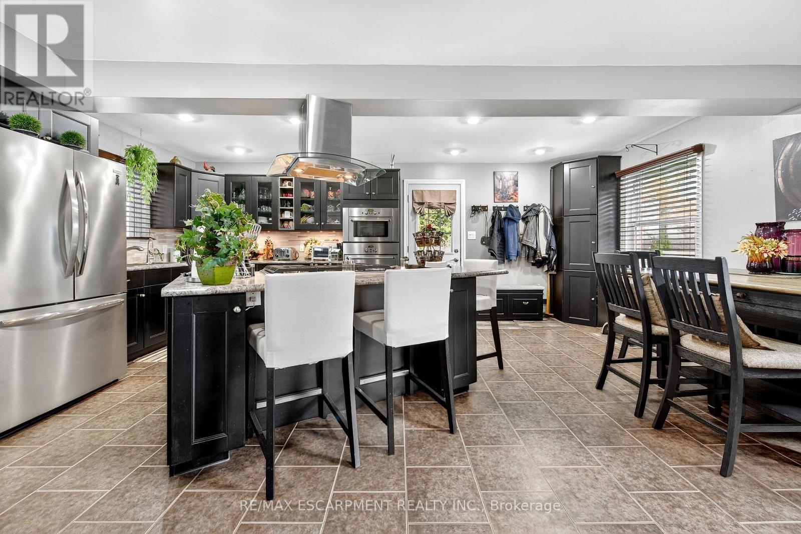 Beautifully presented, Exquisitely updated 3 bedroom, 2 bathroom Sidesplit situated on picturesque 100' x 218' mature lot on sought after Trinity Church Rd. Great curb appeal with all brick exterior, welcoming front walkway leading to covered porch, attached car port, tastefully landscaped, & entertainers dream back yard with recently updated composite deck overlooking calming country views. The flowing interior layout features close to 2000 sq ft of well designed living space highlighted by gourmet kitchen with oversized eat at island, S/S appliances, tile flooring, & backsplash, formal dining area leading to patio, spacious living room, 2 large upper level bedrooms, & updated primary 4 pc bathroom. The finished basement includes rec room, 3rd bedroom, additional 3 pc bathroom, laundry room, & storage area. Conveniently located minutes to Hamilton amenities, restaurants, shopping, schools, parks, & easy access to Red Hill, Linc, QEW, & 403. Upgrades throughout include modern decor, flooring, & fixtures, kitchen, decking, roof shingles - 2019, hi eff N/Gas furnace & A/C. Rarely do properties in this location come available for sale in the price range! Perfect home for all walk of life. Shows well - Just move in & Enjoy! Experience Hannon Country Living at its Finest! (id:4555)