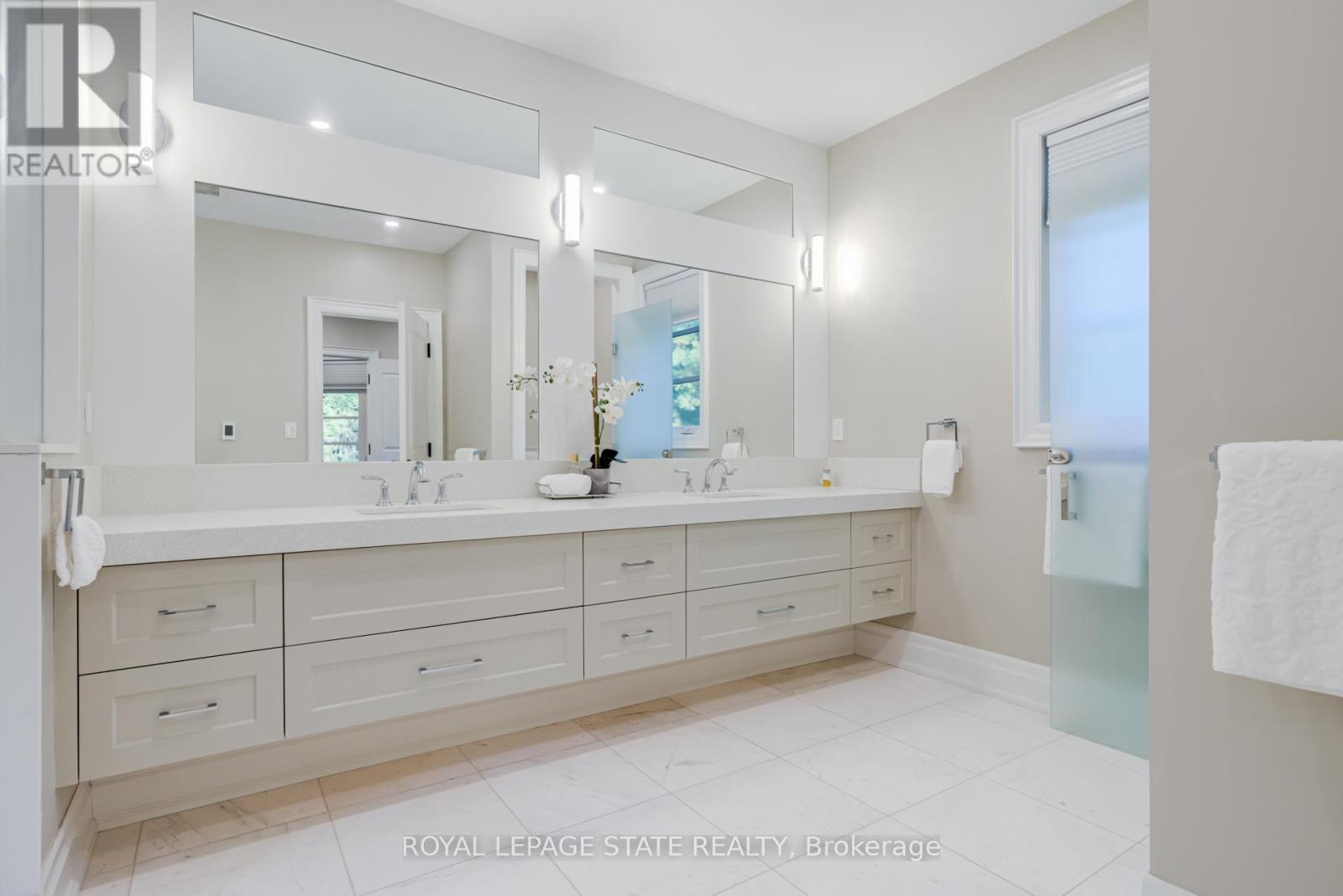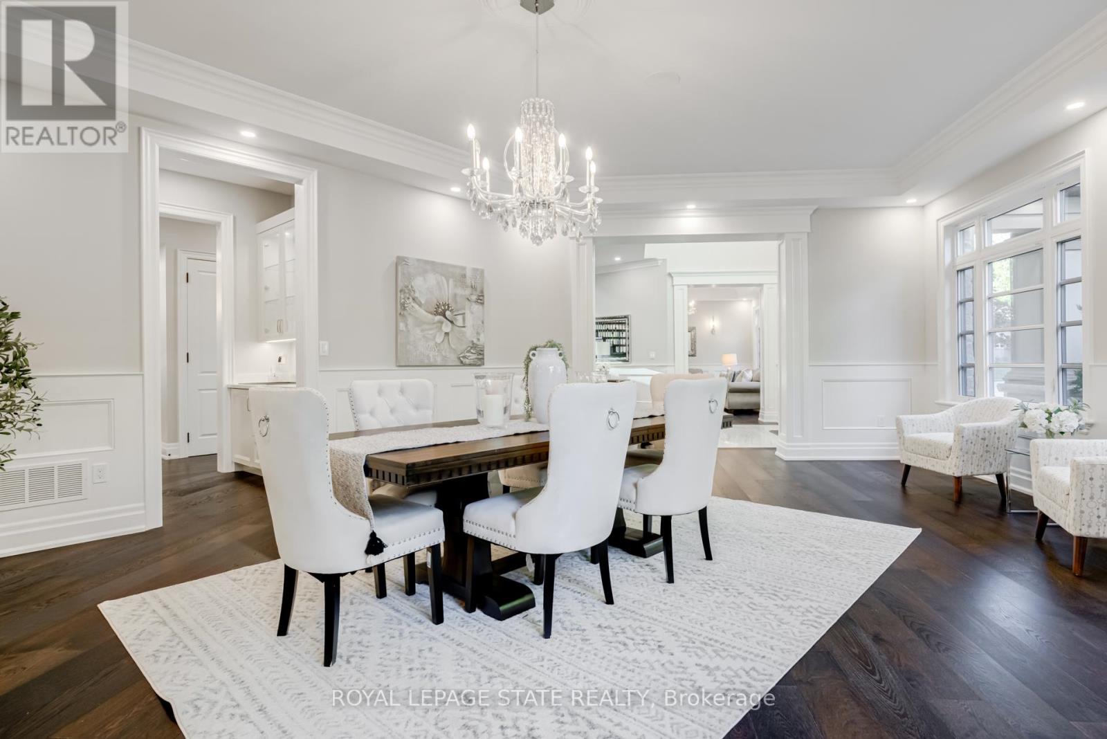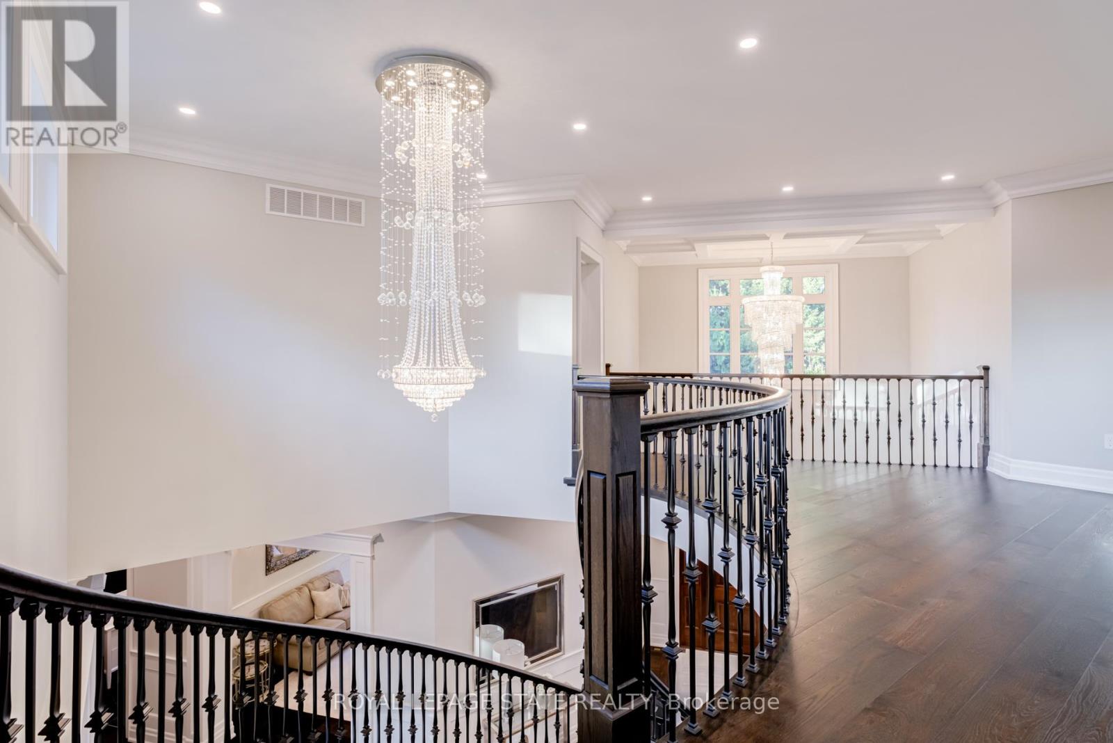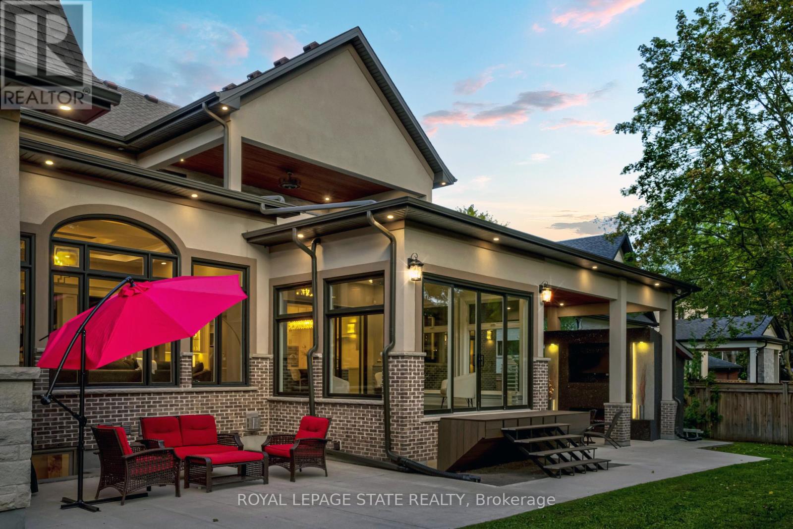 This multi-generational luxury dream home blends timeless design with superior craftsmanship, offering over 8,850 sqft. of finished living space with 7 bedrooms and 8 bathrooms on a 135-ft-wide lot in Ancasters prestigious Oakhill neighbourhood. Surrounded by mature trees and estate homes, the property showcases two separate garages, parking for 20+ vehicles, professional landscaping, and a commanding architectural façade. Inside, a 21-ft grand foyer with curved staircase and custom millwork sets an elegant tone, complemented by wide-plank hardwood, porcelain tile, and abundant natural light from oversized windows. The main level offers formal living and dining rooms, a private office, powder room, and one of two primary suites with backyard walk-out. At the heart of the home, a soaring family room with floor-to-ceiling windows connects to a gourmet kitchen featuring top-tier Thermador appliances, a servery, walk-in pantry, and a heated four-season sunroom with in-floor heating. Upstairs are four generous bedrooms, each with its own ensuite and heated floors, plus a convenient laundry room and a spectacular primary retreat with gas fireplace, dressing room, and spa-inspired 6-pc ensuite. A covered terrace with artificial turf extends the living space outdoors. The finished lower level offers incredible versatility for extended family living with a separate entrance, two bedrooms, two bathrooms, recreation room with gas fireplace, kitchenette, and a sound-isolated home theatre room that can be separated from the rest of the basement. The private backyard provides multiple patios under mature trees, with professional renderings available for a future pool, hot tub, and full landscaping. Smart-home features include Control4 automation, security system, 400-amp, dual furnaces & ACs, HRVs, and central vacuum with hide-a-hoses. A rare opportunity to own an Oakhill estate that combines sophistication, space, and modern functionality for todays luxury lifestyle. (id:4555)