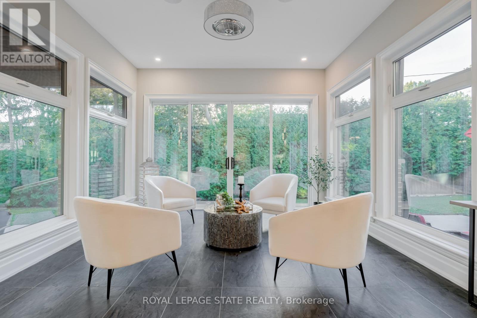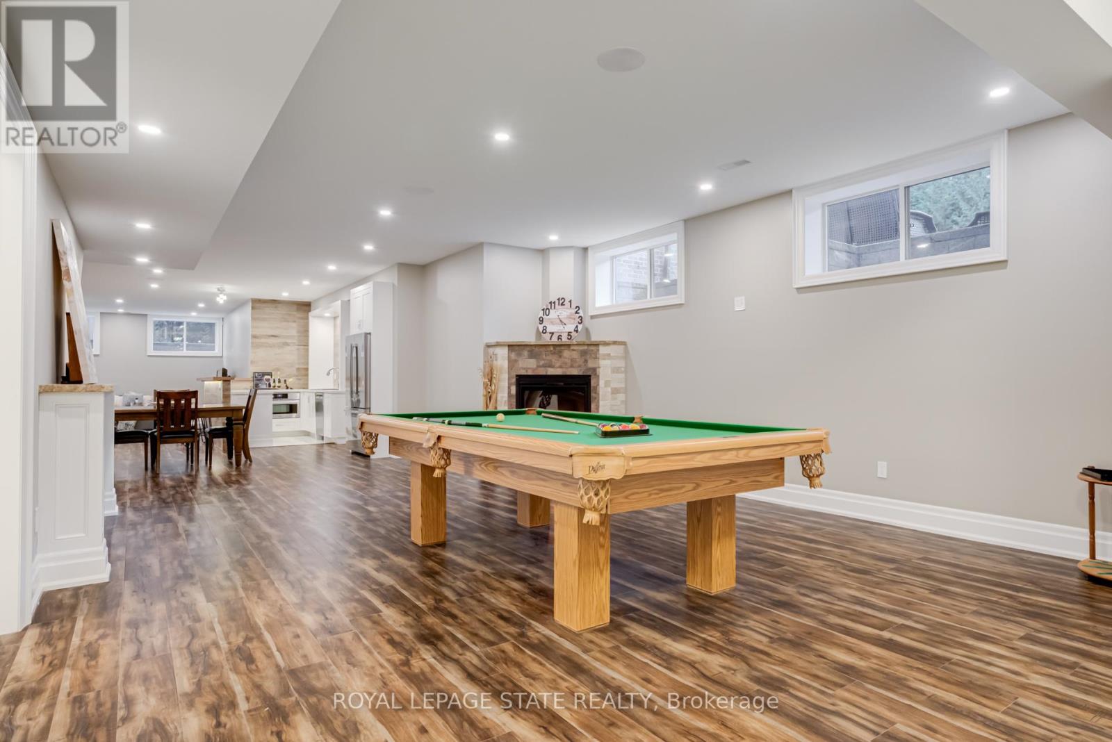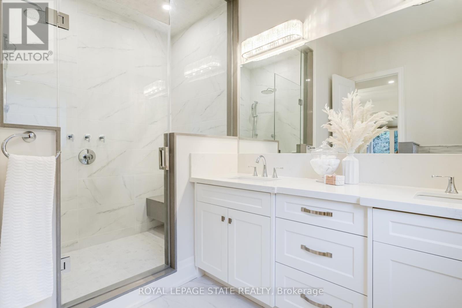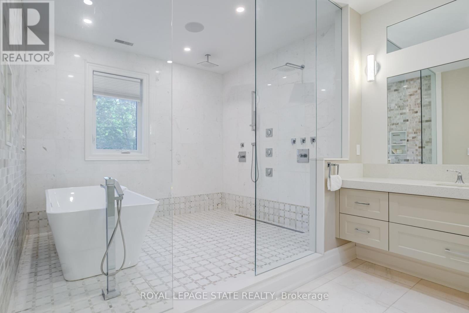This multi-generational luxury dream home blends timeless design with superior craftsmanship, offering over 8,850 sqft. of finished living space with 7 bedrooms and 8 bathrooms on a 135-ft-wide lot in Ancasters prestigious Oakhill neighbourhood. Surrounded by mature trees and estate homes, the property showcases two separate garages, parking for 20+ vehicles, professional landscaping, and a commanding architectural façade. Inside, a 21-ft grand foyer with curved staircase and custom millwork sets an elegant tone, complemented by wide-plank hardwood, porcelain tile, and abundant natural light from oversized windows. The main level offers formal living and dining rooms, a private office, powder room, and one of two primary suites with backyard walk-out. At the heart of the home, a soaring family room with floor-to-ceiling windows connects to a gourmet kitchen featuring top-tier Thermador appliances, a servery, walk-in pantry, and a heated four-season sunroom with in-floor heating. Upstairs are four generous bedrooms, each with its own ensuite and heated floors, plus a convenient laundry room and a spectacular primary retreat with gas fireplace, dressing room, and spa-inspired 6-pc ensuite. A covered terrace with artificial turf extends the living space outdoors. The finished lower level offers incredible versatility for extended family living with a separate entrance, two bedrooms, two bathrooms, recreation room with gas fireplace, kitchenette, and a sound-isolated home theatre room that can be separated from the rest of the basement. The private backyard provides multiple patios under mature trees, with professional renderings available for a future pool, hot tub, and full landscaping. Smart-home features include Control4 automation, security system, 400-amp, dual furnaces & ACs, HRVs, and central vacuum with hide-a-hoses. A rare opportunity to own an Oakhill estate that combines sophistication, space, and modern functionality for todays luxury lifestyle. (id:4555)