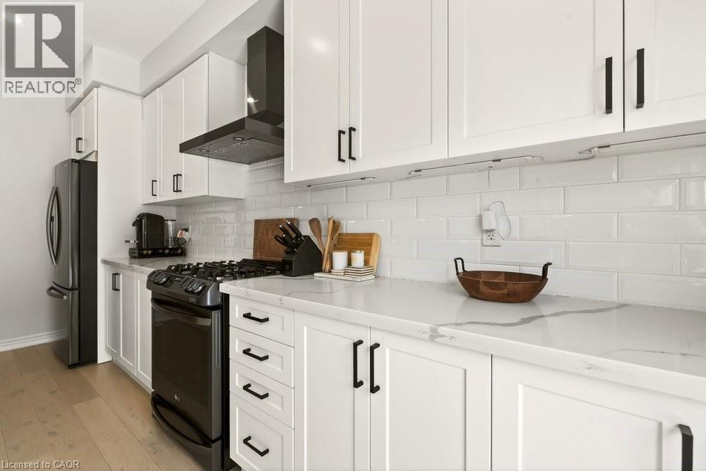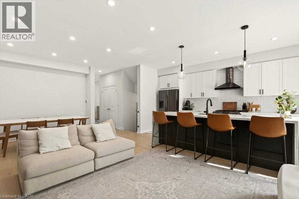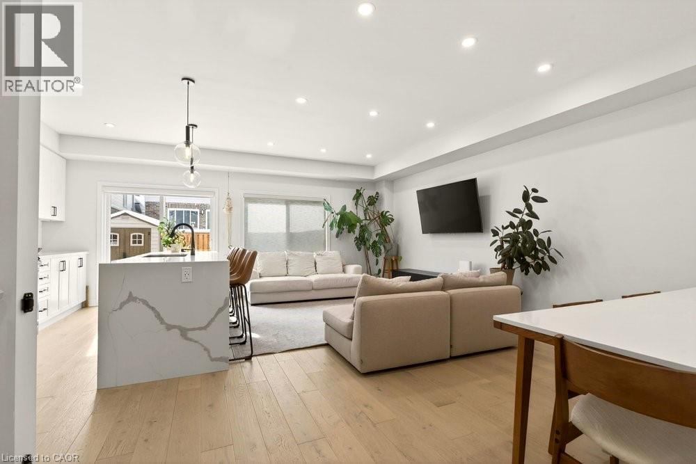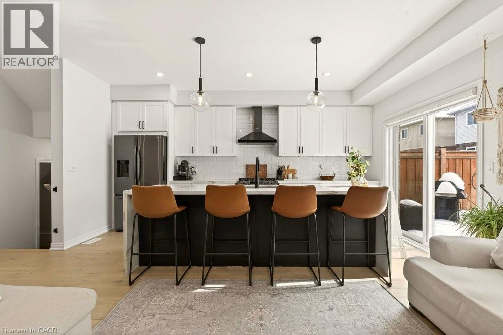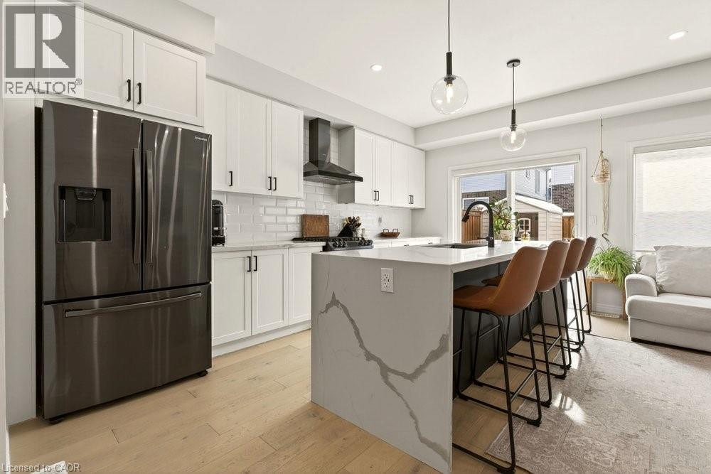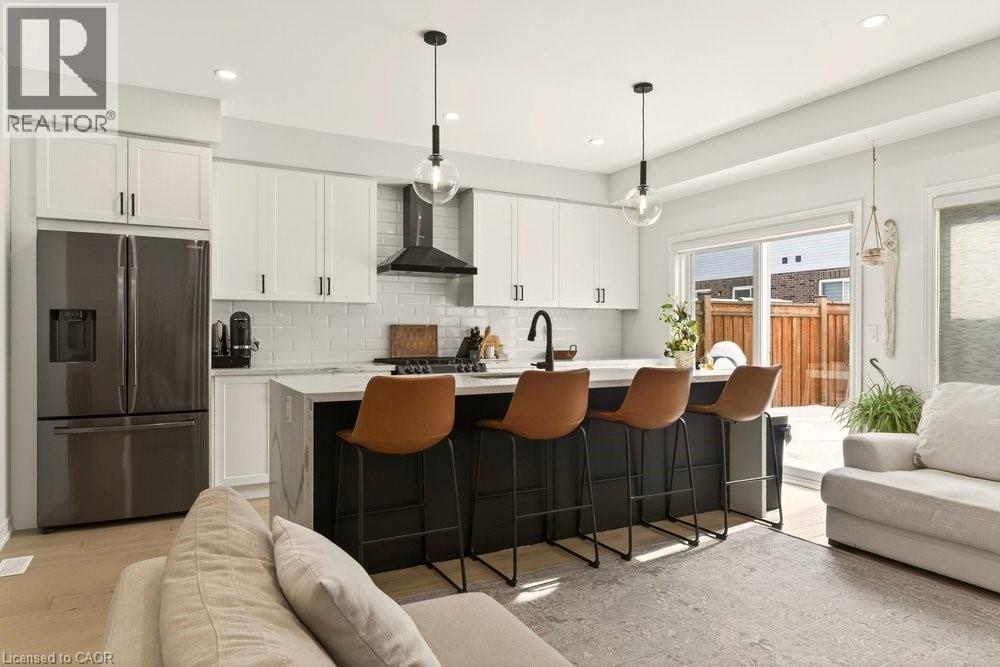Built in 2020 by Dicenzo Homes and offering over $50,000 in thoughtful upgrades and updates this stunning 4-bedroom, 4-bathroom semi-detached home is located in a welcoming, family-friendly community on Hamilton Mountain. With a finished basement, fenced yard, and modern finishes throughout, this home is ideal for families and professionals alike. Enjoy convenient inside entry from the single garage and private driveway. Step into the inviting foyer and immediately appreciate the upgraded flooring and staircase, along with a conveniently located 2-piece powder room. Natural light fills the open-concept main floor, highlighting the beautifully upgraded kitchen — truly the heart of the home. Features include extended cabinetry, black stainless steel appliances with a gas stove, an oversized quartz waterfall island, upgraded undermount sink and faucet, and plenty of prep and gathering space. Upgraded hardwood floors flow seamlessly through the kitchen, living, and dining areas, complemented by pot lights and double sliding glass doors leading to your private, fully fenced backyard. The concrete patio and gazebo create the perfect setting for outdoor relaxation or entertaining. Upstairs, upgraded hardwood continues through the hallway, leading to four generously sized bedrooms with large closets and cozy carpeting. The spacious primary retreat features a walk-in closet and a stylish ensuite bath complete with a glass shower. The finished lower level expands your living space with a large recreation room, laundry area, ample storage, and a 3-piece bathroom with glass shower — ideal for guests, teens, or a home office setup. 200-amp electrical panel. Centrally located just minutes from l the LINC, with access to the 403 and Red Hill Parkway this home is close to public transit, schools, parks, and shopping. Don’t miss this opportunity! Some photos virtually staged. (id:4555)