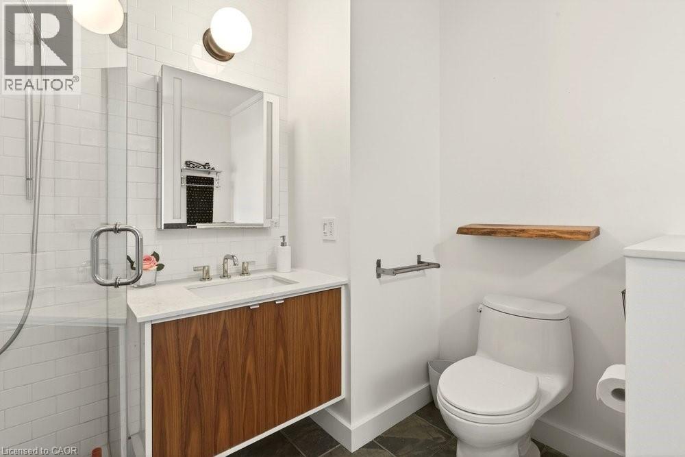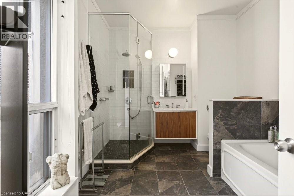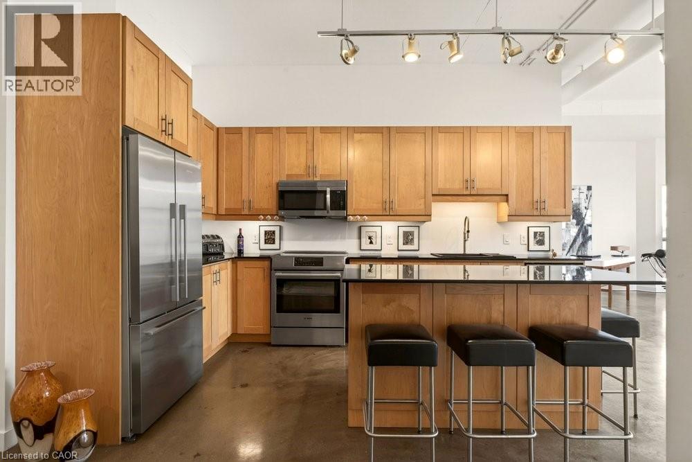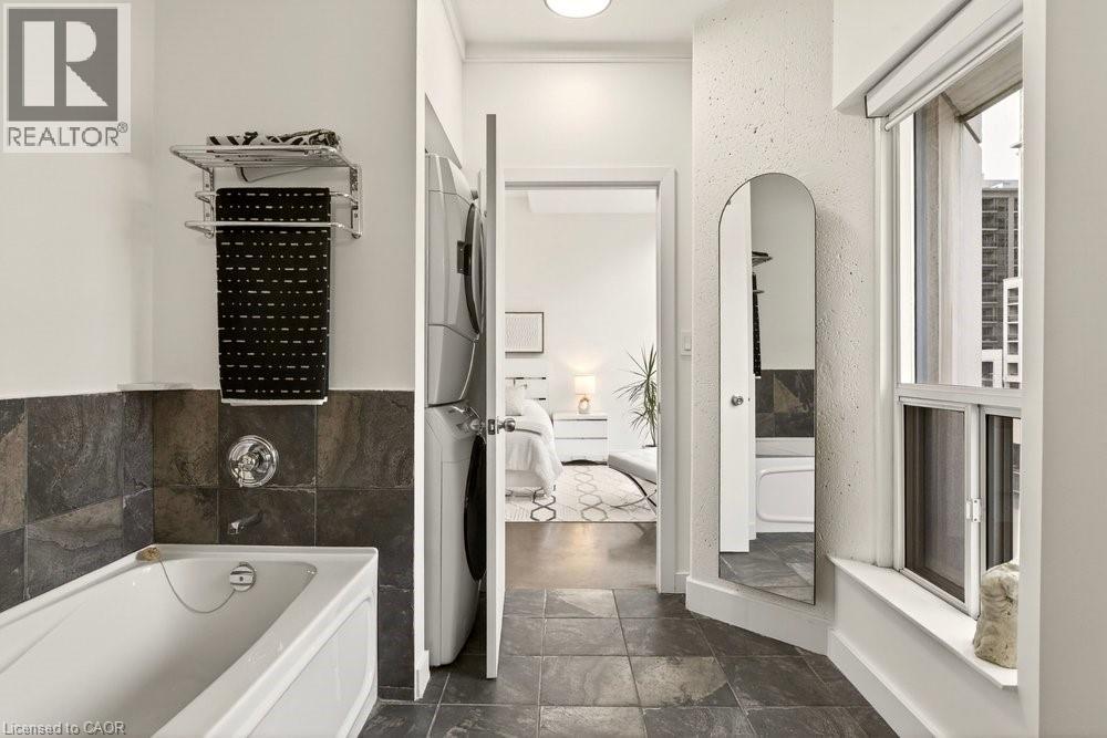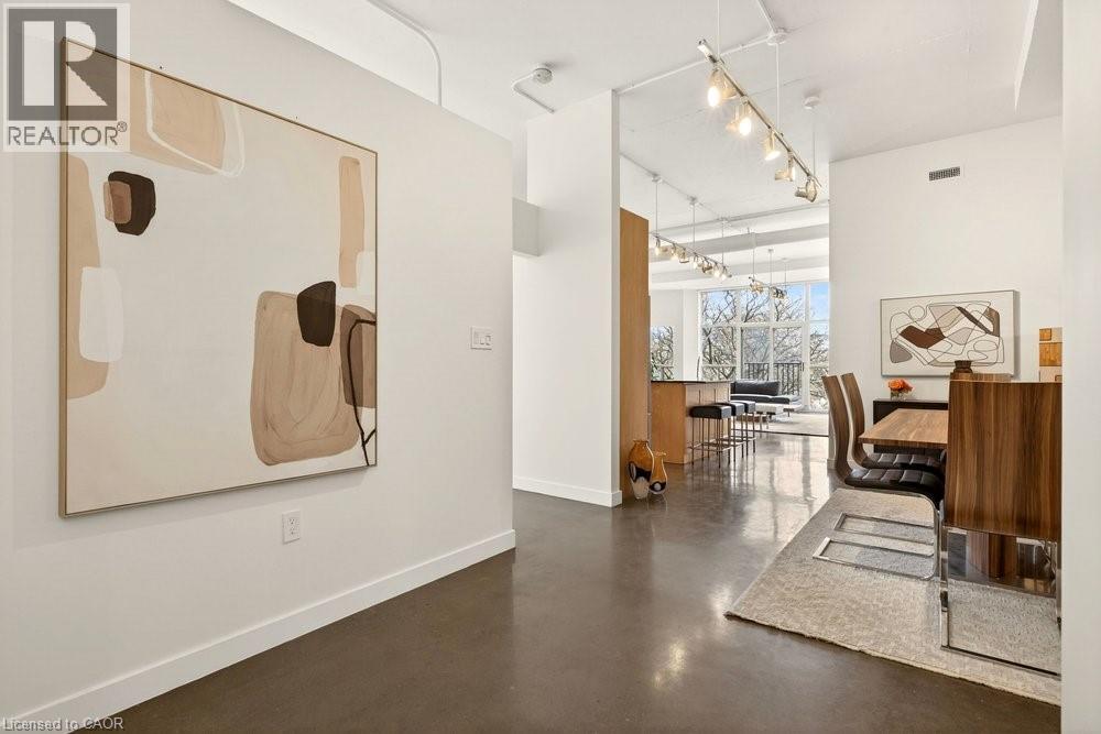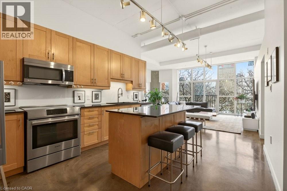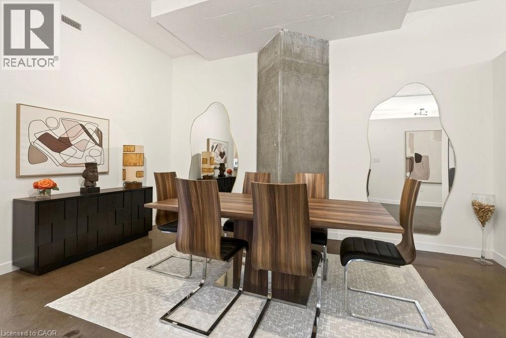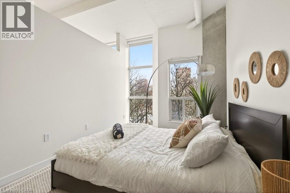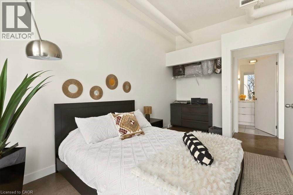 Welcome to Unit 401 at Core Lofts – a stunning corner suite in the heart of downtown Hamilton. Offering just over 1,500 sq ft of open-concept living space, this 2 bedroom, 2 bathroom loft combines industrial character with modern comfort. Featuring 10+ foot ceilings, polished concrete floors, and expansive floor-to-ceiling windows with desirable east and north exposures, this bright and airy unit is flooded with natural light. The spacious kitchen is equipped with granite countertops, stainless steel appliances, and a large island with granite surface, ideal for entertaining. The primary bedroom features floor-to-ceiling windows with custom window coverings and a beautifully appointed ensuite complete with a stand-up shower and soaker tub. The second bedroom offers flexibility for guests, office space, or additional living needs. The unit is tastefully decorated and can be purchased fully furnished. One parking space and a storage locker are included. Building amenities including a gym, meeting/party room, and a rooftop terrace with BBQs and seating areas. Located steps to Hess Street, Locke Street, King William dining district, Jackson Square, and the new TD Coliseum. Enjoy easy access to restaurants, cafés, shopping, entertainment, Bayfront Park, GO Transit, and major highway access. Experience convenient downtown living in one of Hamilton’s most desirable loft buildings. (id:4555)