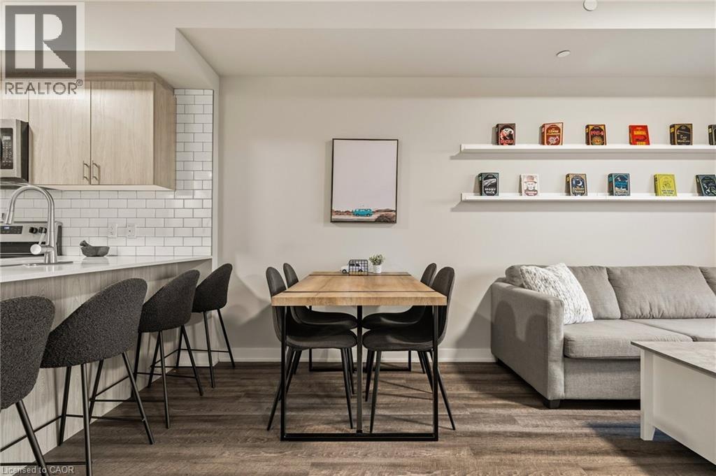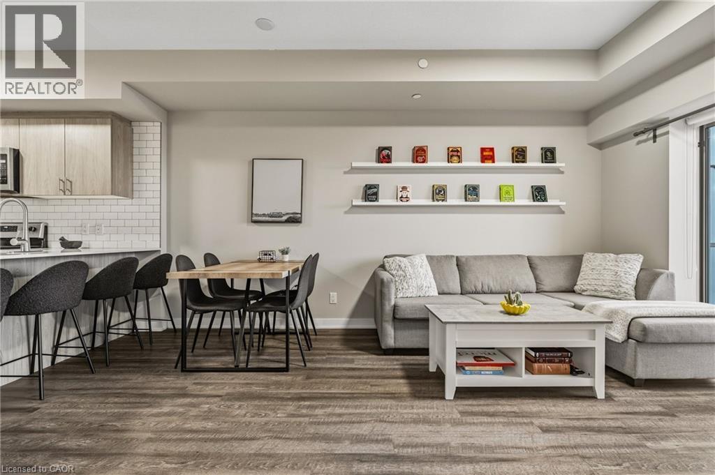 Step into elevated living in this recently built, beautifully appointed and fully furnished condo in a fantastic Ancaster community. Designed with style and comfort in mind, this 1-bedroom, 1.5-bath suite delivers the perfect blend of modern luxury and everyday ease. The open-concept layout feels airy and inviting, anchored by a stunning chef-inspired kitchen featuring sleek stainless steel appliances, quartz countertops, subway tile backsplash, contemporary cabinetry, and a generous breakfast bar made for casual mornings or hosting friends. Soaring 9-foot ceilings and expansive windows flood the living space with natural light, creating a bright, sophisticated atmosphere throughout. The primary retreat is a true standout, complete with a large picture window, a spa-like ensuite, and a walk-in closet outfitted with a custom organization system. In-suite laundry adds everyday convenience, while your private balcony offers the perfect spot to unwind and catch sunset views. Enjoy a carefree lifestyle with exceptional building amenities, including a fully equipped fitness centre, dedicated yoga studio, and an impressive party room with full kitchen that opens onto a landscaped terrace featuring BBQs and cozy gas fire tables. Underground parking, a private locker, and access to two EV charging stations add even more value. Ideally located just minutes from shopping, dining, trails, community centres, and only a short drive to McMaster and Redeemer University, this upgraded, move-in-ready condo is your opportunity to enjoy refined, maintenance-free living from day one. (id:4555)