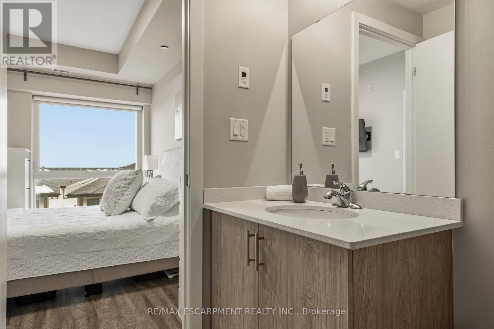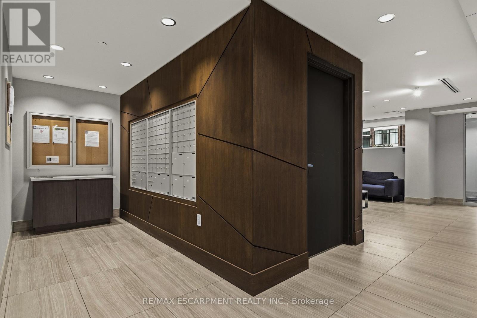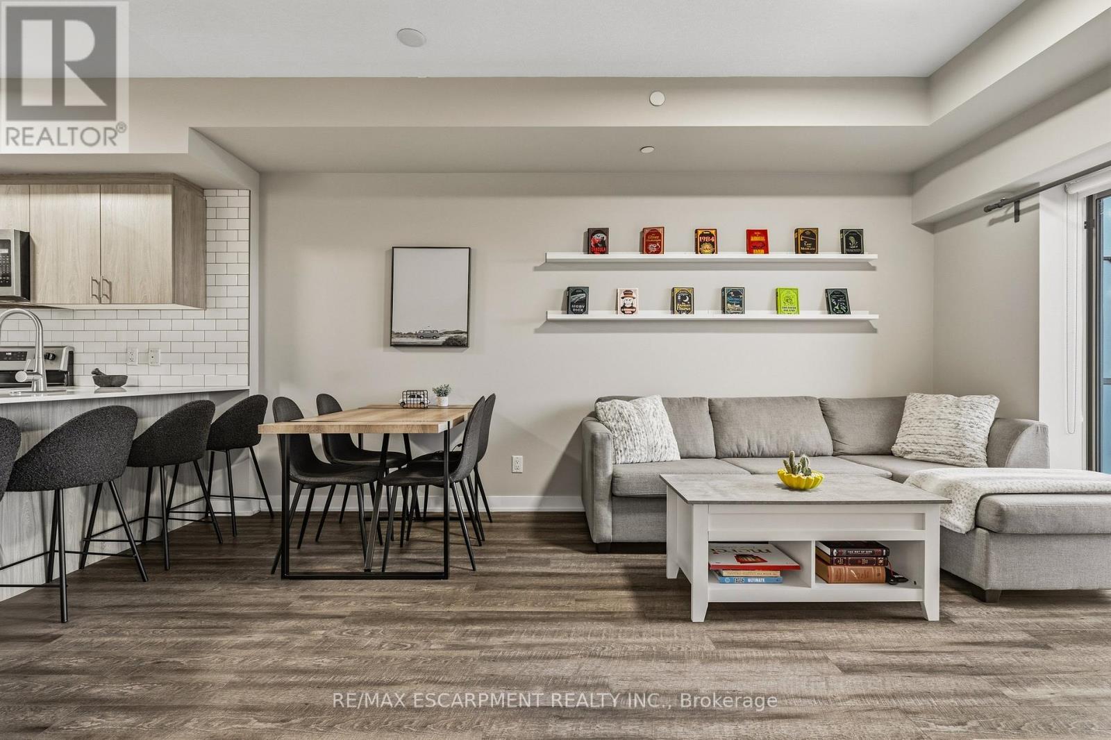 Step into elevated living in this recently built, beautifully appointed condo in a fantastic Ancaster community. Designed with style and comfort in mind, this 1-bedroom, 1.5-bath suite delivers the perfect blend of modern luxury and everyday ease. The open-concept layout feels airy and inviting, anchored by a stunning chef-inspired kitchen featuring sleek stainless steel appliances, quartz countertops, subway tile backsplash, contemporary cabinetry, and a generous breakfast bar made for casual mornings or hosting friends. Soaring 9-foot ceilings and expansive windows flood the living space with natural light, creating a bright, sophisticated atmosphere throughout. The primary retreat is a true standout, complete with a large picture window, a spa-like ensuite, and a walk-in closet outfitted with a custom organization system. In-suite laundry adds everyday convenience, while your private balcony offers the perfect spot to unwind and catch sunset views. Enjoy a carefree lifestyle with exceptional building amenities, including a fully equipped fitness centre, dedicated yoga studio, and an impressive party room with full kitchen that opens onto a landscaped terrace featuring BBQs and cozy gas fire tables. Underground parking, a private locker, and access to two EV charging stations add even more value. Ideally located just minutes from shopping, dining, trails, community centres, and only a short drive to McMaster and Redeemer University, this upgraded, move-in-ready condo is your opportunity to enjoy refined, maintenance-free living from day one. (id:4555)