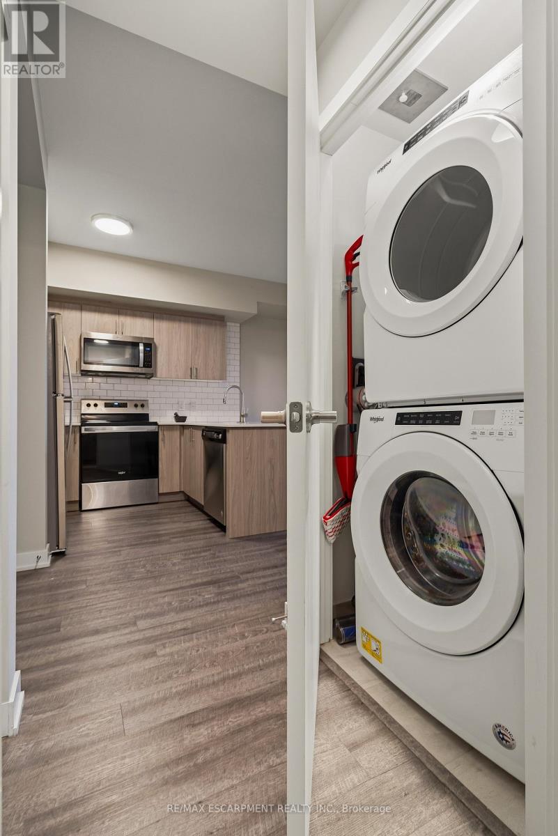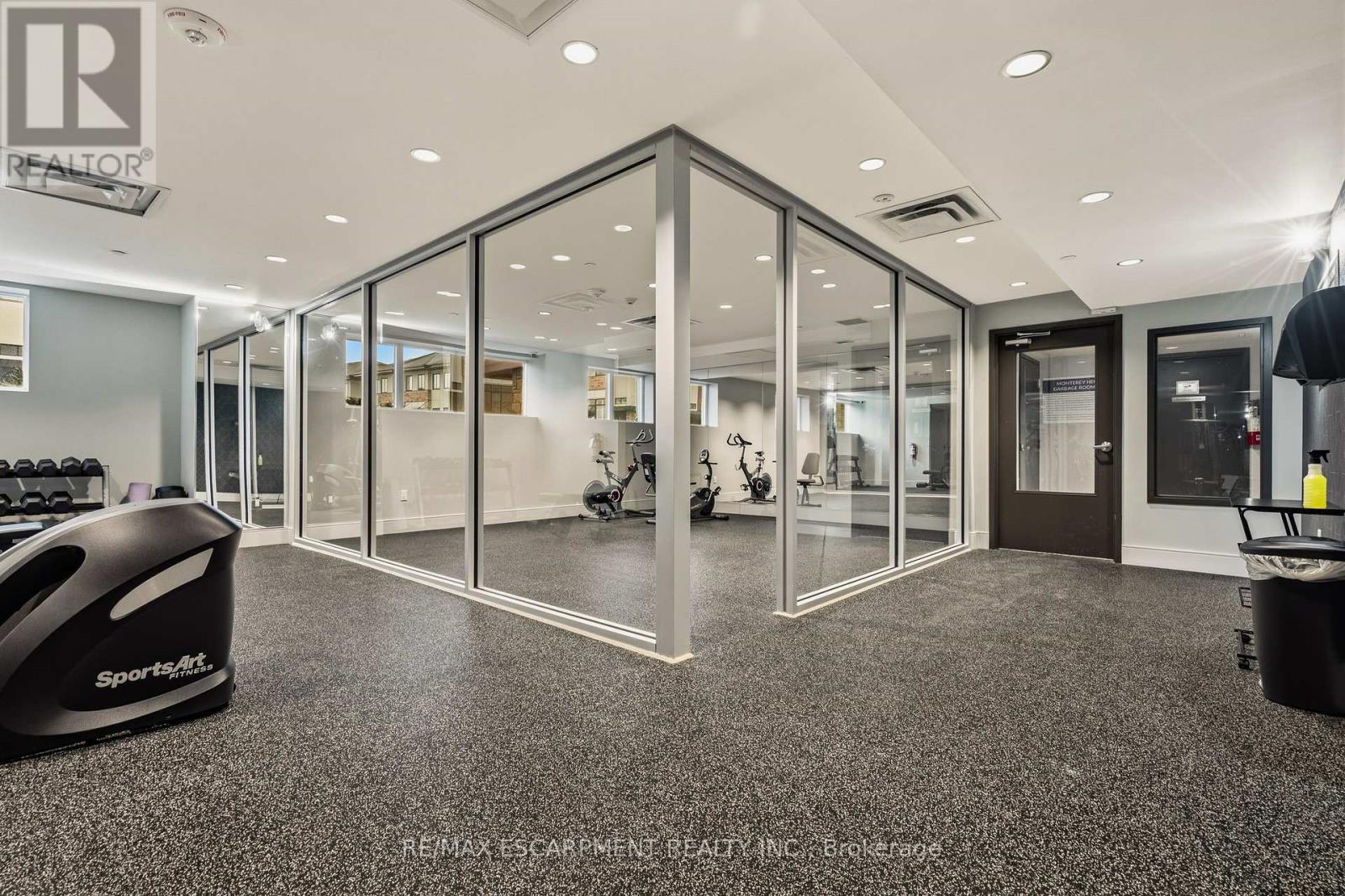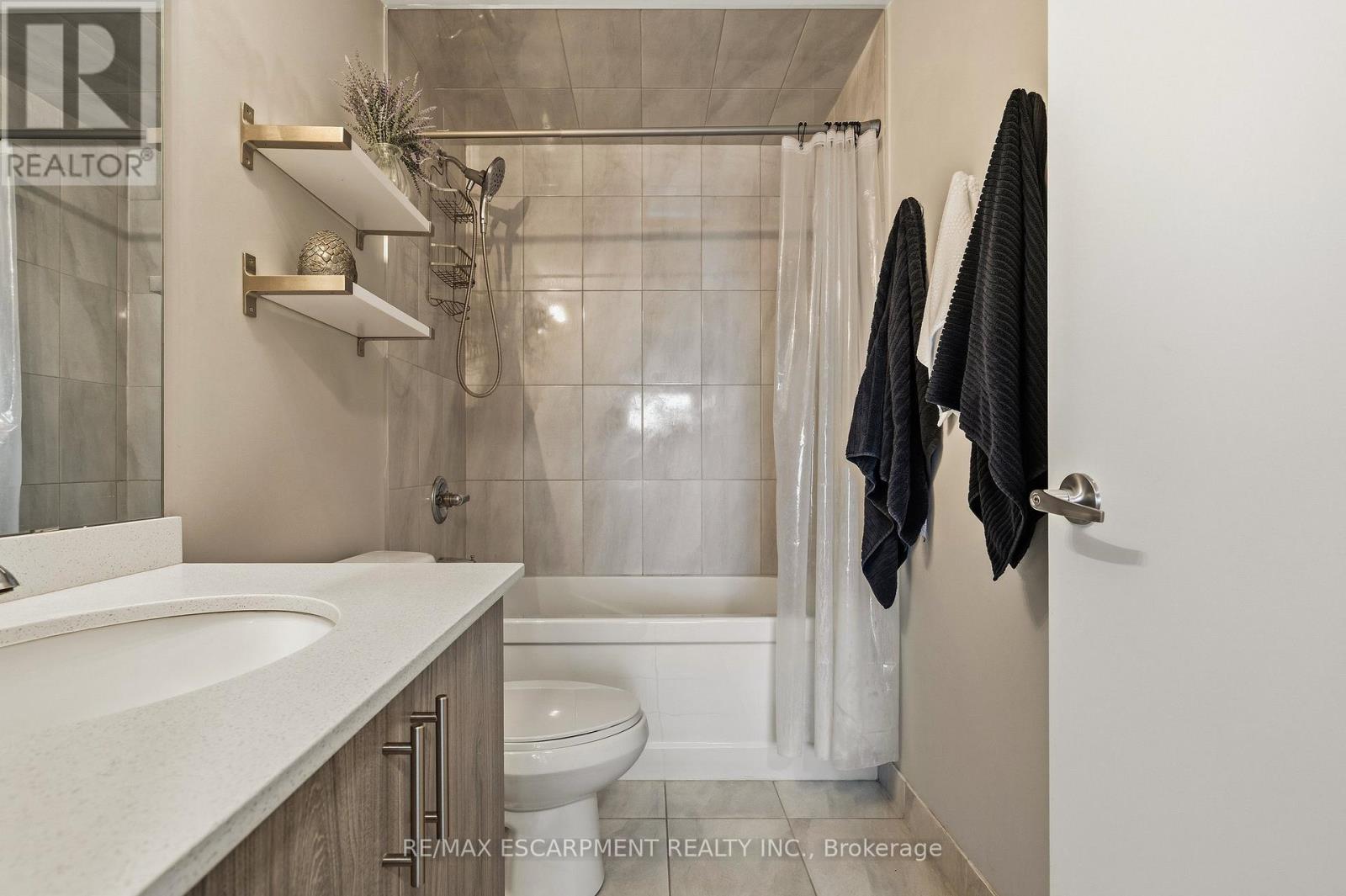 Step into elevated living in this recently built, beautifully appointed condo in a fantastic Ancaster community. Designed with style and comfort in mind, this 1-bedroom, 1.5-bath suite delivers the perfect blend of modern luxury and everyday ease. The open-concept layout feels airy and inviting, anchored by a stunning chef-inspired kitchen featuring sleek stainless steel appliances, quartz countertops, subway tile backsplash, contemporary cabinetry, and a generous breakfast bar made for casual mornings or hosting friends. Soaring 9-foot ceilings and expansive windows flood the living space with natural light, creating a bright, sophisticated atmosphere throughout. The primary retreat is a true standout, complete with a large picture window, a spa-like ensuite, and a walk-in closet outfitted with a custom organization system. In-suite laundry adds everyday convenience, while your private balcony offers the perfect spot to unwind and catch sunset views. Enjoy a carefree lifestyle with exceptional building amenities, including a fully equipped fitness centre, dedicated yoga studio, and an impressive party room with full kitchen that opens onto a landscaped terrace featuring BBQs and cozy gas fire tables. Underground parking, a private locker, and access to two EV charging stations add even more value. Ideally located just minutes from shopping, dining, trails, community centres, and only a short drive to McMaster and Redeemer University, this upgraded, move-in-ready condo is your opportunity to enjoy refined, maintenance-free living from day one. (id:4555)