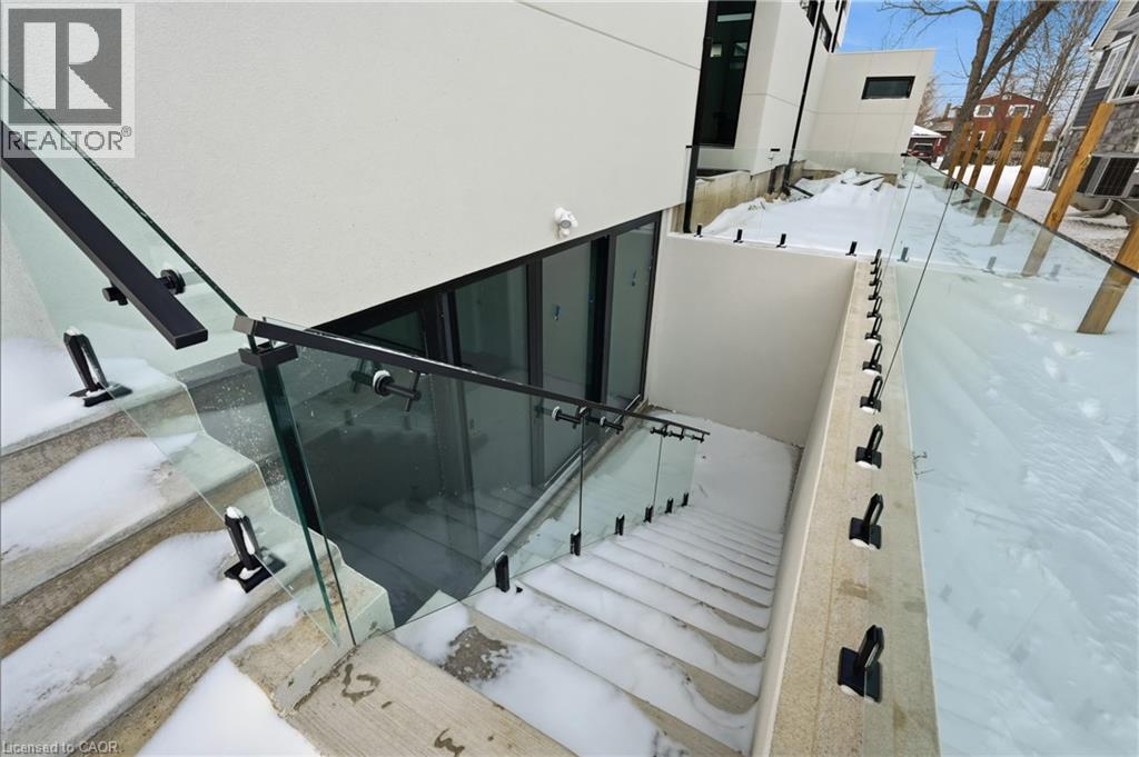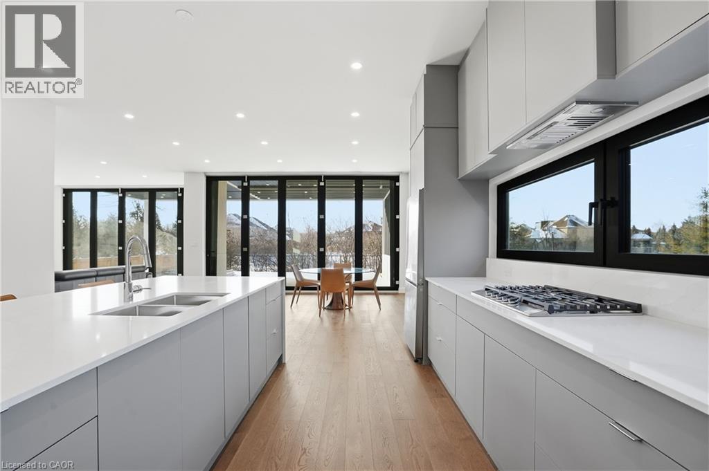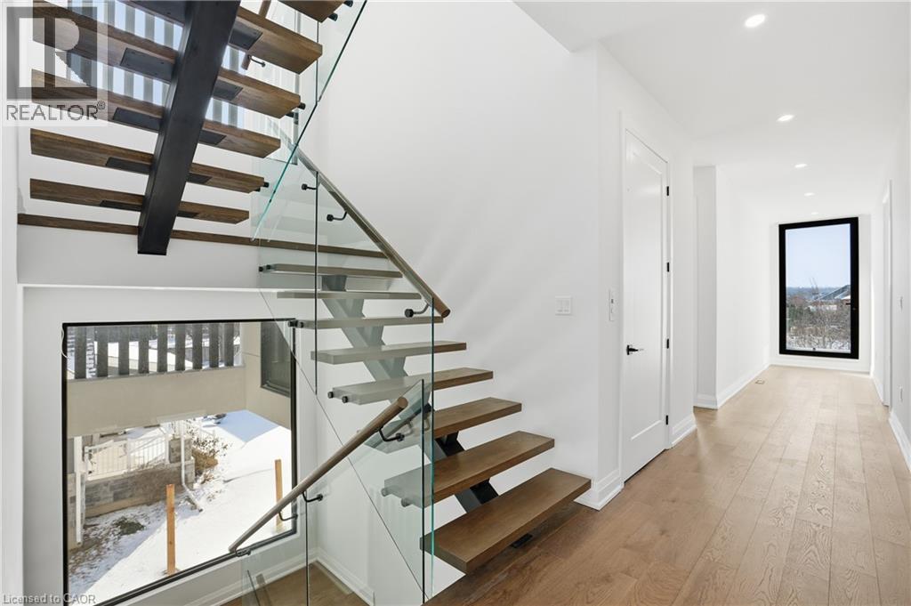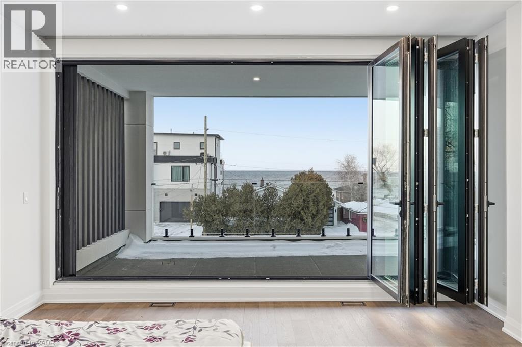 An exceptional newly built residence in Stoney Creek, completed in 2025 and offering nearly 7,500 square feet of refined living space. Designed to maximize natural light, the home features expansive floor to ceiling windows, clean contemporary lines, and elevated finishes throughout. A private elevator provides seamless access to all levels. The main floor opens into a dramatic two storey living room and flows into a statement chef’s kitchen with waterfall island and fully equipped prep kitchen. Dining and family rooms are framed by floor to ceiling bifold doors leading to a covered deck and spacious backyard, creating effortless indoor-outdoor living. A private office and powder room complete the level. Upstairs, four bedrooms each offer private ensuites, while the master bedroom features bifold doors to a covered balcony with lake views, a generous walk-in closet, and a spa inspired bath with soaker tub. The third level includes a kitchenette and rooftop terrace with uninterrupted Lake Ontario views. The bright basement offers a large rec room with full glass walkout, two bedrooms with shared ensuite, private office, and additional powder room. A rare opportunity for contemporary luxury in a premier lake oriented community. (id:4555)