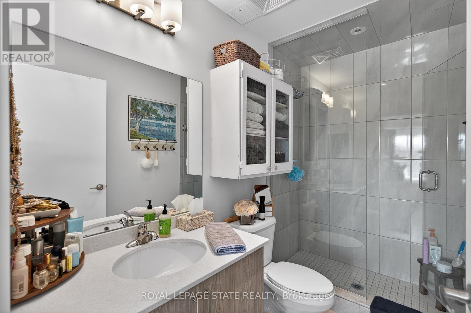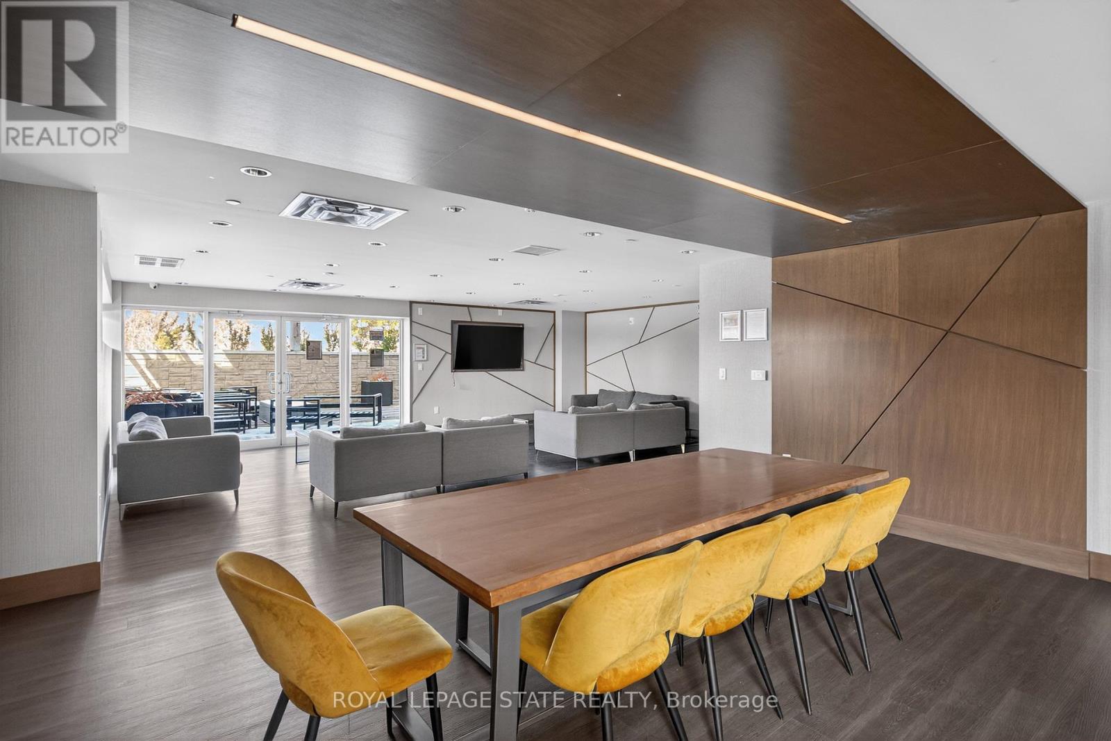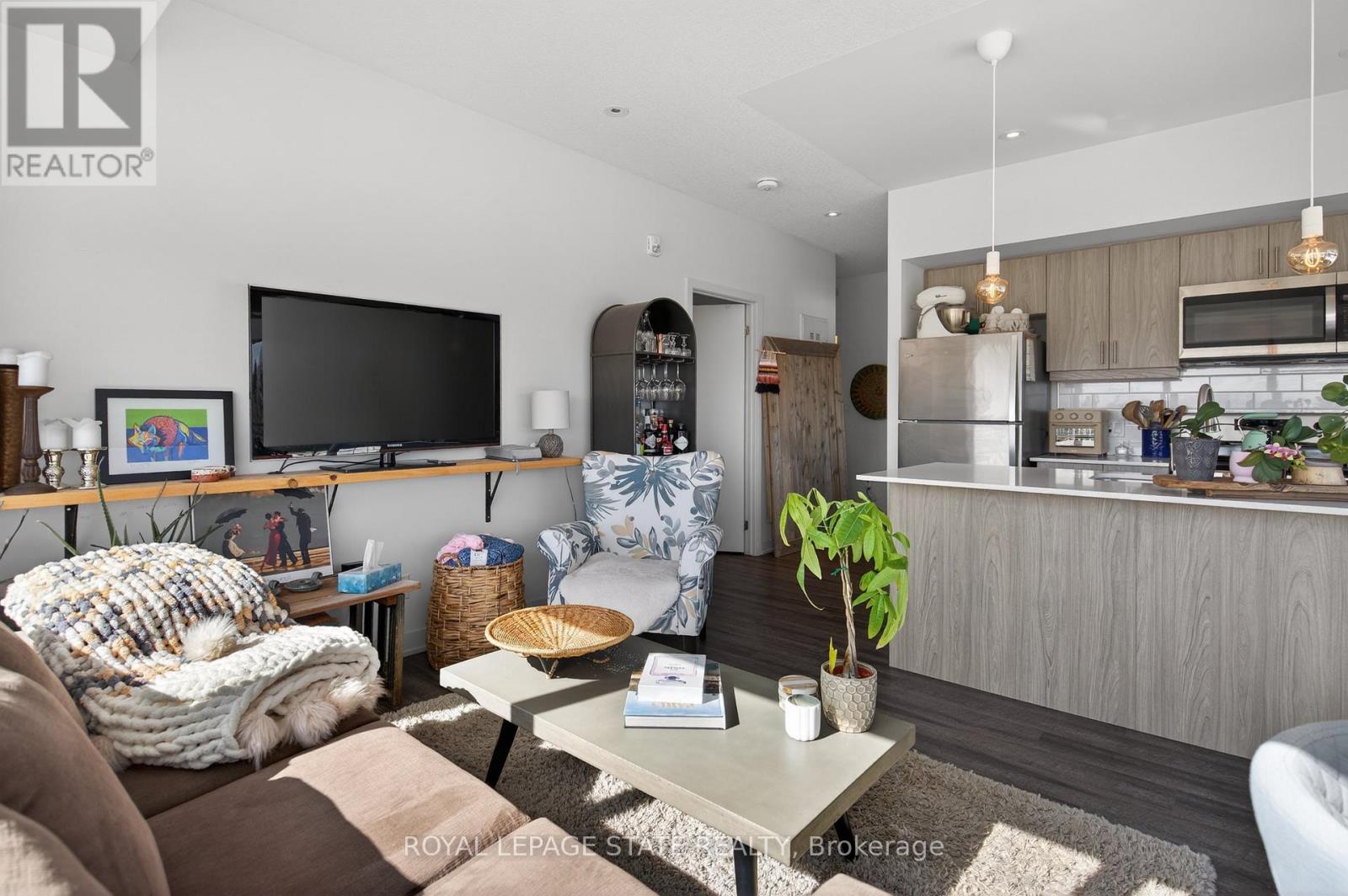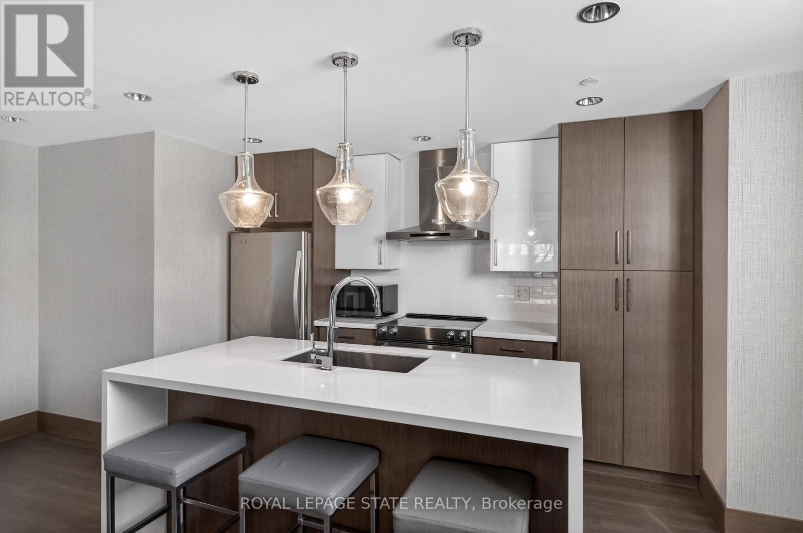 Welcome to the pinnacle of contemporary condo living in Ancaster's prestigious Monterey Heights at 16 Markle Crescent. This 2 bdrm, 2 bath penthouse corner suite offers 857 sq ft of refined living space, thoughtfully designed w/ an open-concept layout that maximizes light, flow, & functionality. The kitch is both stylish & practical, feat S/S app, an attractive tiled backsplash, striking pendant lighting, & a generous centre island w/ seating for 3+ - perfect for casual dining or entertaining. The space seamlessly connects to a formal din area w/ sliding doors that lead to a private covered balcony, creating an effortless indoor-outdoor lifestyle. The form liv rm is framed by dramatic flr-to-ceil windows, flooding the suite w/ natural light & showcasing elevated penthouse views. The primary retreat offers comfort and privacy, complete w/ a 3-pc ensuite w/ an oversized glass shower. A well-proportioned 2nd bdrm & a full 4-pc bath w/ a shower/tub combo provide flex for guests, family, or a home office. In-suite laund adds convenience. This suite also includes 1 underground parking space & a dedicated storage locker (#9). Monterey Heights delivers exceptional amenities designed for modern living, incl a well-equipped fitness centre w/ cardio/strength equip, a yoga/stretch area, & an elegant party lounge w/ a chef-inspired kitchen. The outdoor terrace features multi seating areas - ideal for gathering w/ friends or relaxing on warm summer evenings. Secure entry, underground parking, & meticulously maintained common areas enhance peace of mind. Situated in a convenient location, this address places you steps to shopping, restaurants, groceries, & everyday essentials. Quick access to Highway 403 ensures effortless commuting, while nearby parks, trails, golf courses, & top-rated schools complete the offering. Penthouse living, premium amenities, & an unbeatable Ancaster location - a rare opportunity to enjoy carefree luxury in one of the area's most sought-after buildings. (id:4555)