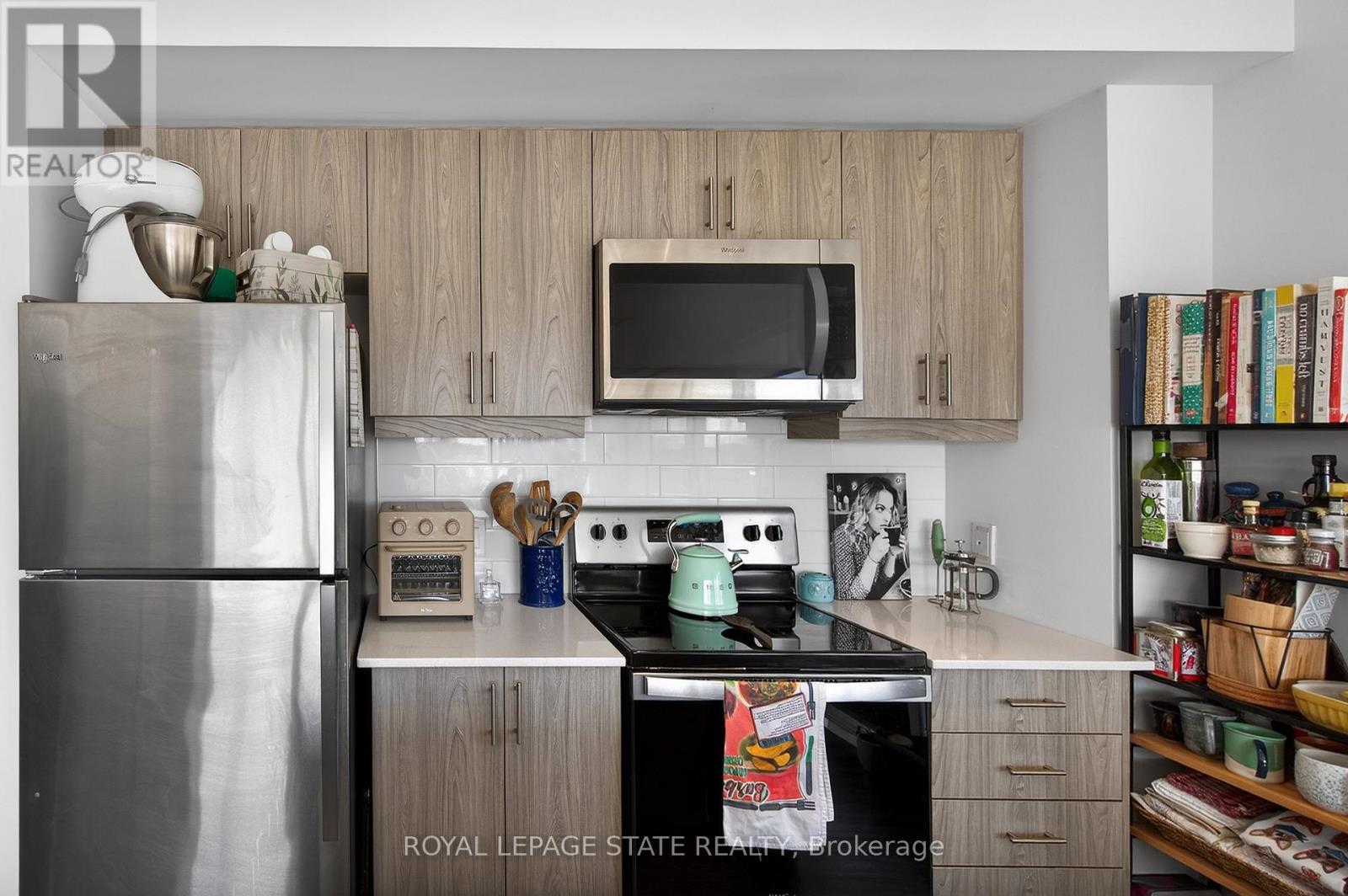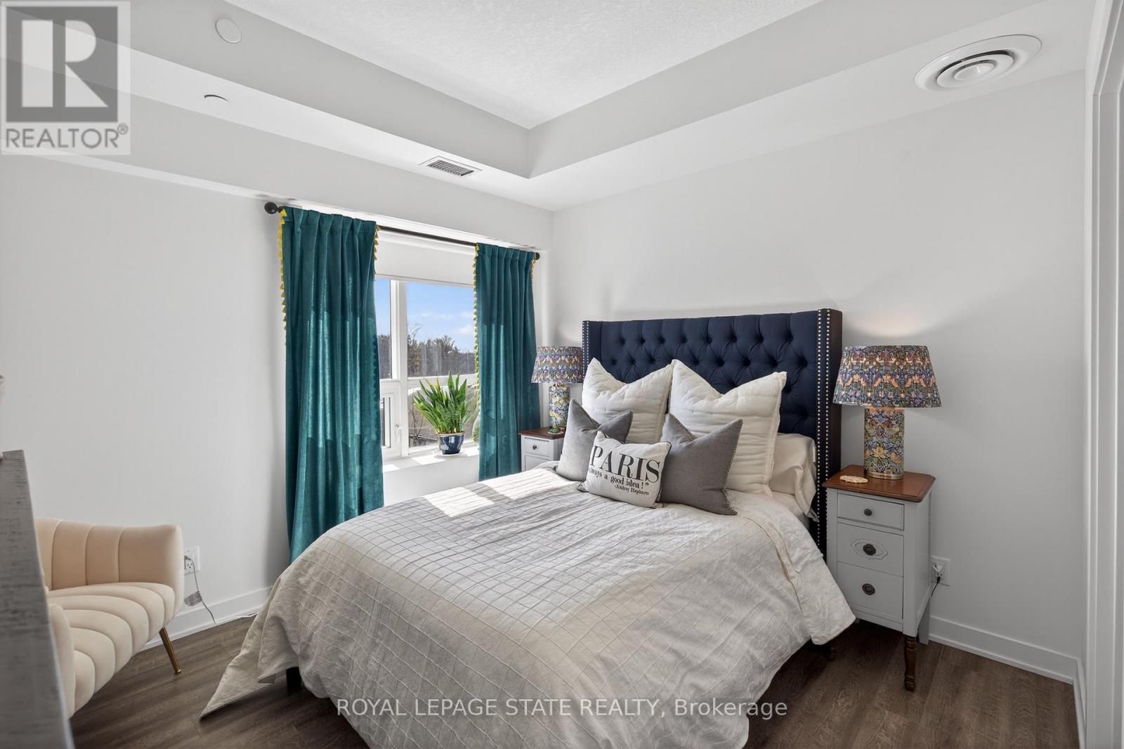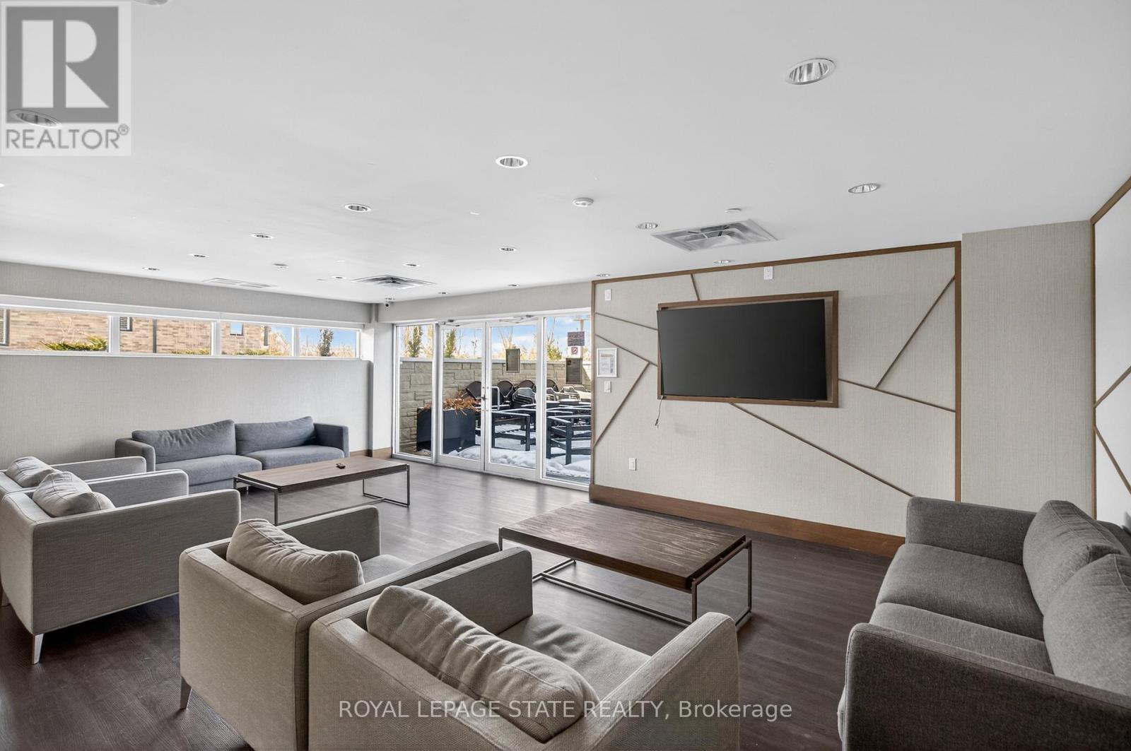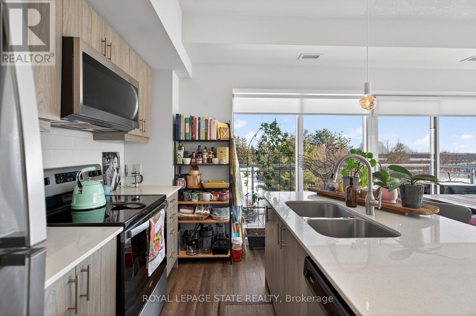 Welcome to the pinnacle of contemporary condo living in Ancaster's prestigious Monterey Heights at 16 Markle Crescent. This 2 bdrm, 2 bath penthouse corner suite offers 857 sq ft of refined living space, thoughtfully designed w/ an open-concept layout that maximizes light, flow, & functionality. The kitch is both stylish & practical, feat S/S app, an attractive tiled backsplash, striking pendant lighting, & a generous centre island w/ seating for 3+ - perfect for casual dining or entertaining. The space seamlessly connects to a formal din area w/ sliding doors that lead to a private covered balcony, creating an effortless indoor-outdoor lifestyle. The form liv rm is framed by dramatic flr-to-ceil windows, flooding the suite w/ natural light & showcasing elevated penthouse views. The primary retreat offers comfort and privacy, complete w/ a 3-pc ensuite w/ an oversized glass shower. A well-proportioned 2nd bdrm & a full 4-pc bath w/ a shower/tub combo provide flex for guests, family, or a home office. In-suite laund adds convenience. This suite also includes 1 underground parking space & a dedicated storage locker (#9). Monterey Heights delivers exceptional amenities designed for modern living, incl a well-equipped fitness centre w/ cardio/strength equip, a yoga/stretch area, & an elegant party lounge w/ a chef-inspired kitchen. The outdoor terrace features multi seating areas - ideal for gathering w/ friends or relaxing on warm summer evenings. Secure entry, underground parking, & meticulously maintained common areas enhance peace of mind. Situated in a convenient location, this address places you steps to shopping, restaurants, groceries, & everyday essentials. Quick access to Highway 403 ensures effortless commuting, while nearby parks, trails, golf courses, & top-rated schools complete the offering. Penthouse living, premium amenities, & an unbeatable Ancaster location - a rare opportunity to enjoy carefree luxury in one of the area's most sought-after buildings. (id:4555)