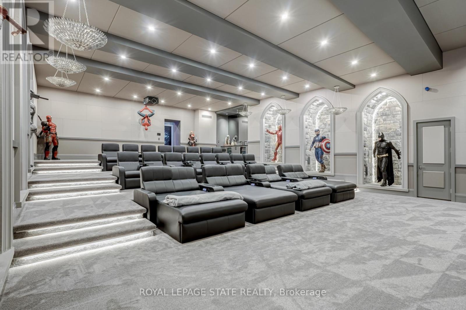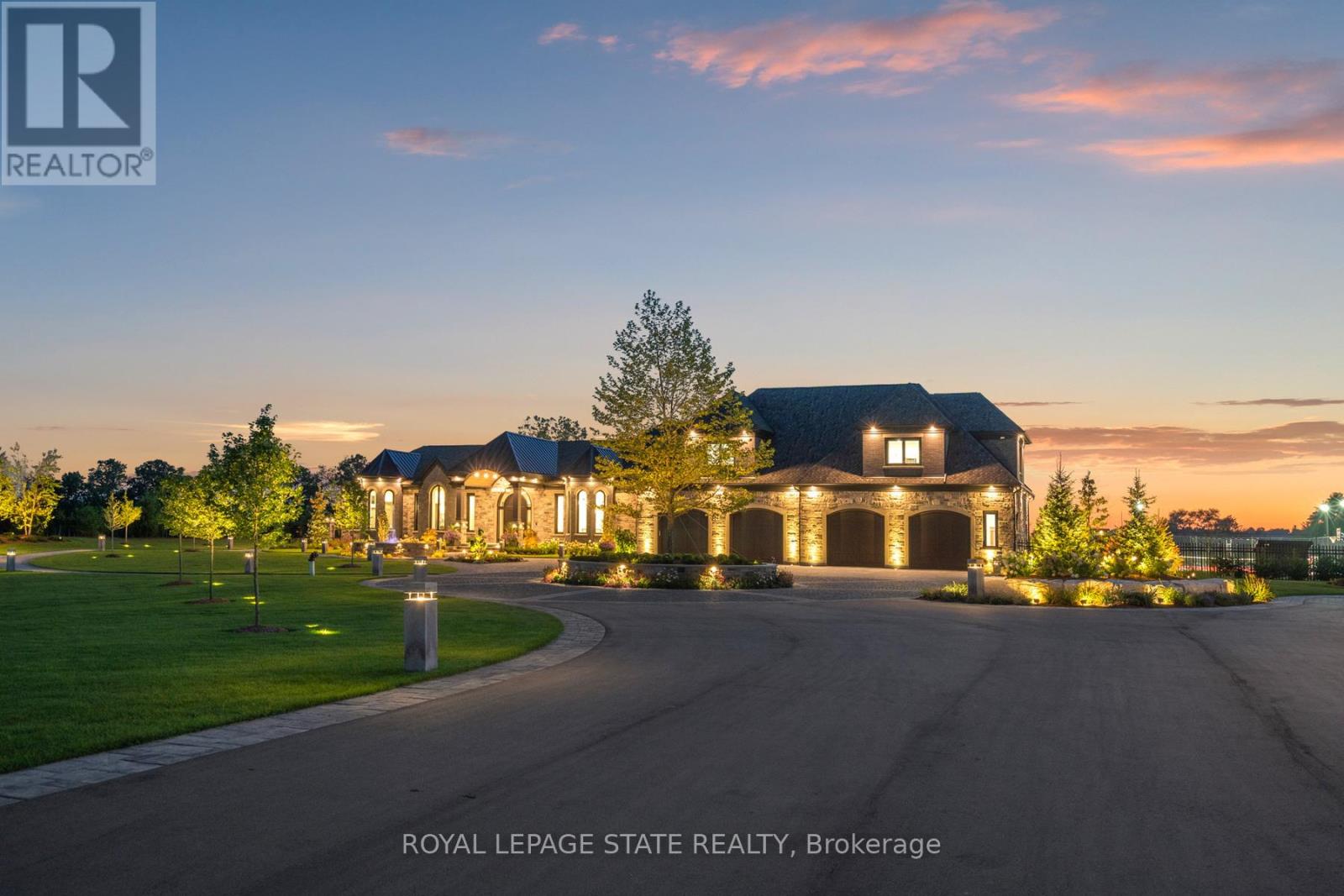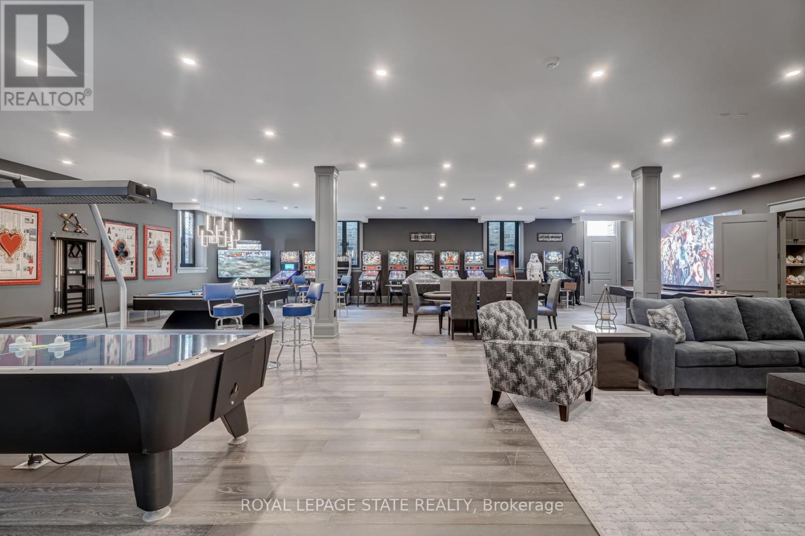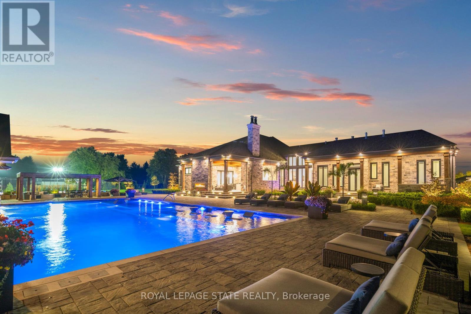 Set amidst a 5.2-acre estate, this extraordinary 32,000+ sq ft mansion offers unparalleled luxury and privacy. The gated and secured property features a stunning 1/3-acre aerated pond leading to a sprawling contemporary bungalow with lofted in-law quarters and a 5,210 sq ft detached garage with lounge, wash bay, and private gas pump-ideal for car enthusiasts.Surrounded by serene countryside, yet minutes from the heart of Ancaster, the renowned Hamilton Golf & Country Club, and Highway 403, offering both seclusion and convenience. Inside, every room showcases soaring 14 to 18-foot custom moulded ceilings, 32-inch porcelain flooring, and the highest quality materials and craftsmanship. The state-of-the-art home features whole-home automation by Control4. Spacious living areas feature custom granite walls with Town & Country fireplaces. A gourmet kitchen is equipped with top-tier appliances, including Sub-Zero, Thermador, and Miele. The luxurious lanai is perfect for entertaining, with heated Eramosa flagstone, a full outdoor kitchen, 72" Woods gas fireplace, and phantom screens. The opulent primary suite includes a private patio with hot tub and an expansive dressing room. The ensuite features heated herringbone floors, a soaker tub with fireplace, towel warmer drawers and a digital rain shower. The opposite wing offers three additional bedroom suites, each with walk-in closets and ensuites. A Cambridge elevator provides access to the entertainer's dream basement, with a party room, full bar, professional gym with sauna and steam shower, games room, and a state-of-the-art home theatre. This 24-seat Dolby Atmos theatre features a 254-inch screen, 24-foot ceiling height, and a Kaleidoscope movie server for the ultimate cinematic experience. Outdoor amenities include a 35' x 75' heated pool, a 14-person hot tub, and an entertainment cabana with a media area and hosting bar. A regulation-size sports court and a children's playground complete this family-friendly estate. (id:4555)