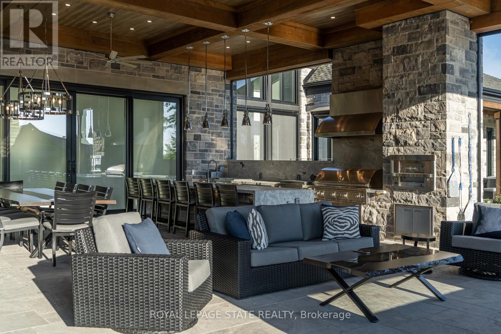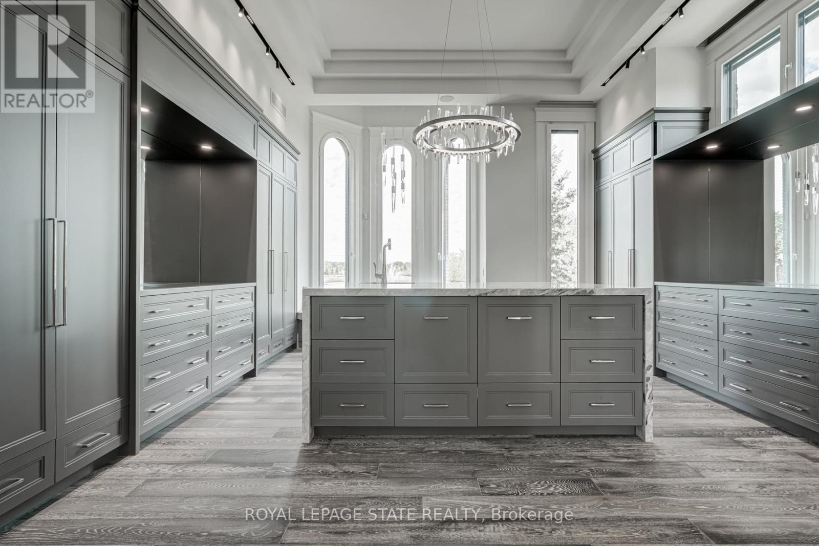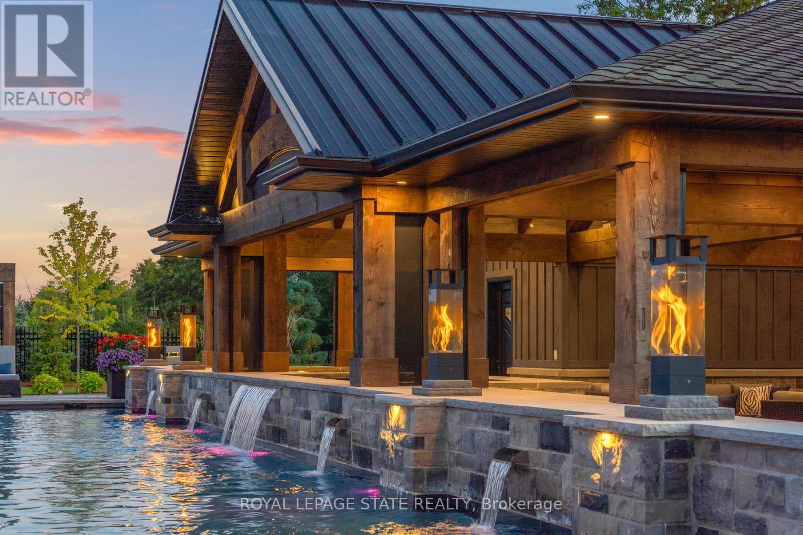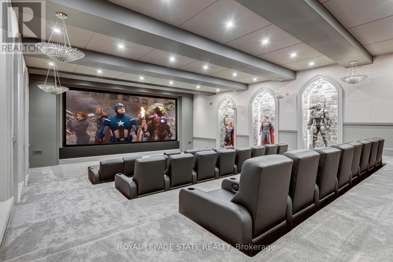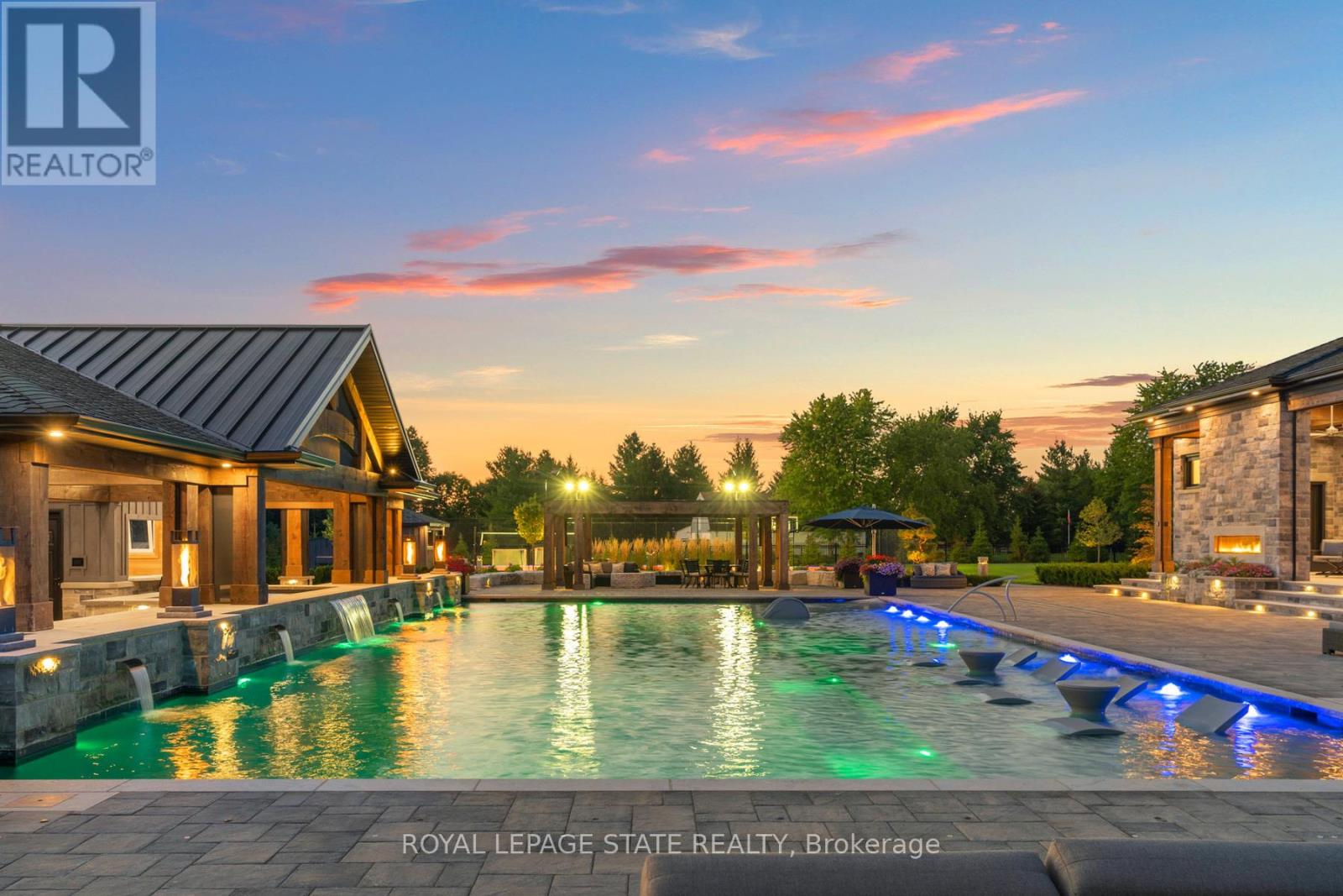 Set amidst a 5.2-acre estate, this extraordinary 32,000+ sq ft mansion offers unparalleled luxury and privacy. The gated and secured property features a stunning 1/3-acre aerated pond leading to a sprawling contemporary bungalow with lofted in-law quarters and a 5,210 sq ft detached garage with lounge, wash bay, and private gas pump-ideal for car enthusiasts.Surrounded by serene countryside, yet minutes from the heart of Ancaster, the renowned Hamilton Golf & Country Club, and Highway 403, offering both seclusion and convenience. Inside, every room showcases soaring 14 to 18-foot custom moulded ceilings, 32-inch porcelain flooring, and the highest quality materials and craftsmanship. The state-of-the-art home features whole-home automation by Control4. Spacious living areas feature custom granite walls with Town & Country fireplaces. A gourmet kitchen is equipped with top-tier appliances, including Sub-Zero, Thermador, and Miele. The luxurious lanai is perfect for entertaining, with heated Eramosa flagstone, a full outdoor kitchen, 72" Woods gas fireplace, and phantom screens. The opulent primary suite includes a private patio with hot tub and an expansive dressing room. The ensuite features heated herringbone floors, a soaker tub with fireplace, towel warmer drawers and a digital rain shower. The opposite wing offers three additional bedroom suites, each with walk-in closets and ensuites. A Cambridge elevator provides access to the entertainer's dream basement, with a party room, full bar, professional gym with sauna and steam shower, games room, and a state-of-the-art home theatre. This 24-seat Dolby Atmos theatre features a 254-inch screen, 24-foot ceiling height, and a Kaleidoscope movie server for the ultimate cinematic experience. Outdoor amenities include a 35' x 75' heated pool, a 14-person hot tub, and an entertainment cabana with a media area and hosting bar. A regulation-size sports court and a children's playground complete this family-friendly estate. (id:4555)
