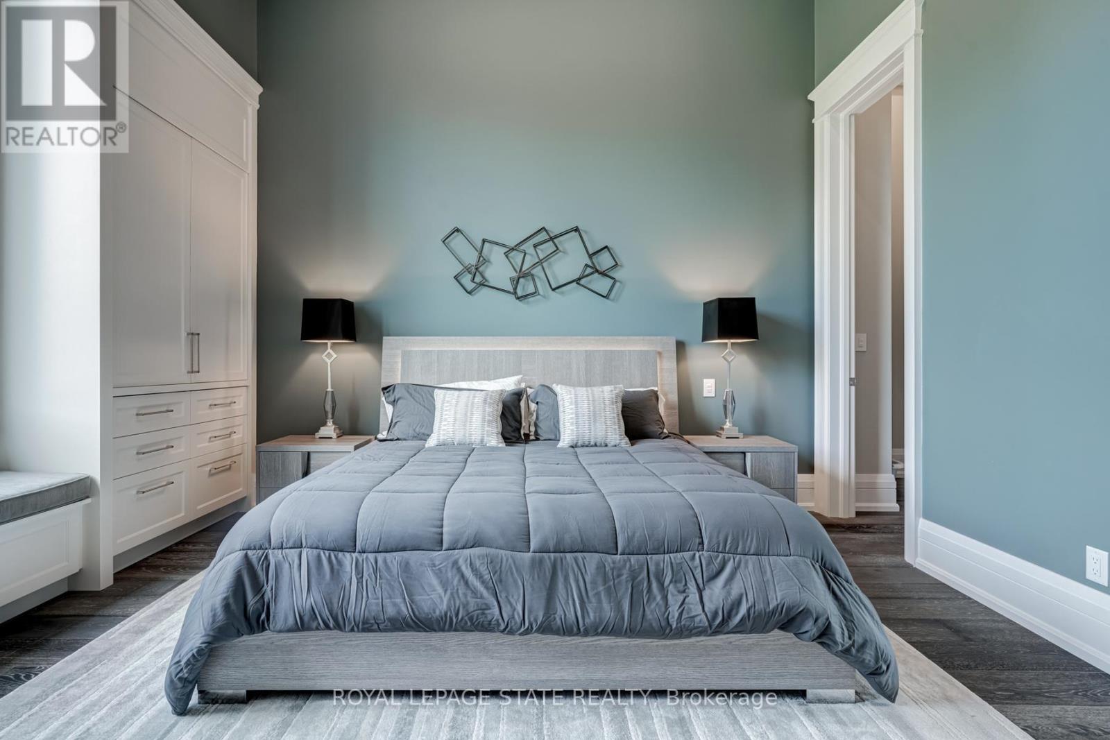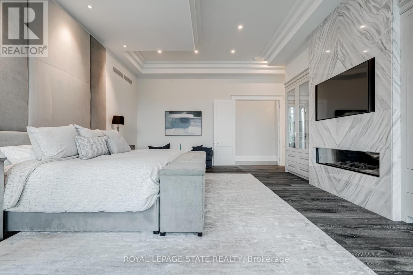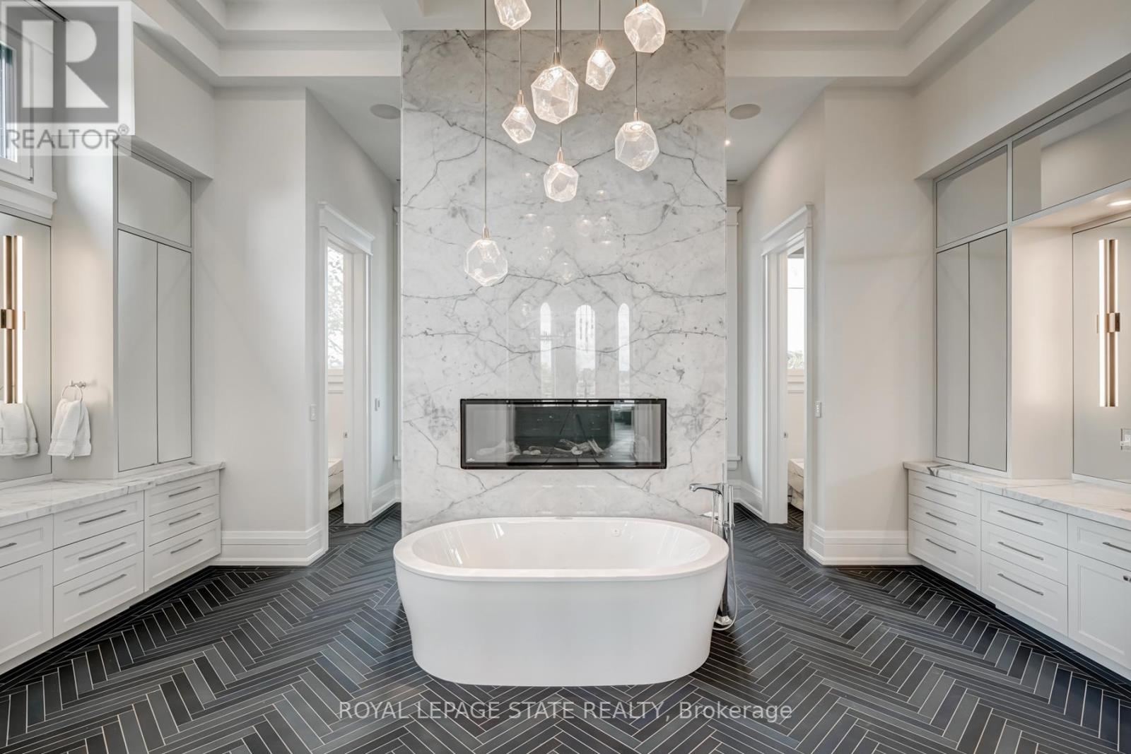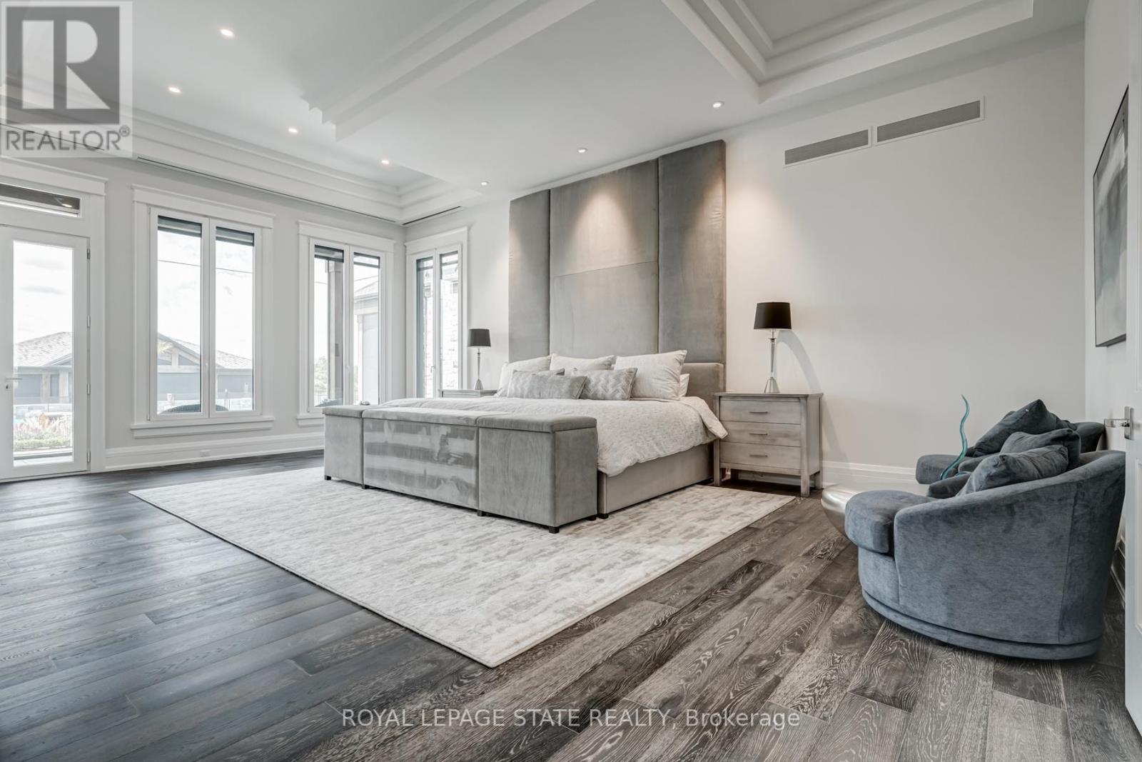 Set amidst a 5.2-acre estate, this extraordinary 32,000+ sq ft mansion offers unparalleled luxury and privacy. The gated and secured property features a stunning 1/3-acre aerated pond leading to a sprawling contemporary bungalow with lofted in-law quarters and a 5,210 sq ft detached garage with lounge, wash bay, and private gas pump-ideal for car enthusiasts.Surrounded by serene countryside, yet minutes from the heart of Ancaster, the renowned Hamilton Golf & Country Club, and Highway 403, offering both seclusion and convenience. Inside, every room showcases soaring 14 to 18-foot custom moulded ceilings, 32-inch porcelain flooring, and the highest quality materials and craftsmanship. The state-of-the-art home features whole-home automation by Control4. Spacious living areas feature custom granite walls with Town & Country fireplaces. A gourmet kitchen is equipped with top-tier appliances, including Sub-Zero, Thermador, and Miele. The luxurious lanai is perfect for entertaining, with heated Eramosa flagstone, a full outdoor kitchen, 72" Woods gas fireplace, and phantom screens. The opulent primary suite includes a private patio with hot tub and an expansive dressing room. The ensuite features heated herringbone floors, a soaker tub with fireplace, towel warmer drawers and a digital rain shower. The opposite wing offers three additional bedroom suites, each with walk-in closets and ensuites. A Cambridge elevator provides access to the entertainer's dream basement, with a party room, full bar, professional gym with sauna and steam shower, games room, and a state-of-the-art home theatre. This 24-seat Dolby Atmos theatre features a 254-inch screen, 24-foot ceiling height, and a Kaleidoscope movie server for the ultimate cinematic experience. Outdoor amenities include a 35' x 75' heated pool, a 14-person hot tub, and an entertainment cabana with a media area and hosting bar. A regulation-size sports court and a children's playground complete this family-friendly estate. (id:4555)
