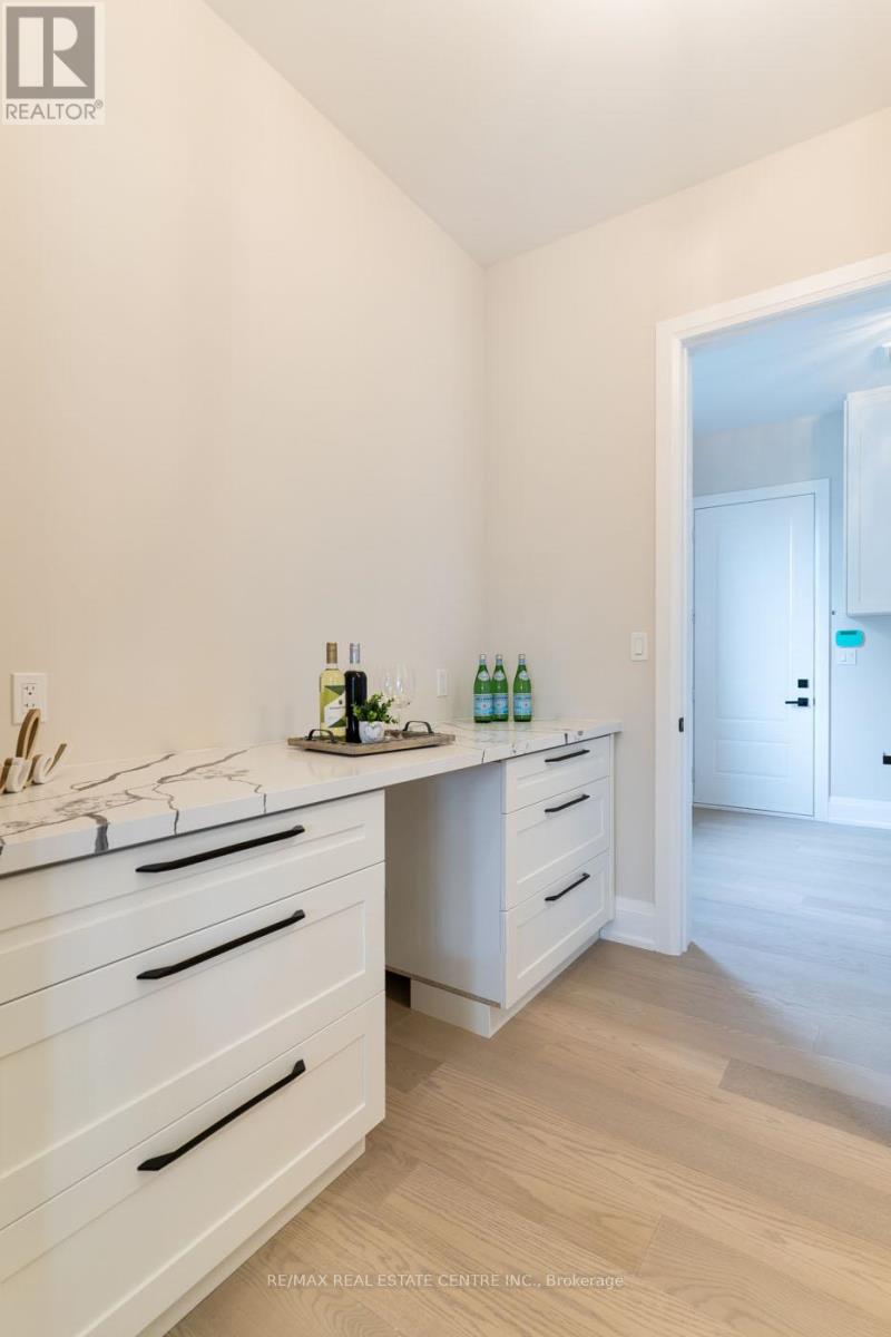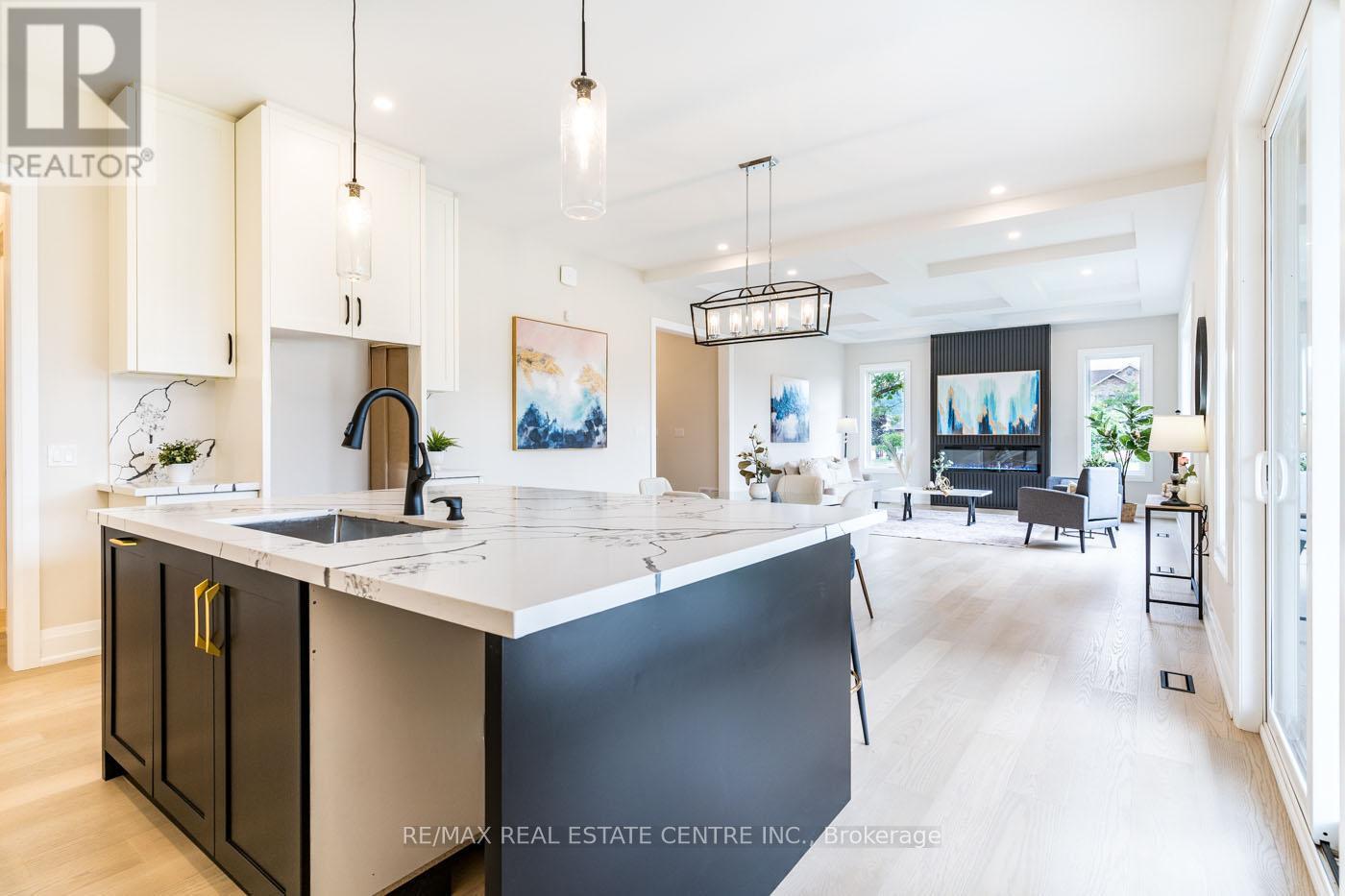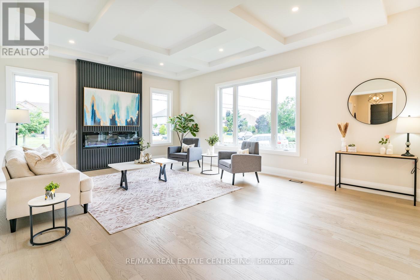 Welcome to a stunning modern 4,500 sq. ft. masterpiece where luxury and craftsmanship unite seamlessly. This custom two-story home epitomizes contemporary sophistication, offering an unparalleled living experience defined by soaring 10-foot ceilings on the main level and 9-foot ceilings upstairs. At the heart of the home is a sleek, designer kitchen featuring custom cabinetry with pull-out drawers, a dedicated servery, and an oversized walk-in pantry-a perfect blank canvas awaiting your personal choice of premium appliances. Adjacent is the expansive, open-concept living area highlighted by a striking coffered ceiling, an elegant electric fireplace, and breathtaking windows that bathe the space in natural light. The main level also features a private office behind grand 8-foot doors, offering a quiet retreat or ideal workspace. The finished basement, complete with a 2-piece bathroom and 9-foot ceilings, adds versatile space for recreation or fitness. Upstairs, the primary suite serves as a serene escape with a spacious walk-in closet and a spa-inspired 5-piece ensuite. A second bedroom features a private 3-piece ensuite, while two additional bedrooms share a well-appointed 5-piece bathroom. Step outside to a private backyard oasis with a covered patio, BBQ gas hookup, and lush landscaping. Additional high-end features include an oak staircase with iron spindles, a hardwired security system, and Wi-Fi access points on each floor. Located in a sought-after neighborhood just minutes from the QEW, a future GO station, and top-rated schools, this exceptional home offers the perfect blend of luxury and location. (id:4555)