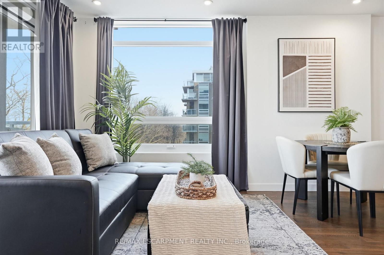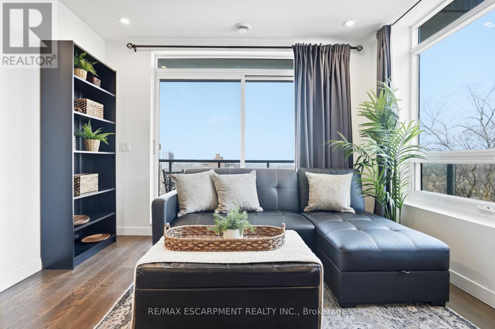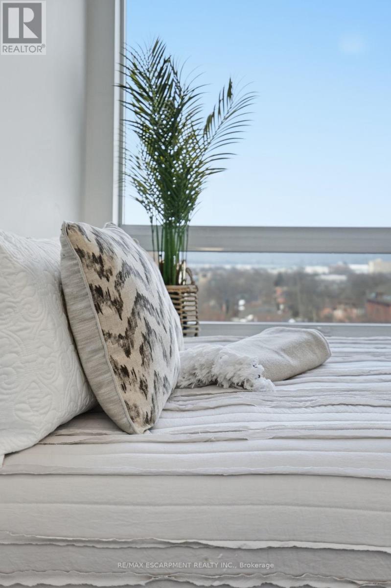 Welcome to 937 square feet of corner-unit perfection, where south-facing panoramic views deliver both golden morning light and glowing evening skies. This 2-bedroom, 2 full bathroom residence strikes the perfect balance of sophistication and calm. It's just minutes from downtown Hamilton, yet tucked into peaceful surroundings near trails and green space. Step out onto the oversized balcony and take it all in. Inside, the open-concept layout is wrapped in oversized windows and flooded with natural light. The kitchen features sleek finishes, stainless steel appliances, an under-mount sink and a generous-sized breakfast bar. The primary suite is generous and private, complete with a walk-in closet, ensuite and enough space for a home office or reading nook. The second bedroom is a true bedroom - not a den - with a full closet and large windows showcasing those stunning south-facing views. Both full bathrooms are thoughtfully upgraded with modern vanities, full mirrors and smart storage. Extras include: in-suite laundry, a full-size locker and an underground parking space. Residents enjoy premium amenities including a fully equipped gym, party room, visitor parking and access to the impressive rooftop terrace. Location? Exceptional. Minutes to the 403, LINC, St. Joseph's Hospital, McMaster University, the GO Station, and the vibrant restaurants and cafés of James Street South. A rare opportunity to own a corner unit with views that truly never get old, at a price point that still makes sense. RSA. (id:4555)