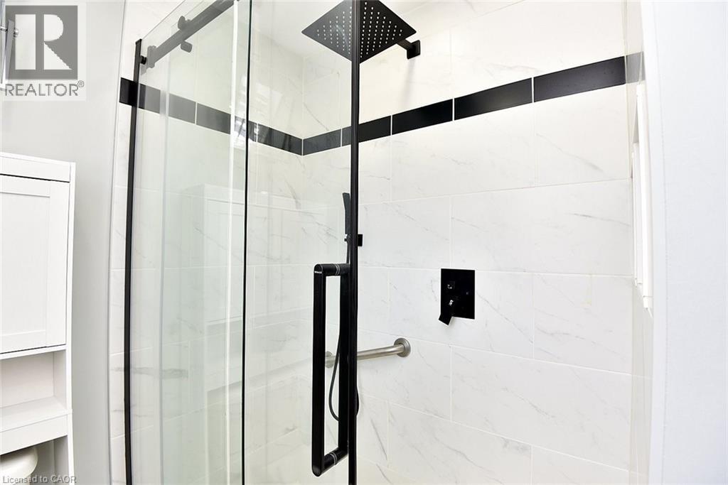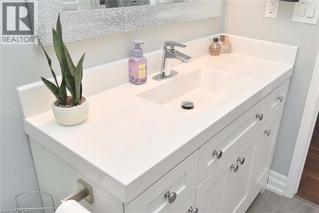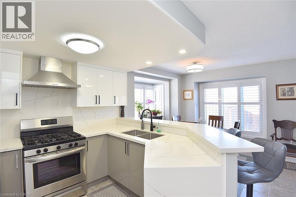 Immaculate and bright, open-concept 3 Bedroom end unit townhome in desirable Bayberry Village. Ideally located within the complex with open space and visitor parking to one side offering a park-like setting. The main level is perfect for entertaining thanks to the open layout combining the kitchen, dining, and living room which features a corner gas fireplace and terrace doors leading to the private patio. The renovated kitchen boasts modern white upper and grey lower cabinetry with hinged corner cabinets, quartz countertop with waterfall edge and backsplash, undermount sink, breakfast bar and chimney-style range hood. The handy powder room has also been updated with a quartz countertop vanity. The upper level has laminate flooring throughout and all bedrooms enjoy ample natural light. The large primary bedroom suite enjoys a vaulted ceiling, walk-in closet and renovated 3-piece bath with a large shower with rainfall showerhead. The 4-piece main bath, also renewed, is shared by the 2 additional bedrooms. The lower level offers a large rec room, laundry room and utility room with loads of storage. Features include California shutters, upgraded baseboards, white painted spindles, Decora light switches, inside entry to garage, plywood subfloors and is virtually carpet-free (only on stairs). The fridge, gas range, dishwasher and Samsung laundry pair are all included. This small quiet enclave of 43 townhomes is conveniently located across from St. Joseph’s Healthcare King Campus, close to Eastgate Square, Queenston Rd. & Centennial Parkway shopping and restaurants. Steps to public transit, and with excellent highway access to the Red Hill Valley Parkway and QEW and a short drive to the new Confederation GO station for commuters. Welcome Home! (id:4555)