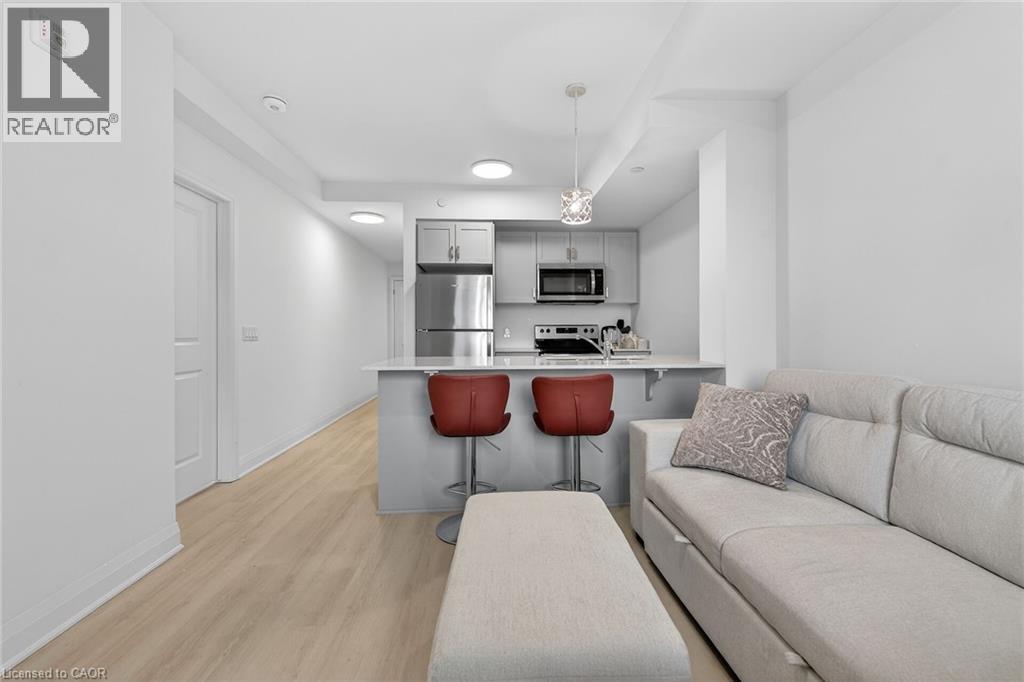 PRIME LOCATION! Welcome to PEAK CONDOS within the upper Stoney Creek across from Eramosa Karst Conservation Area, a stunning 5 Storey building that has an attractive exterior which combines stone with timeless glass & wood. Bright, sun-filled, thoughtfully designed 1 Bedroom features 9-foot ceilings and stylish upgrades throughout. Enjoy quartz countertops, an undermount sink, sleek vinyl plank flooring, pot lights with upgraded all light fixtures, and the convenience of in-suite laundry. All S.S appliances included. Comes with 1 parking spot and locker! Tasteful landscaping surrounds the development adding the appeal of greenery on multiple sides. Ample onsite vehicle parking, bicycle storage, fitness center, lockers, party room (birthdays, showers, and graduations can be celebrated in style), rooftop amenities with group seating & dining areas, modern lobby greets visitors, presenting a welcome entranceway. With easy access to shopping, parks, schools, restaurants, transit, and major highways, this move-in-ready condo is an excellent opportunity for first-time buyers, professionals, or downsizers seeking stylish, low-maintenance living. (id:4555)
