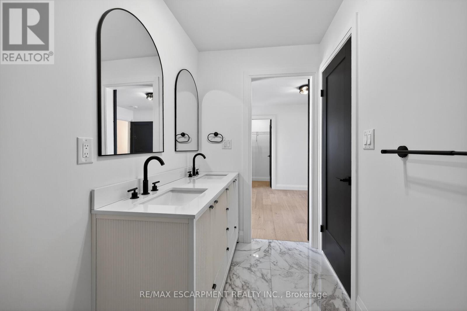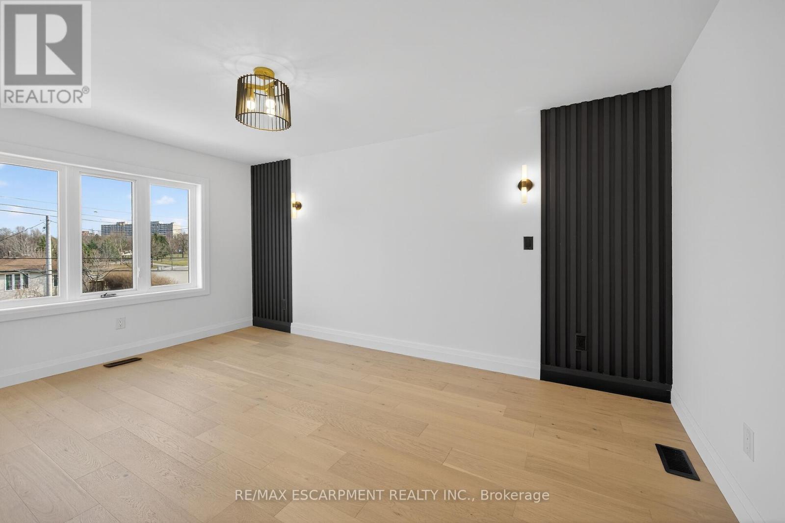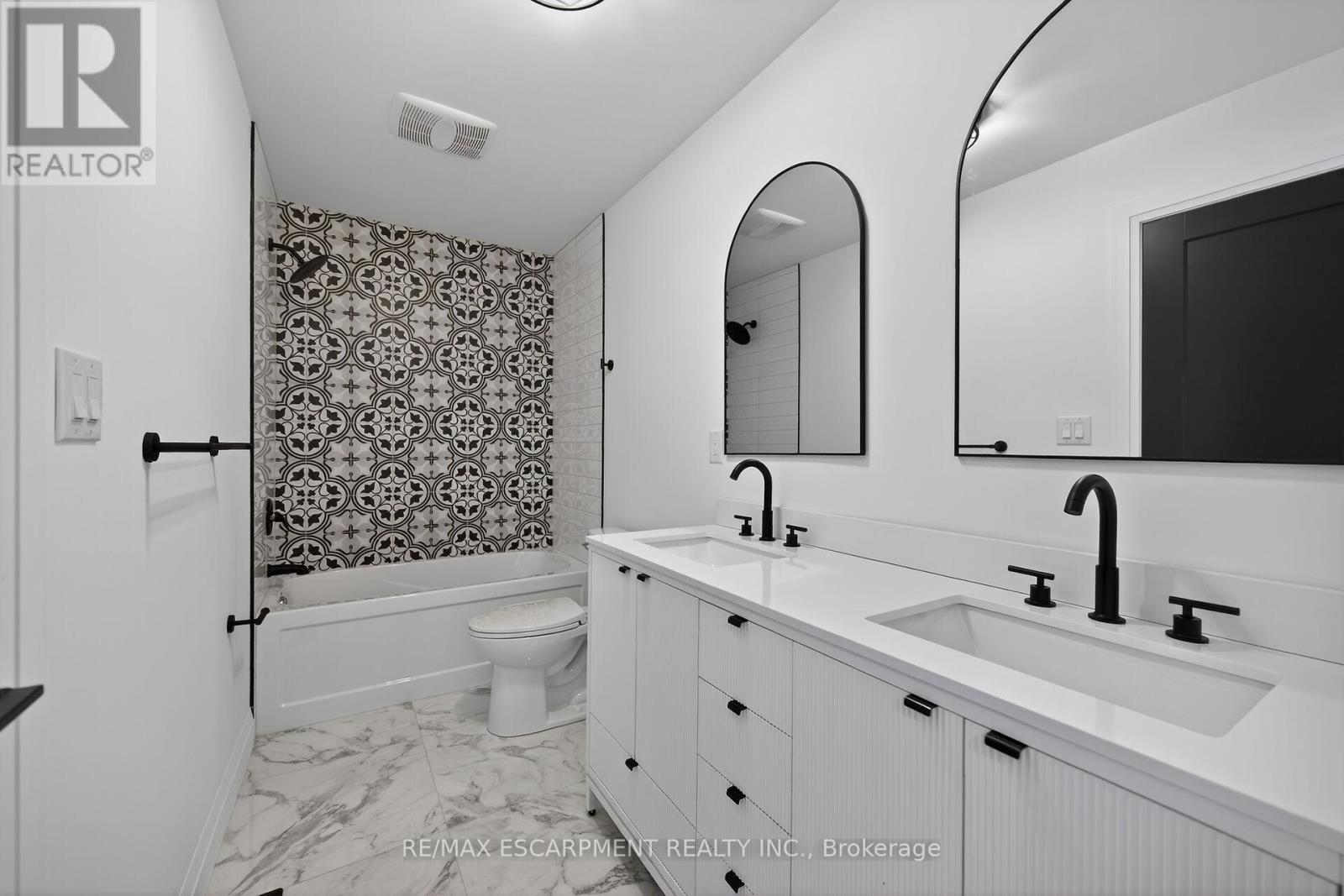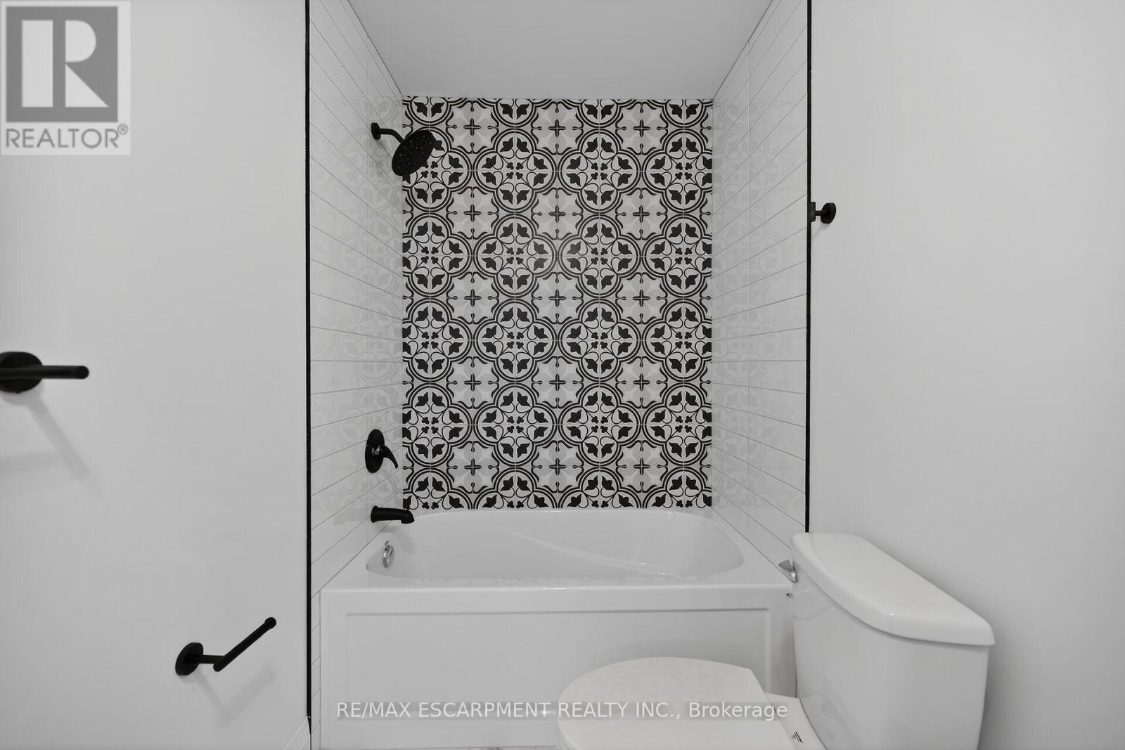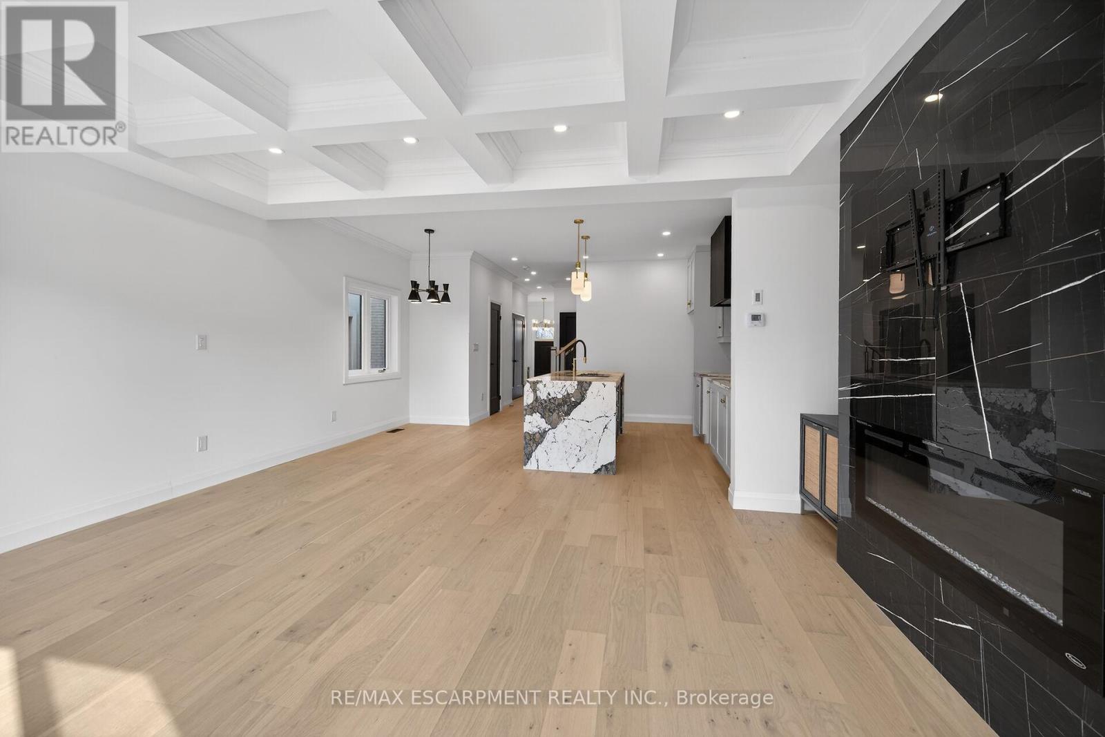 WELCOME TO THIS STUNNING NEW BUILD. This 1675 square foot semi-detached residence boasts an attached garage. A significant investment of $20,000 was made in enhancing the exterior, including a newly paved driveway, interlock stone walkway and patio, backyard fencing and meticulous landscaping. Upon entering, the main floor reveals a stately foyer, 9 ft ceilings, powder room, gourmet kitchen equipped with quartz countertops, island and porcelain tile backsplash, open concept dining area, great room featuring coffered ceilings and potlights, custom designed fireplace and walkout access to the rear yard. The upper level comprises three generously sized bedrooms, including the master suite complete with walk-in closet, opulent 4-piece ensuite featuring double vanity and glass shower. Two additional bedrooms, each with walk-in closets, share a 5-piece bathroom, each having ensuite privileges. A conveniently located laundry room is situated on this level. The unfinished, high basement offers endless possibilities for customization. Additional notable features and upgrades include engineered and porcelain flooring throughout, slat walls, potlights, designer lighting, to name a few. A comprehensive Tarion warranty is available. The property is advantageously situated in close proximity to schools, parks, church, Mohawk College, the Lincoln Alexander Parkway, Highway 403 and McMaster University. (id:4555)