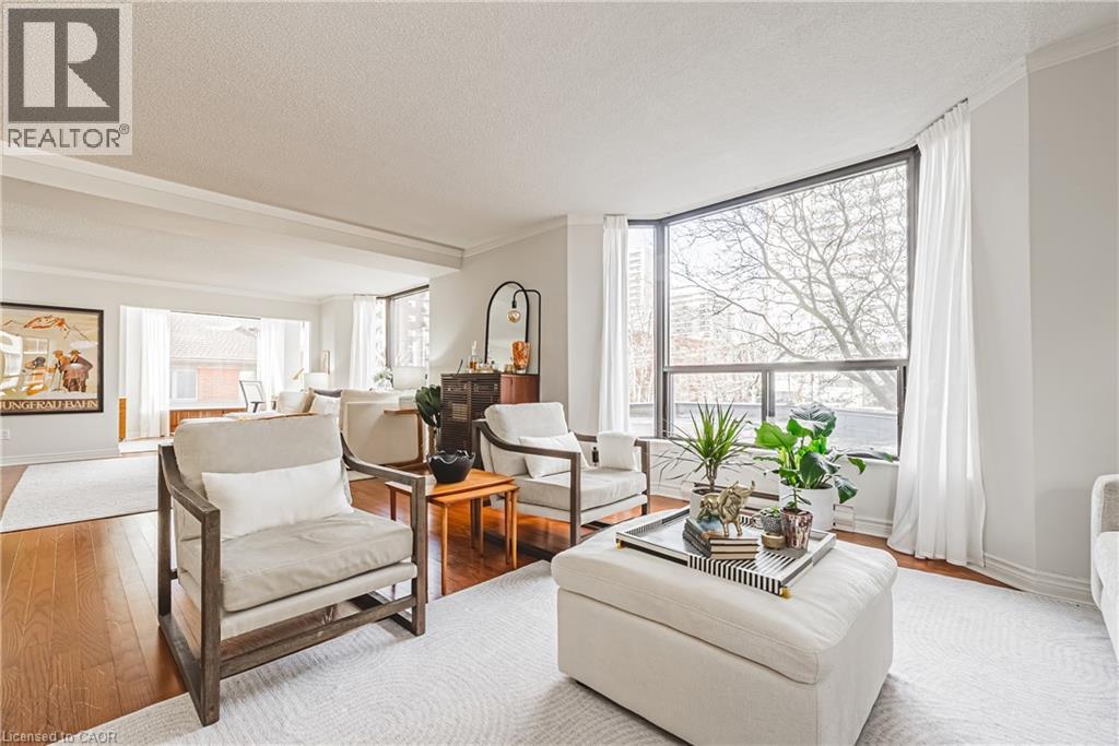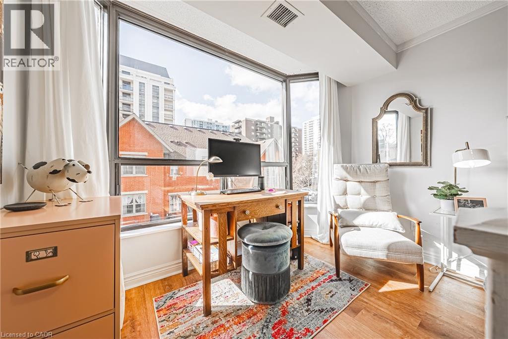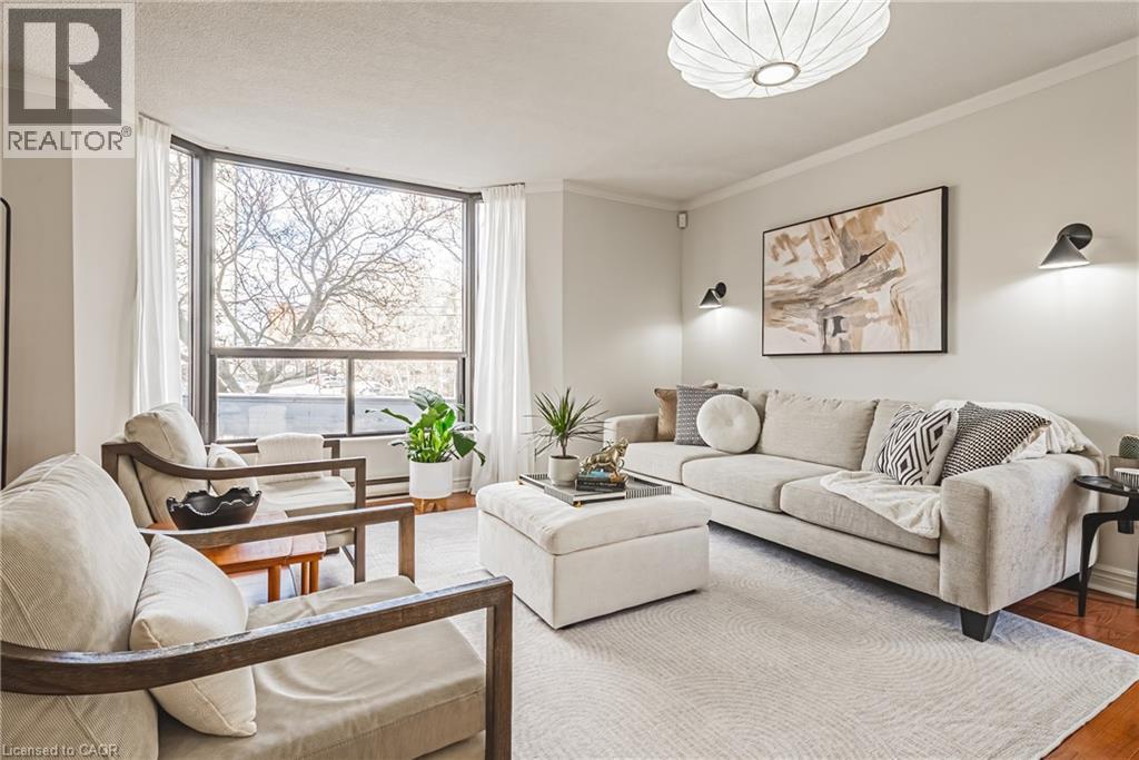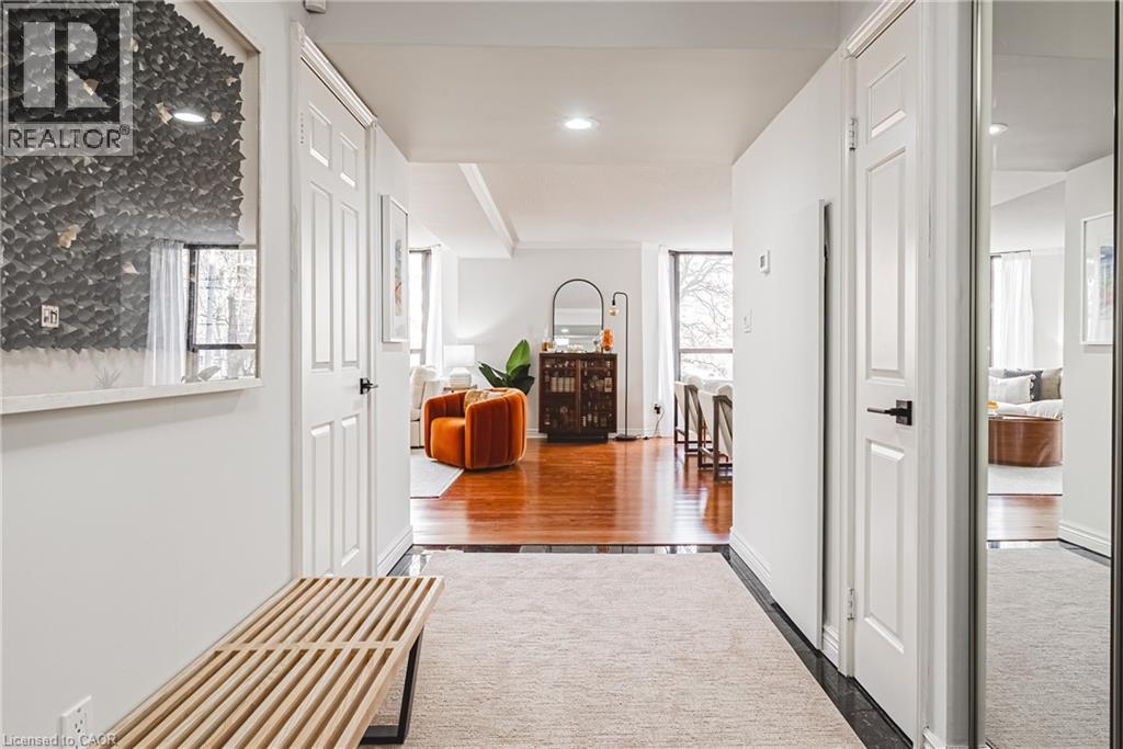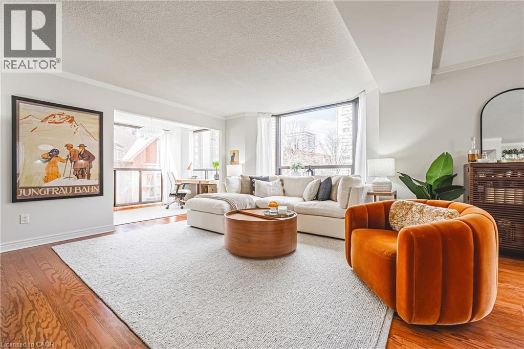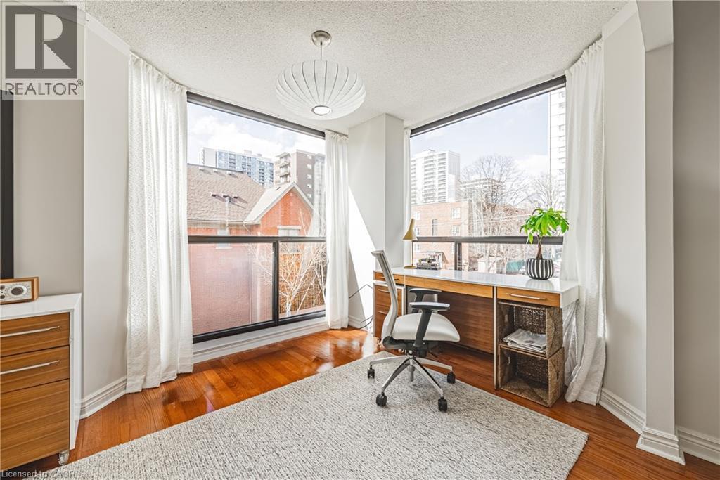 Nearly 1,800 sq. ft. of house-sized living with only two suites per floor — a rare boutique condo opportunity in the heart of downtown Hamilton. Welcome to The Garrison, an exclusive residence offering exceptional privacy and space rarely found in condominium living. This beautifully proportioned corner suite opens through double doors into a gracious centre-hall layout, with expansive principal rooms designed for both comfortable everyday living and effortless entertaining. Bay windows and wall-to-wall glass capture east, west and north exposures, flooding the home with natural light. The grand living and dining areas comfortably host everything from intimate dinners to large holiday gatherings, offering the scale and flexibility often missing from condo living. The well-appointed kitchen features granite countertops, newer appliances (2021–2023), and an instant hot water tap. The private bedroom wing includes a spacious primary suite with a corridor of closets and ensuite bath, while the generous second bedroom, full guest bath, and separate den/office provide flexibility for guests or working from home. Rich hardwood floors and thoughtful updates reflect meticulous care throughout. Ideally located steps to St. Joseph’s Hospital and within walking distance to Locke Street boutiques, Augusta cafés and wine bars, and Hess Village nightlife, this home offers a vibrant urban lifestyle. Parking is a rare luxury downtown. The suite includes one owned underground space and currently rents two additional spaces for just $50/month each. A rare opportunity for house-sized living without the maintenance in one of Hamilton’s most exclusive boutique buildings. (id:4555)