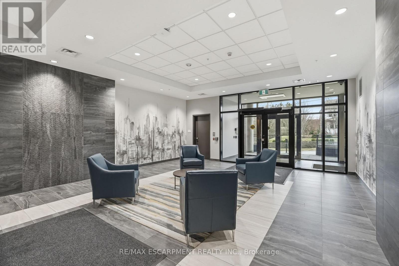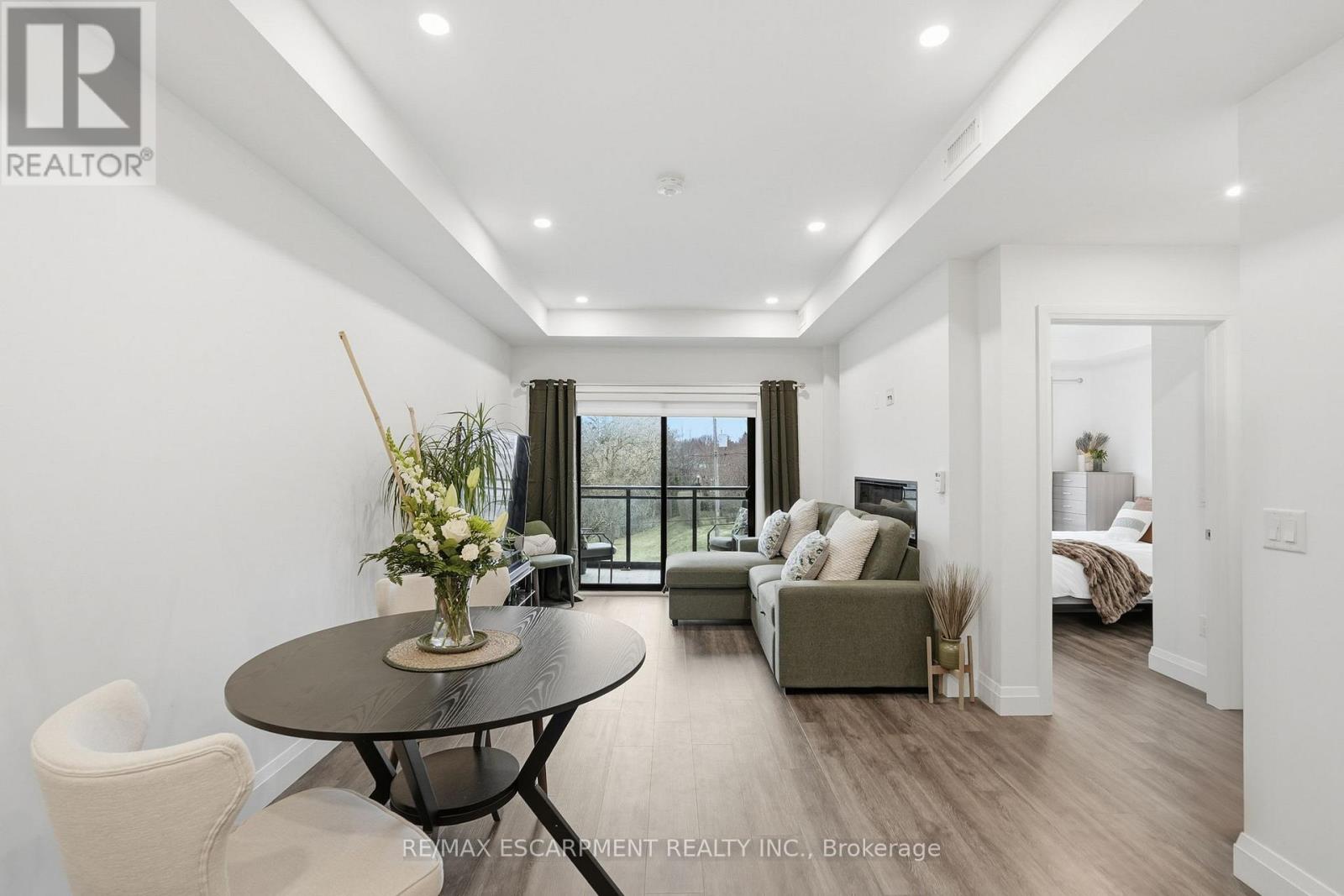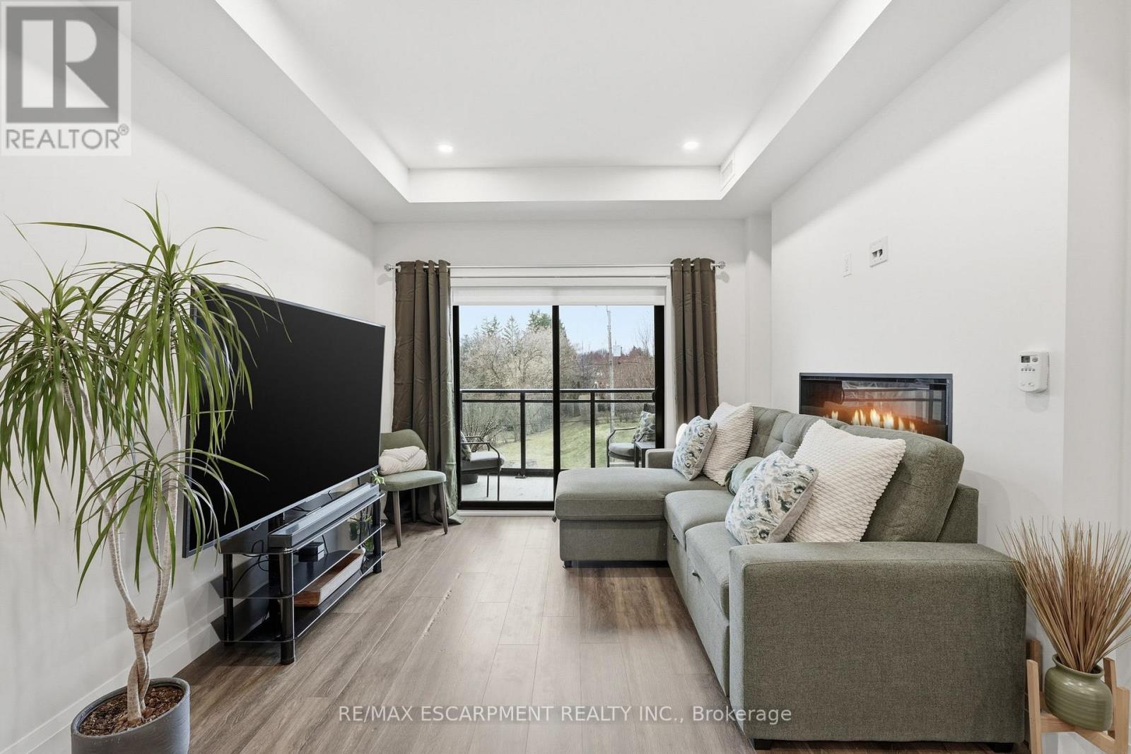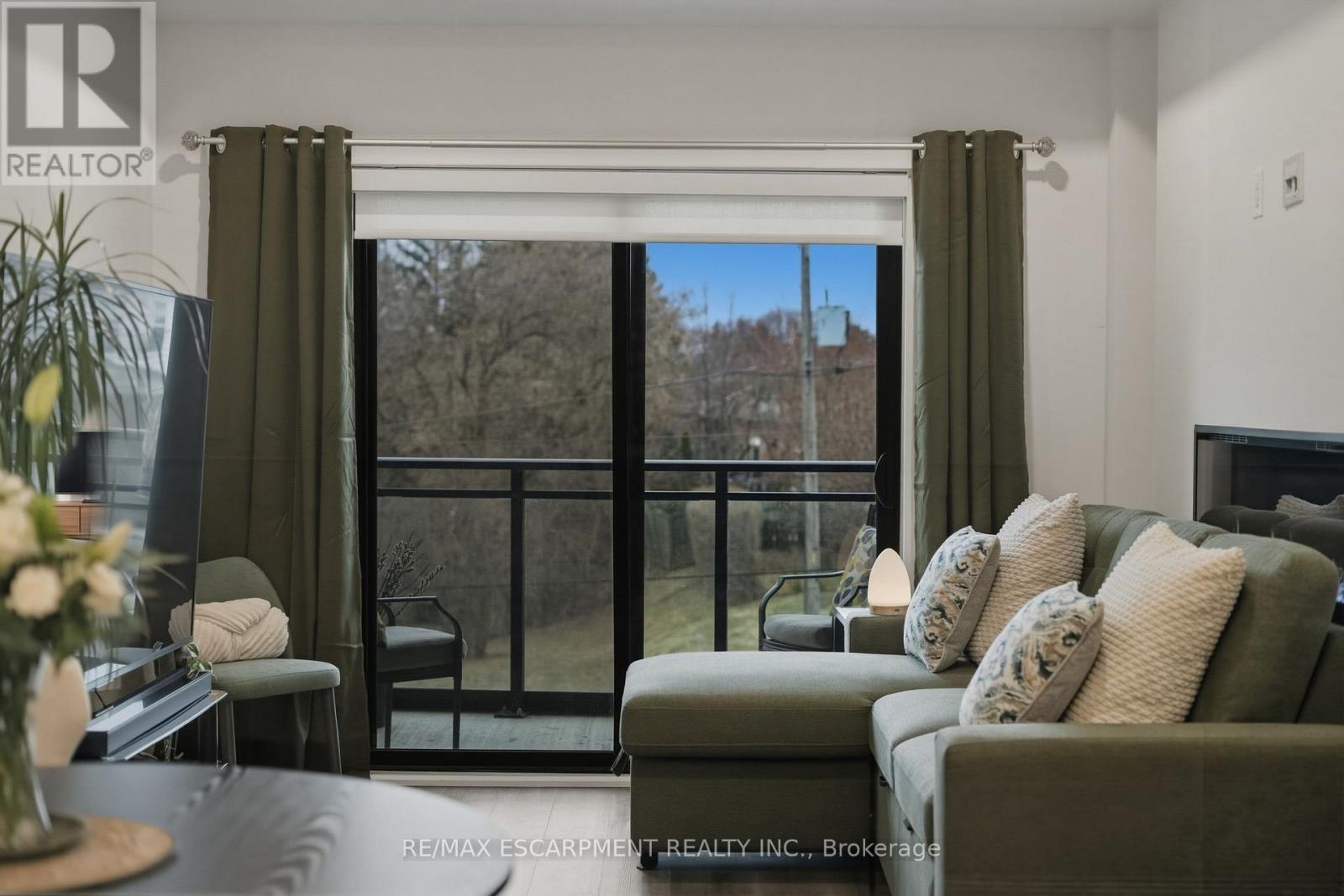 Tucked on a quiet, mature side street in sought-after Waterdown, this stylish south-facing 1-bedroom + Den suite with 1 garage parking and locker at "The View" offers you a rare blend of peaceful surroundings and walkable convenience. Just steps to the quaint downtown core, local shops, and the scenic trails and lookout points along the Niagara Escarpment, the location feels both connected and tucked away. From inside the well-cared for Unit 201, you'll enjoy tranquil views of trees that create a true sense of calm. Thoughtfully designed, the suite features a versatile den ideal for a home office or hobby room, a spacious dining area that can accommodate a full table set, a spacious living room with a wall-mounted electric fireplace, and a private balcony to enjoy. The kitchen is well-appointed with white quartz countertops, stainless steel appliances, and a generous peninsula for everyday living and entertaining. The bedroom easily fits a complete furniture set, while the spa-like bathroom offers a tiled walk-in shower, linen storage, large floating vanity, and a laundry machine closet. This well-maintained 6-year-old building feels like an extension of your home, with concierge/security staff that know your name, a fully equipped gym, expansive party room w prep kitchen, cozy lounge, 6th floor terraces w seating and wonderful views, a pet spa, EV parking, and lots of parking for your guests. While being a quick drive to major highways, GO Stations and major shopping centers; your new home awaits in Unit 201, a peaceful, well-designed suite in Waterdown's most modern yet charming settings. (id:4555)