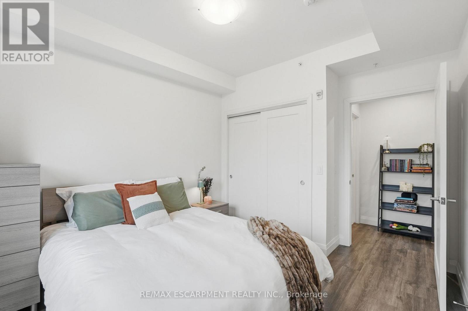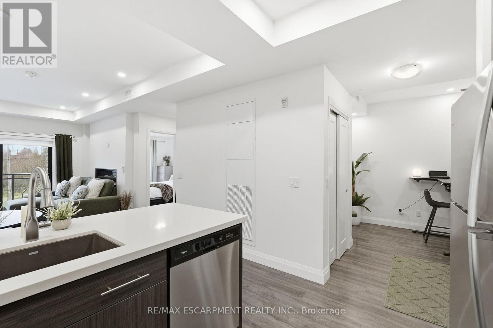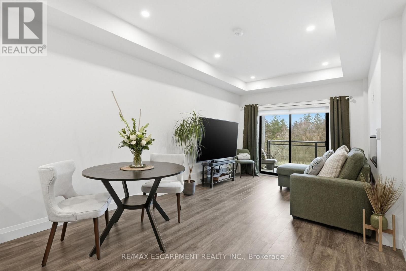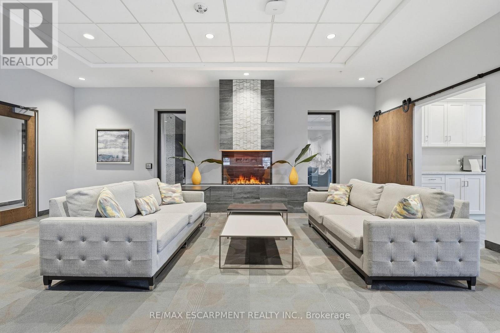 Tucked on a quiet, mature side street in sought-after Waterdown, this stylish south-facing 1-bedroom + Den suite with 1 garage parking and locker at "The View" offers you a rare blend of peaceful surroundings and walkable convenience. Just steps to the quaint downtown core, local shops, and the scenic trails and lookout points along the Niagara Escarpment, the location feels both connected and tucked away. From inside the well-cared for Unit 201, you'll enjoy tranquil views of trees that create a true sense of calm. Thoughtfully designed, the suite features a versatile den ideal for a home office or hobby room, a spacious dining area that can accommodate a full table set, a spacious living room with a wall-mounted electric fireplace, and a private balcony to enjoy. The kitchen is well-appointed with white quartz countertops, stainless steel appliances, and a generous peninsula for everyday living and entertaining. The bedroom easily fits a complete furniture set, while the spa-like bathroom offers a tiled walk-in shower, linen storage, large floating vanity, and a laundry machine closet. This well-maintained 6-year-old building feels like an extension of your home, with concierge/security staff that know your name, a fully equipped gym, expansive party room w prep kitchen, cozy lounge, 6th floor terraces w seating and wonderful views, a pet spa, EV parking, and lots of parking for your guests. While being a quick drive to major highways, GO Stations and major shopping centers; your new home awaits in Unit 201, a peaceful, well-designed suite in Waterdown's most modern yet charming settings. (id:4555)