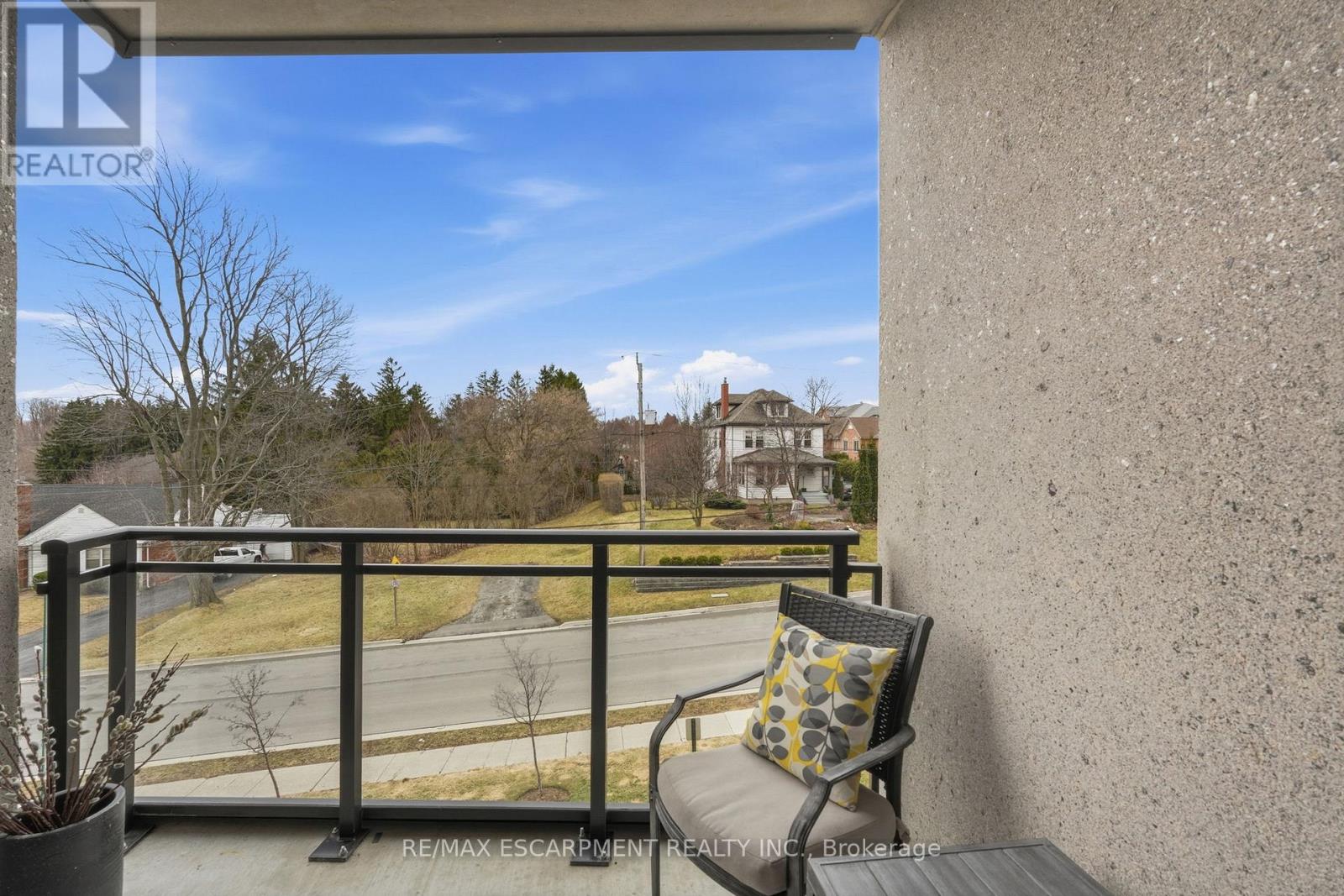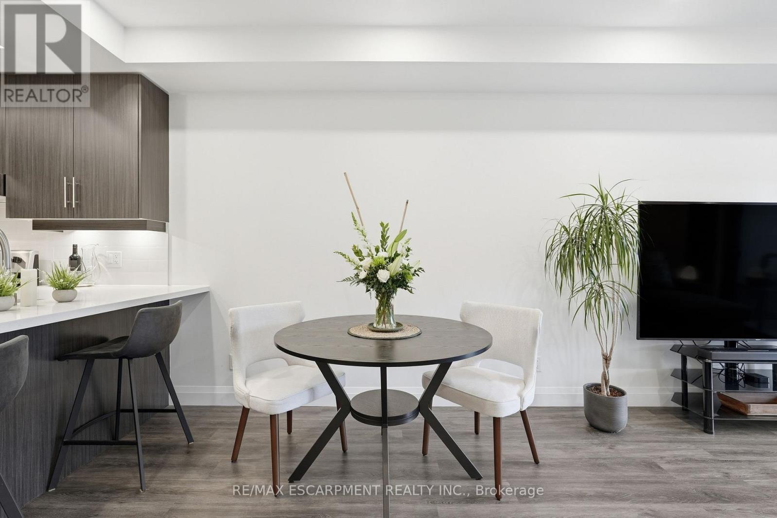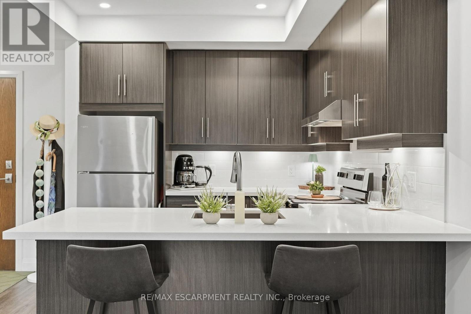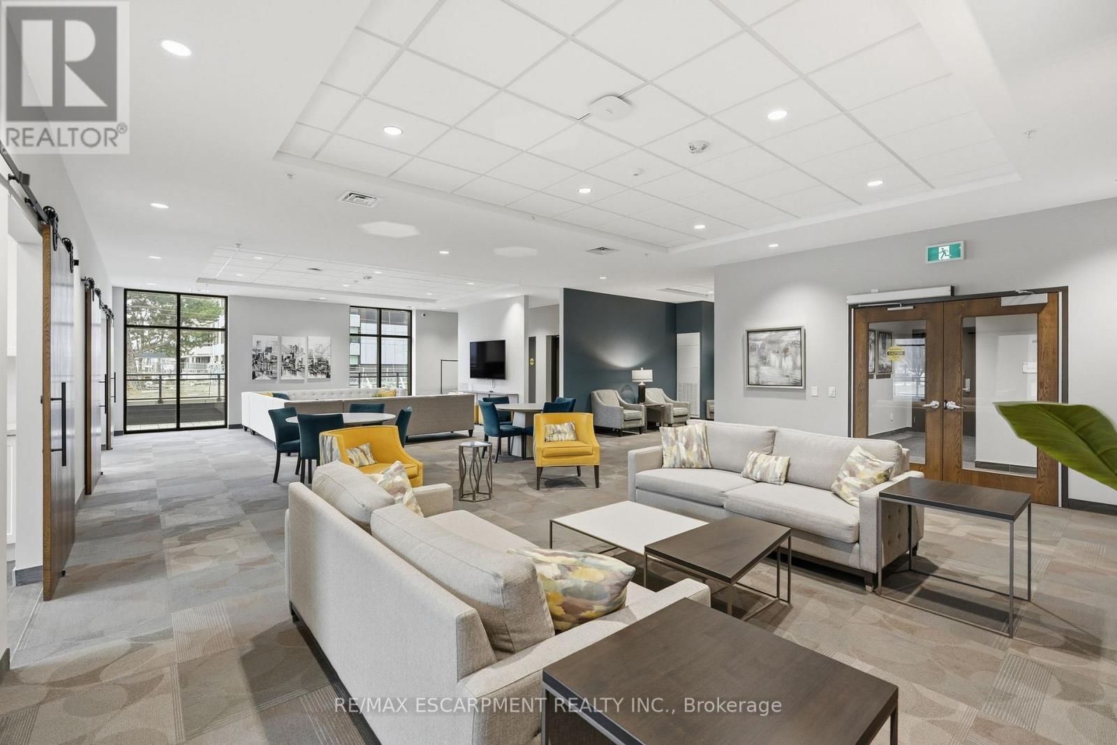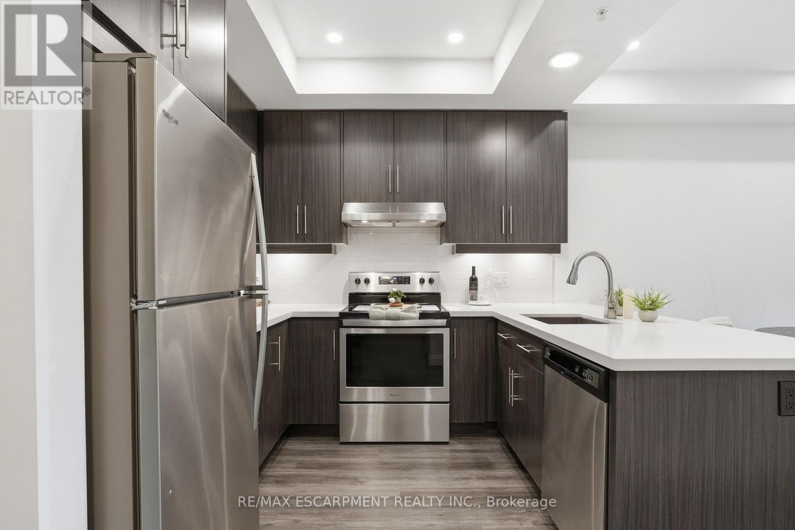 Tucked on a quiet, mature side street in sought-after Waterdown, this stylish south-facing 1-bedroom + Den suite with 1 garage parking and locker at "The View" offers you a rare blend of peaceful surroundings and walkable convenience. Just steps to the quaint downtown core, local shops, and the scenic trails and lookout points along the Niagara Escarpment, the location feels both connected and tucked away. From inside the well-cared for Unit 201, you'll enjoy tranquil views of trees that create a true sense of calm. Thoughtfully designed, the suite features a versatile den ideal for a home office or hobby room, a spacious dining area that can accommodate a full table set, a spacious living room with a wall-mounted electric fireplace, and a private balcony to enjoy. The kitchen is well-appointed with white quartz countertops, stainless steel appliances, and a generous peninsula for everyday living and entertaining. The bedroom easily fits a complete furniture set, while the spa-like bathroom offers a tiled walk-in shower, linen storage, large floating vanity, and a laundry machine closet. This well-maintained 6-year-old building feels like an extension of your home, with concierge/security staff that know your name, a fully equipped gym, expansive party room w prep kitchen, cozy lounge, 6th floor terraces w seating and wonderful views, a pet spa, EV parking, and lots of parking for your guests. While being a quick drive to major highways, GO Stations and major shopping centers; your new home awaits in Unit 201, a peaceful, well-designed suite in Waterdown's most modern yet charming settings. (id:4555)