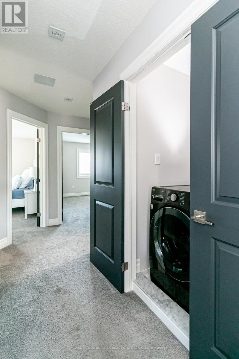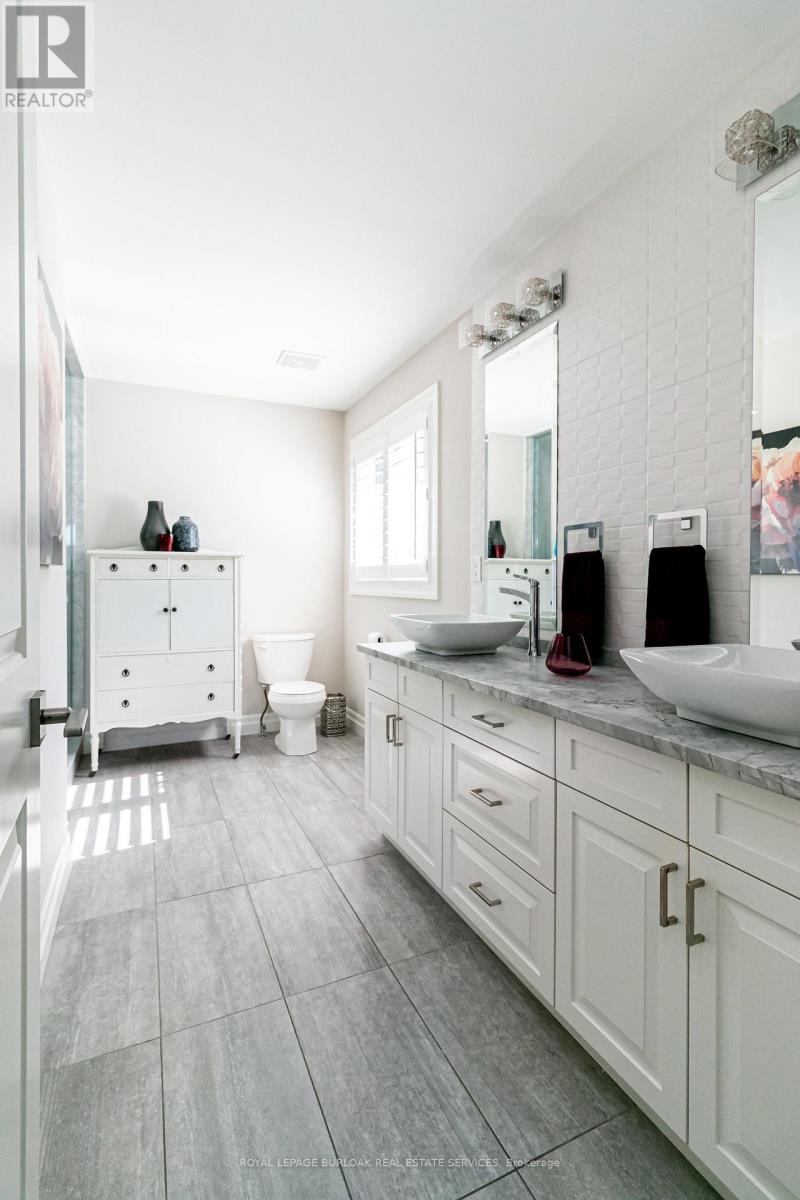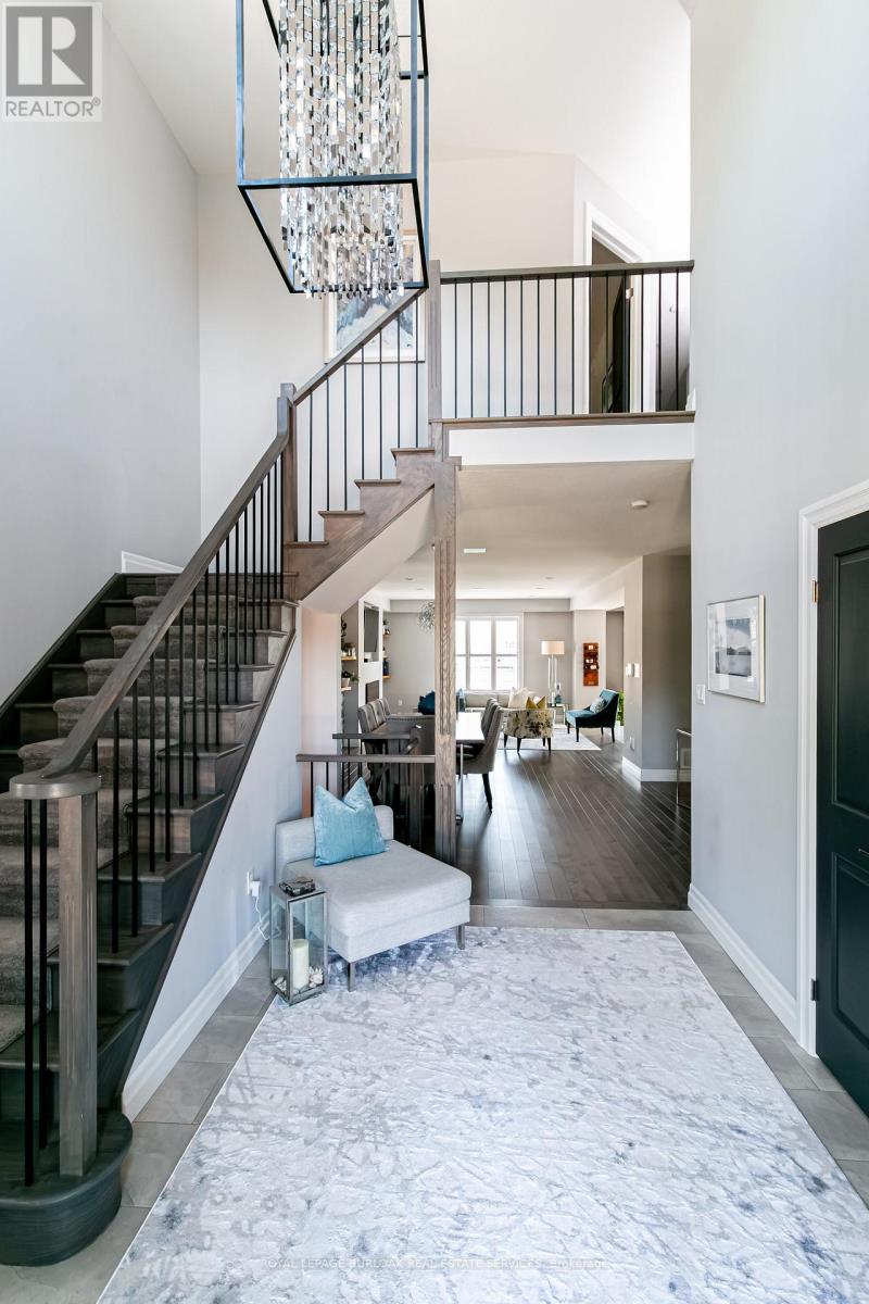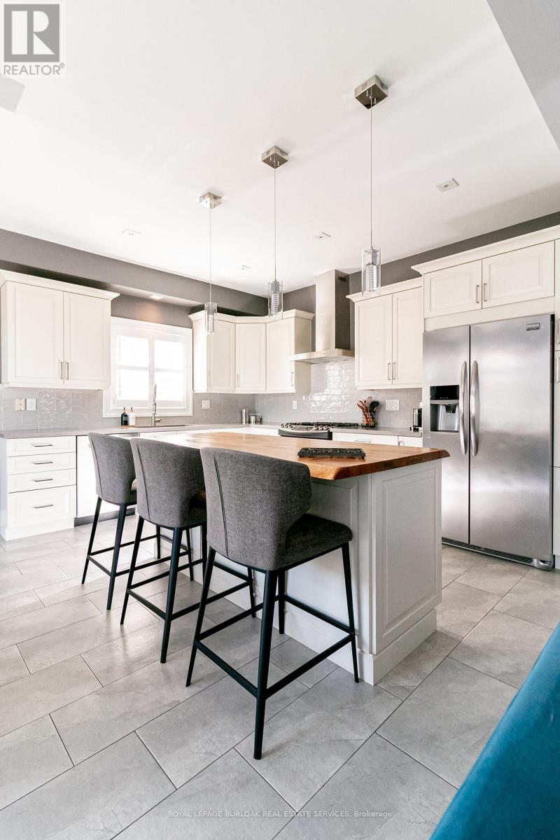 Welcome to this breathtaking Galli Custom-Built 4+1 bedroom, 4-bathroom home offering a coveted corner lot in the sought-after Gilbert neighbourhood on the Hamilton Mountain. Showcasing timeless elegance, and premium finishes, this home blends modern luxury with everyday comfort. A rare triple-car garage with roll-through access to the backyard, an exposed aggregate driveway and patio, and professionally landscaped grounds with multiple areas to relax and entertain create a standout exterior. Bathed in natural light from three sides, the home enjoys a bright, airy feel with views of surrounding greenery. Inside, a soaring two-storey loft foyer with a grand chandelier sets the tone. The open-concept main floor features a formal dining area and a sophisticated living room with a stone accent wall, electric fireplace, floating wood shelves, and a built-in media niche. The stunning custom kitchen is complete with stainless steel appliances, beveled grey subway tile backsplash, and a striking live-edge maple island. Upstairs, four spacious bedrooms offer comfort and functionality, most with walk-in closets and two with private ensuites. The primary retreat features a spa-like ensuite with an oversized glass shower and double vanity, while a separate full bath with a tub serves the remaining bedrooms. A second-floor laundry room, complemented by an additional lower-level laundry, adds convenience for busy or multigenerational households. The fully finished lower level is designed for entertaining, offering a spacious great room, custom media and home theatre setup, a built-in framed aquarium, an additional bedroom, and bathroom. Additional highlights include upgraded lighting throughout, a built-in speaker system, and a security system. Ideally located steps to parks and minutes from the Lincoln M. Alexander Parkway, QEW, Ancaster Meadowlands, and top amenities, this turnkey home offers an elevated lifestyle in one of Hamilton Mountain's most desirable communities. (id:4555)