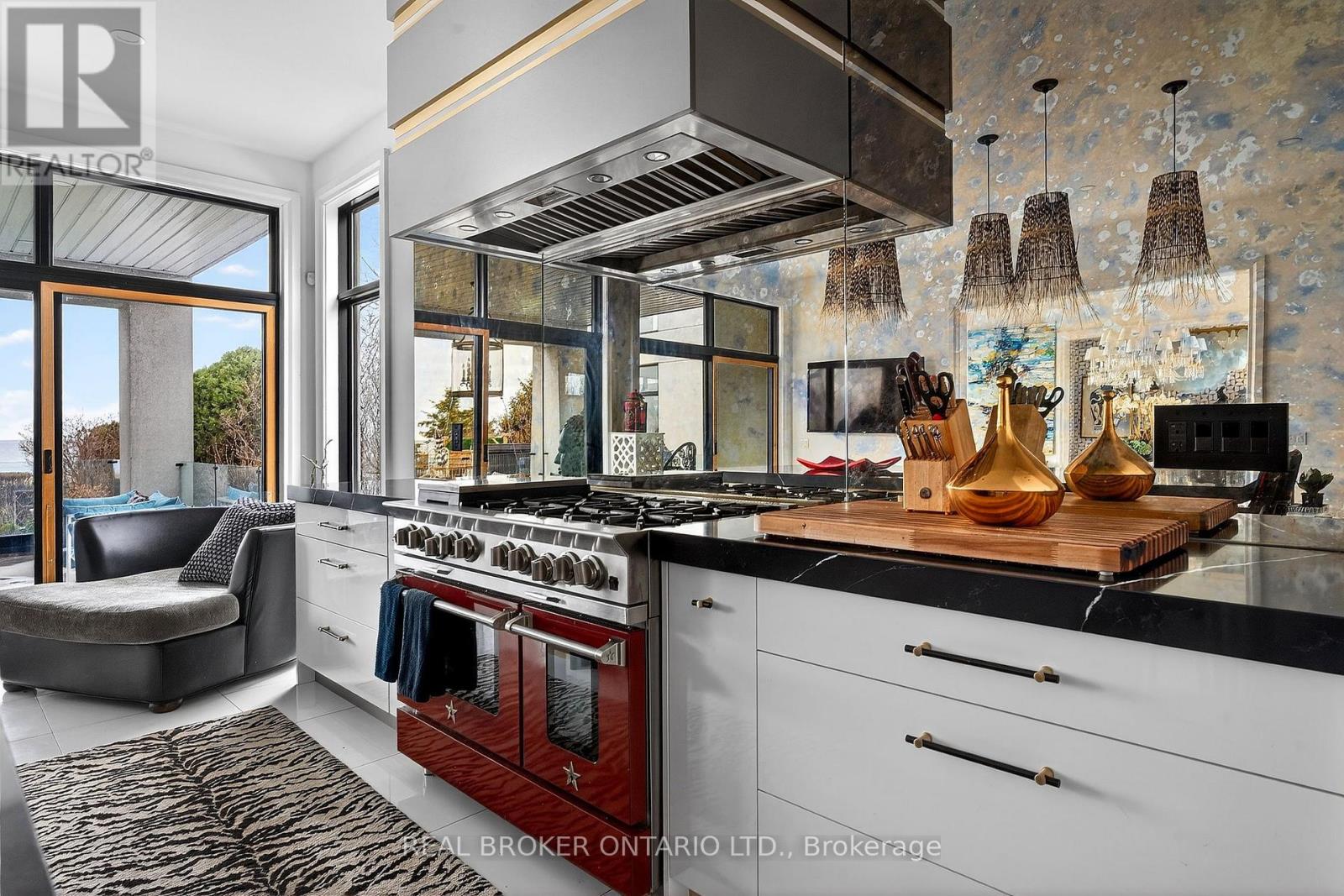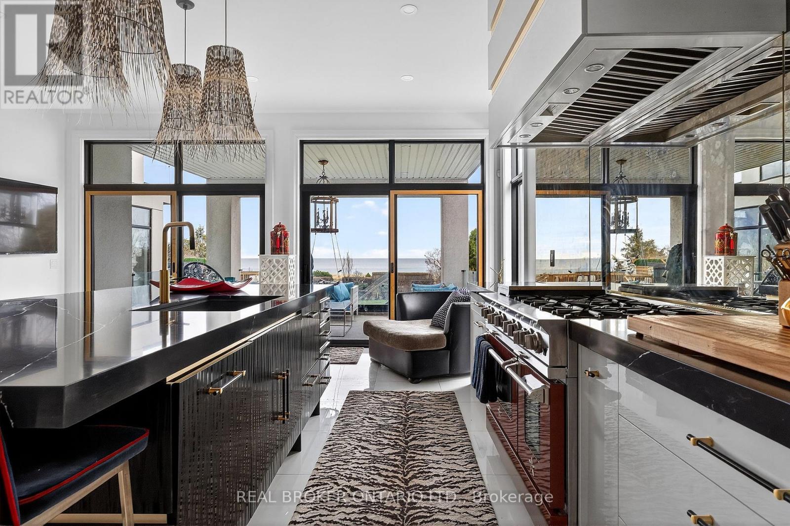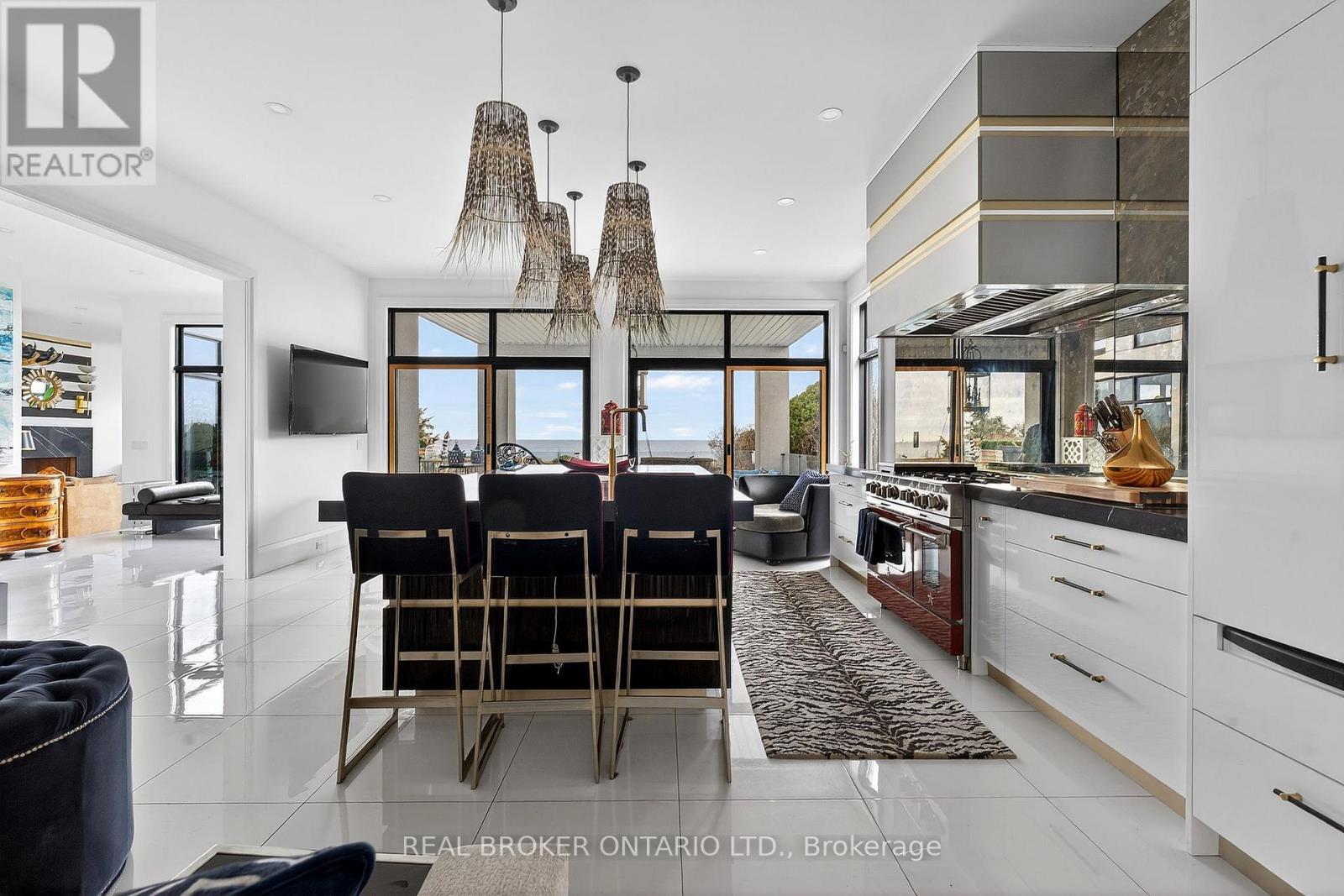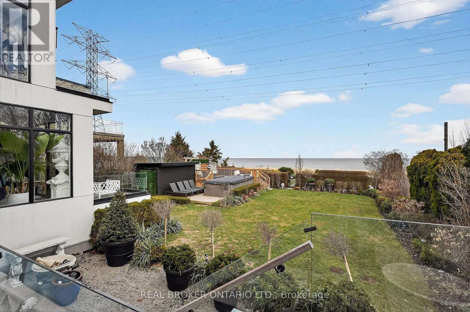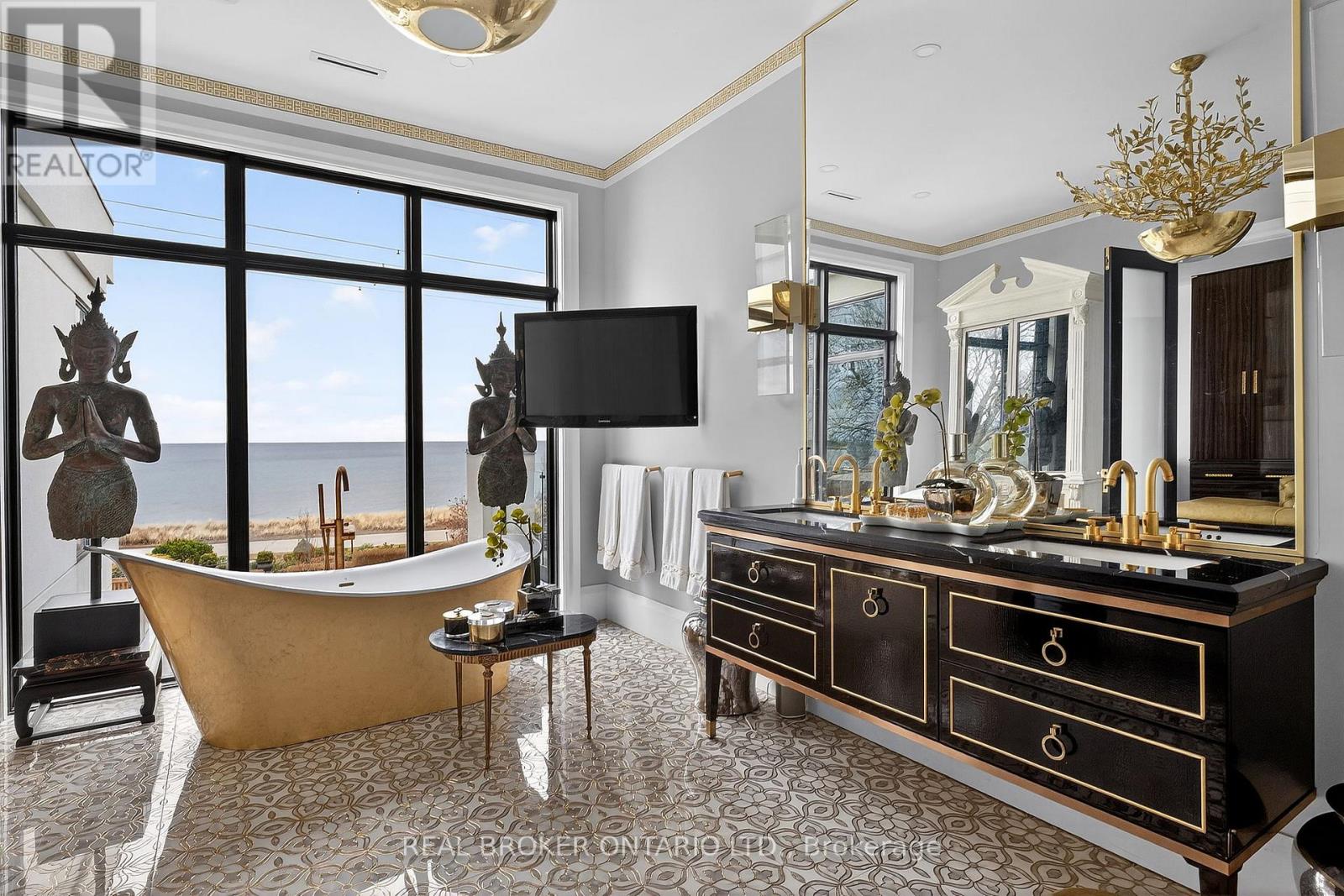 DIRECT WATERFRONT LUXURY. Experience refined lakeside living at 711 Beach Blvd, a 6,700+ sq ft custom masterpiece (2020) situated directly on the 10km Hamilton Waterfront Trail with private beach access. This 3+2 bed, 5 bath sanctuary blends architectural grit with coastal elegance.10' ceilings, bespoke millwork, and hand-cut marble inlays. The grand foyer features a showstopping chandelier of 600 gold spoons and Swarovski accents. A true Chef's kitchen boasts an 8-burner range, dual dishwashers & fridges and a dedicated coffee/bar room overlooking the lake.The primary suite offers a double-sided fireplace and a spa-style bath with a signature gold soaking tub. The lower level adds a gym, media room, and 2 extra bedrooms/offices.4 Duradek terraces, a Jacuzzi swim spa, and professional landscaping on a lot that widens to 72' at the water. Double garage with lift potential + parking for 6. A rare, high-design sanctuary on the shores of Lake Ontario. (id:4555)