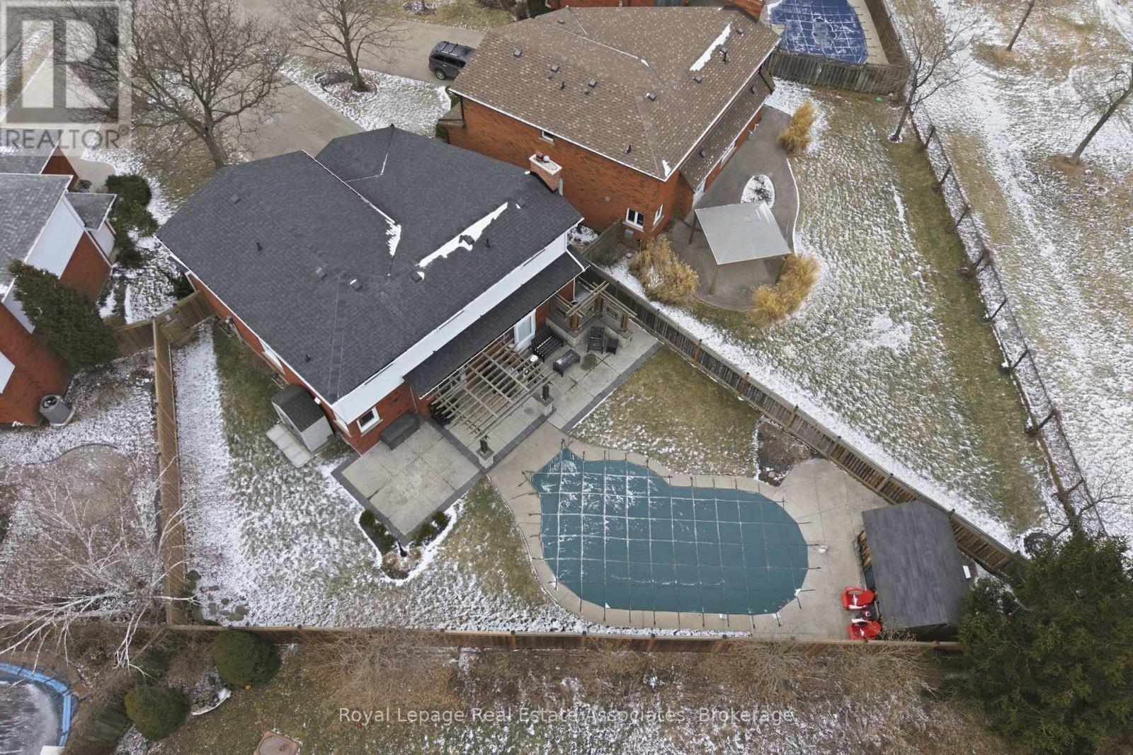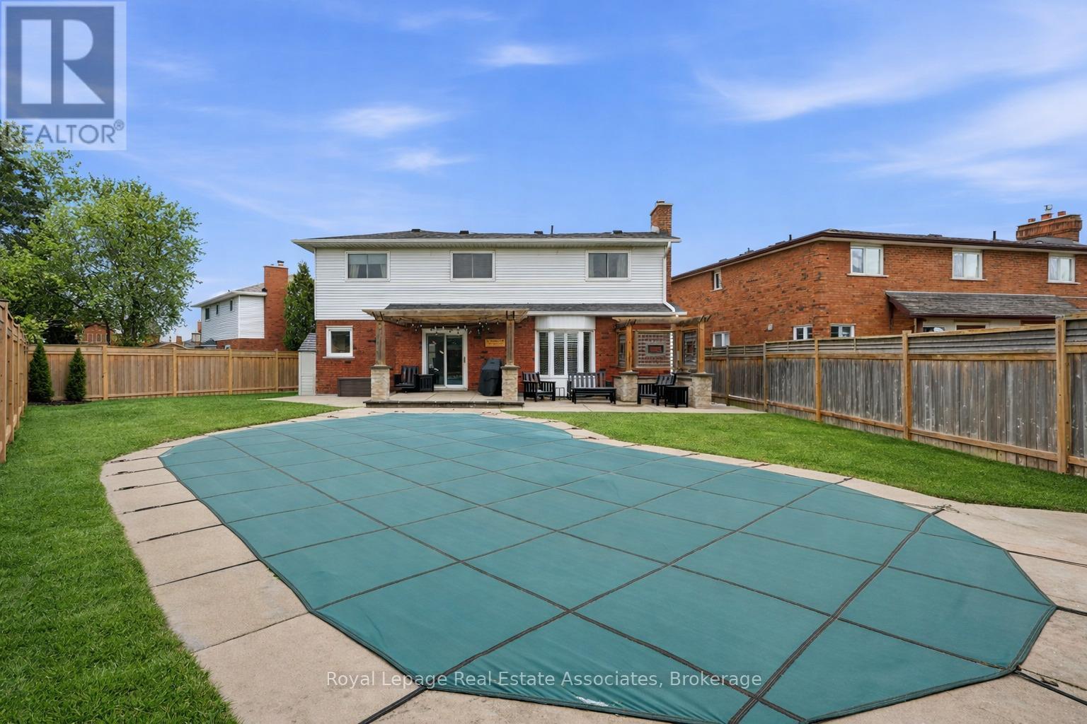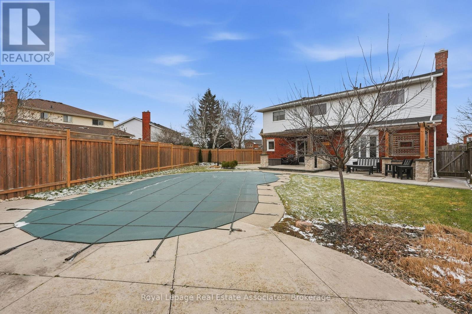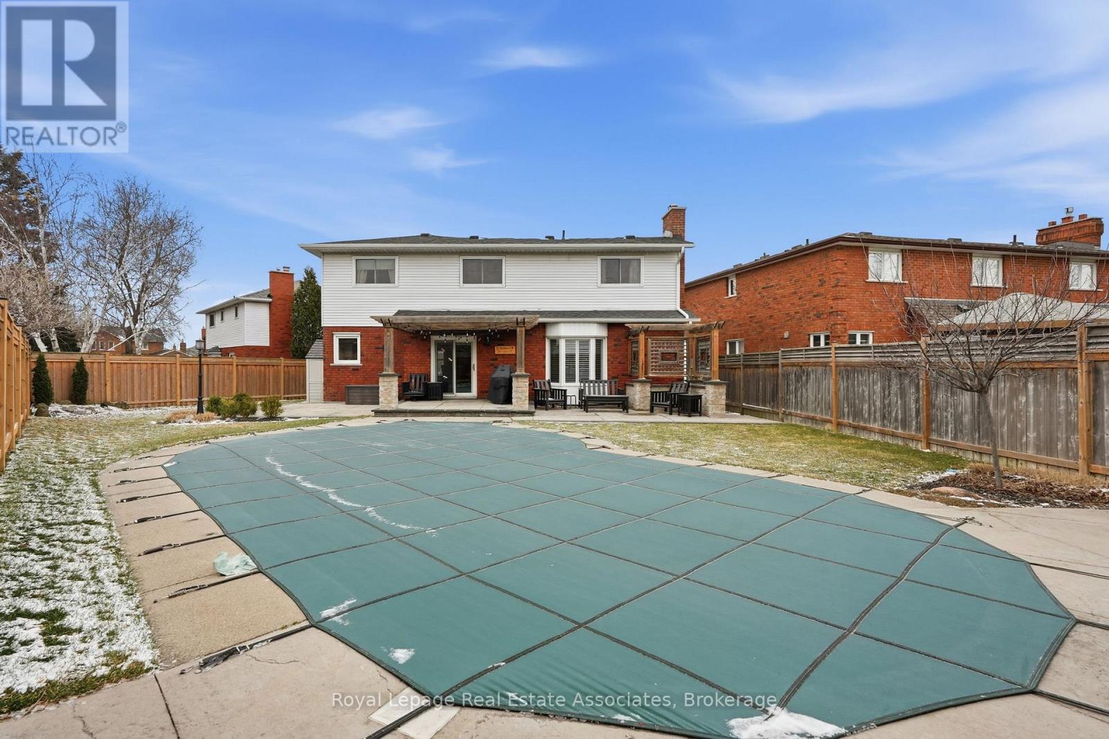 Welcome to 9 Waldorf Court! A classic brick two storey family home tucked away on a quiet court beside Thorner Park. This spacious property offers a double car garage, 4+1 bedrooms, and 2 full plus 2 half bathrooms. The main floor features two comfortable living spaces, hardwood flooring throughout, and a bright eat in kitchen with quartz counters, sleek white cabinetry, and a gas stove. A separate dining room creates the perfect setting for family gatherings. Upstairs, the primary suite includes a beautifully updated ensuite and his and hers closets, along with three additional well sized bedrooms. The finished basement adds even more living space with an entertainment and bar area, an extra bedroom, a crafts room, and plenty of storage. Step outside to enjoy the private backyard with a concrete deck, wood pergola, gas line for the BBQ, and an inground heated pool with a brand new liner, all set on a pie shaped lot with a generous side yard that is perfect for summer lawn games. The backyard also features two sheds, multiple sitting areas, and excellent privacy to enjoy warm summer days. Conveniently located close to shopping and highway access, this is a fantastic opportunity to settle into a well maintained home in a family friendly neighbourhood. (id:4555)