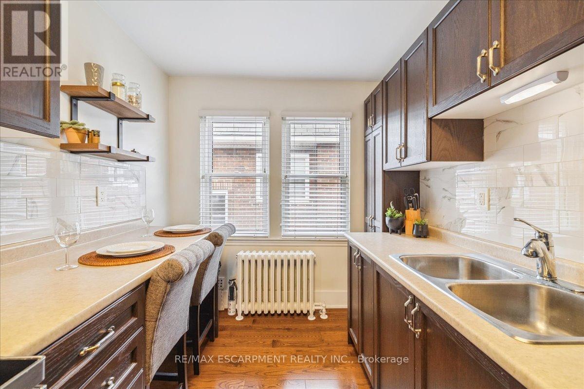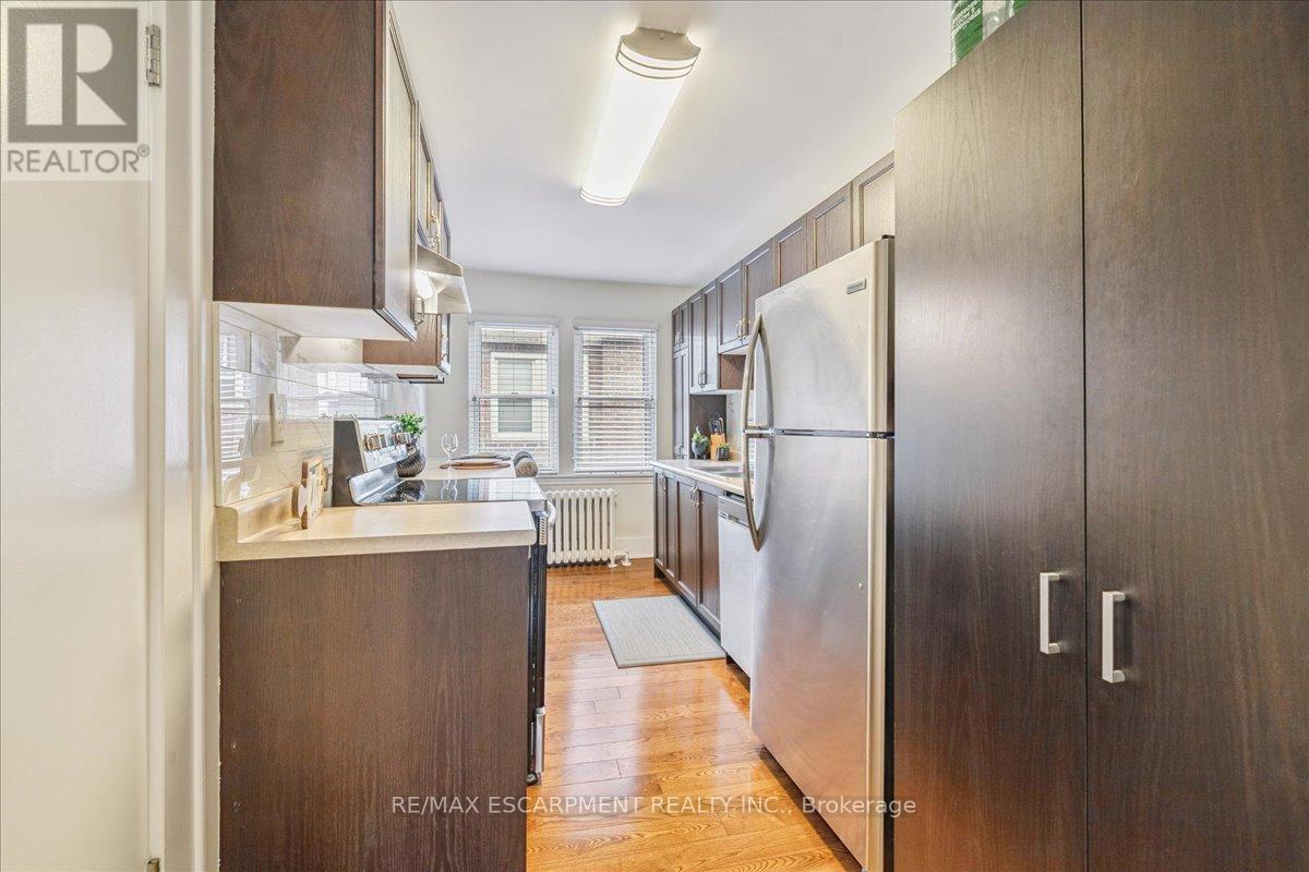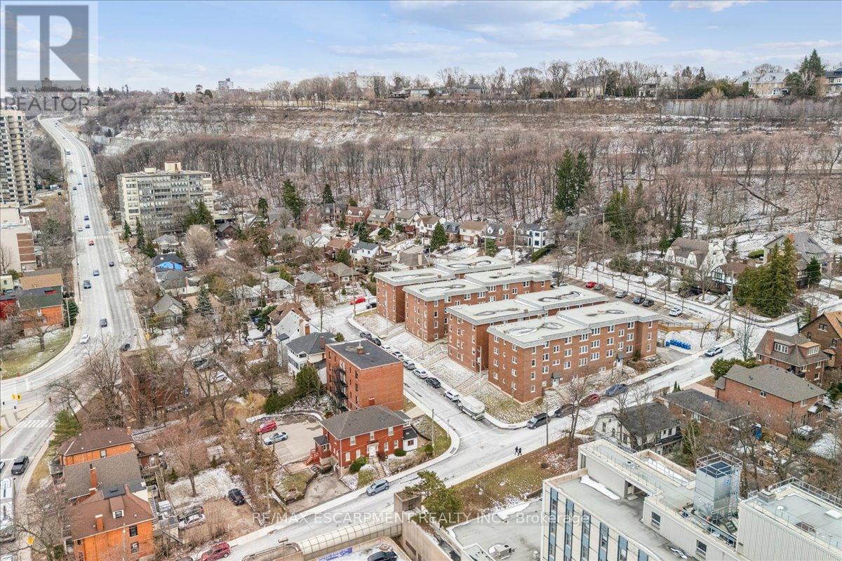 This spacious one-bedroom condominium offers approximately 892 square feet of comfortable living in Hamilton's sought-after Durand neighbourhood. Renovated in 2019 with new hardwood flooring, windows, kitchen and bathroom! New backsplash and light fixtures in the last 3 years. This bright and functional layout indudes a generous living and dining area, a dedicated den, currently used as an office space but could be used as a second bedroom, a full eat-in kitchen, in-suite laundry, and a well-sized bedroom featuring two closets. Situated in a solid brick building, the unit provides a quiet and established setting while being just steps from downtown, hospitals, parks, public transit, and everyday amenities. An excellent opportunity for first-time buyers, downsizers, or investors looking for a centrally located, walkable lifestyle. (id:4555)