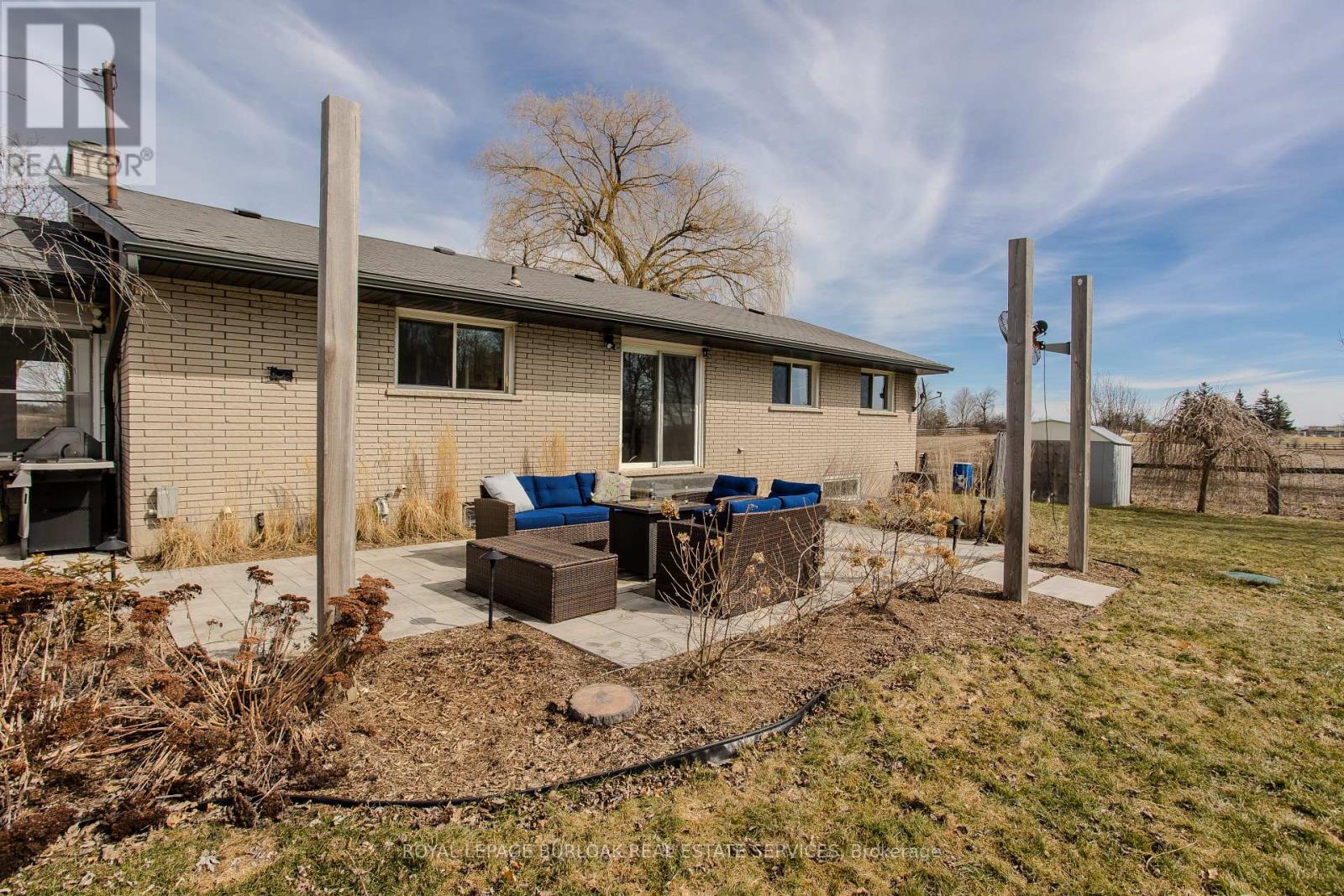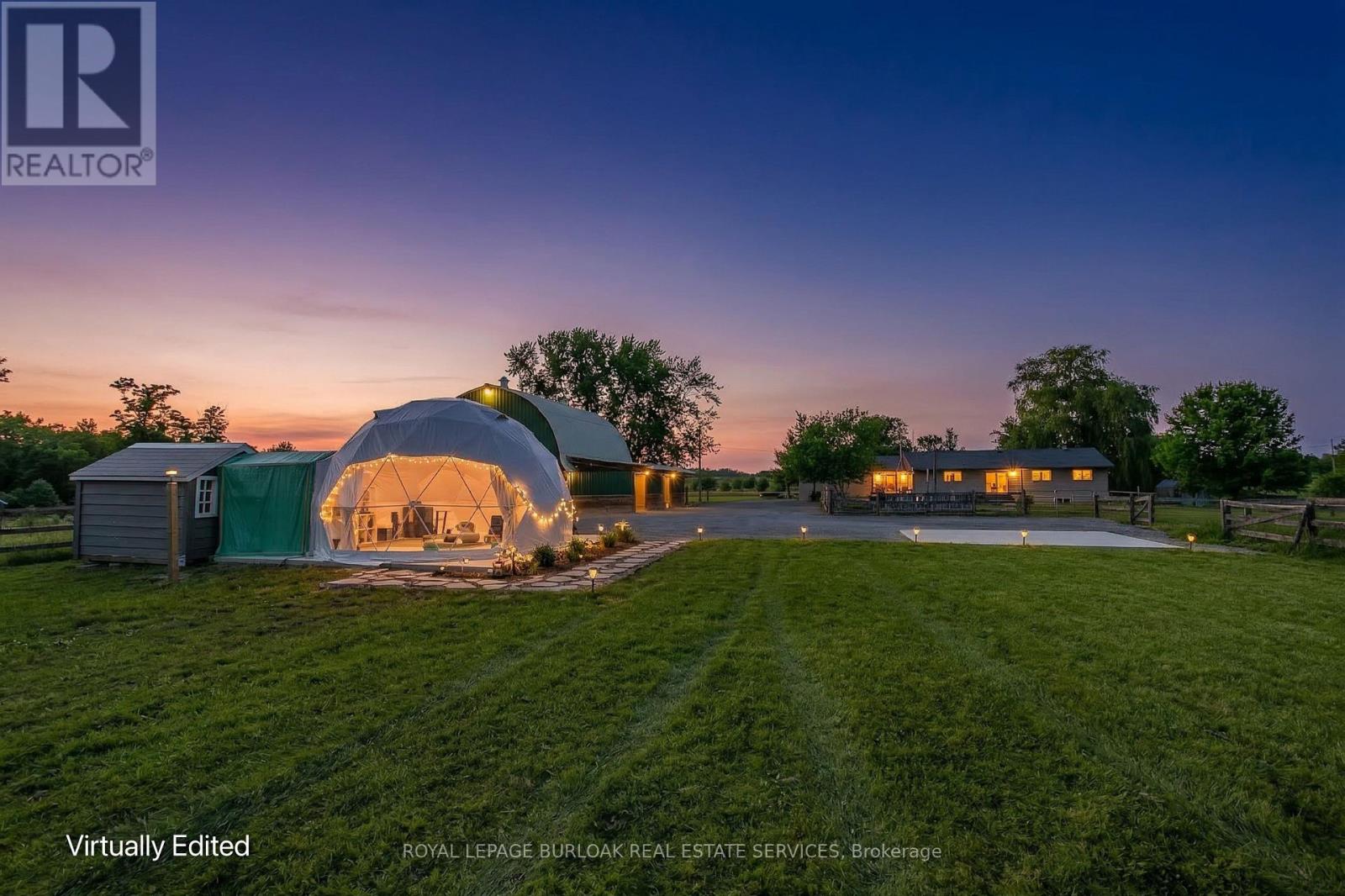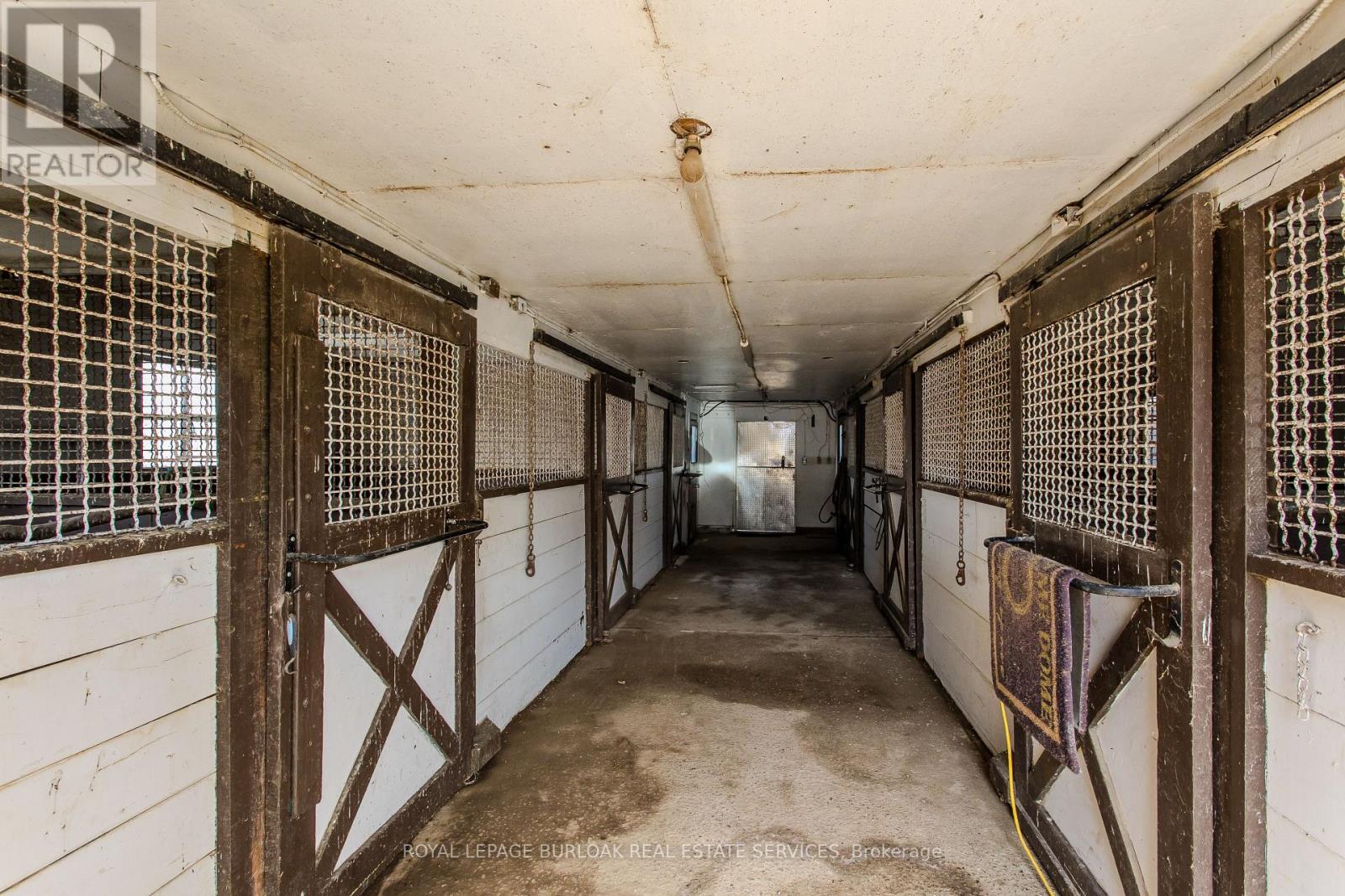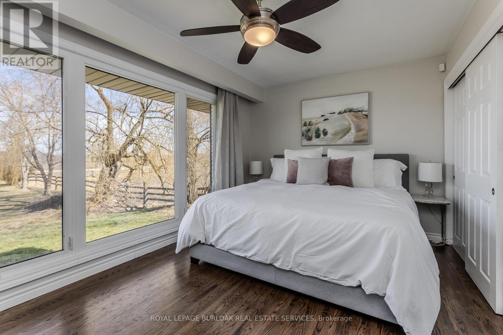 Experience peak rural hobby farm living on this breathtaking property designed for those who value space, nature, and lifestyle. Set on a picturesque lot just under 12 acres with access to beautiful nature trails, this remodelled ranch-style bungalow offers the ideal balance of modern comfort and tranquility-ideal for horse or nature enthusiasts, all within a short drive to both downtown Binbrook and Hamilton. Arrive home to a newly expanded double-lane driveway with parking for 20 cars, framed by 8 blazing autumn maple trees. A creek flows through the front yard and connects to a peaceful pond, complete with upgraded LED lighting for magical winter evenings skating. Inside, the home has been thoughtfully updated with new engineered hardwood throughout the main level. The inviting living room features an oversized window with motorized blinds, fireplace, and custom built-in media wall. The luxurious kitchen showcases Cambria countertops, tile backsplash, custom cabinetry, new SS appliances, and a dining area accented by elegant wall paneling and walkout access to the backyard. The serene primary bedroom features wall-to-wall windows with stunning views, while 2 additional bedrooms and a 4pc bathroom with dual sink vanity complete the main floor. The finished lower level adds even more living space with new vinyl flooring, spacious rec room, and a family room featuring wood beams, stone feature wall, and fireplace. An additional bedroom and 3pc bathroom with oversized glass shower offer flexibility for guests or family. Outdoors, the property truly shines. Enjoy a 600sf Permacon paver patio, Douglas fir shade structures w/ UV sails, putting green, landscape lighting, perennial gardens, and expansive green space. Trails lead through a 2-acre forest, while the horse barn offers 6 stalls, hay mow, a 50-amp RV plug, and fenced paddocks & pastures ready for your horses. Don't miss this true rural gem. (id:4555)