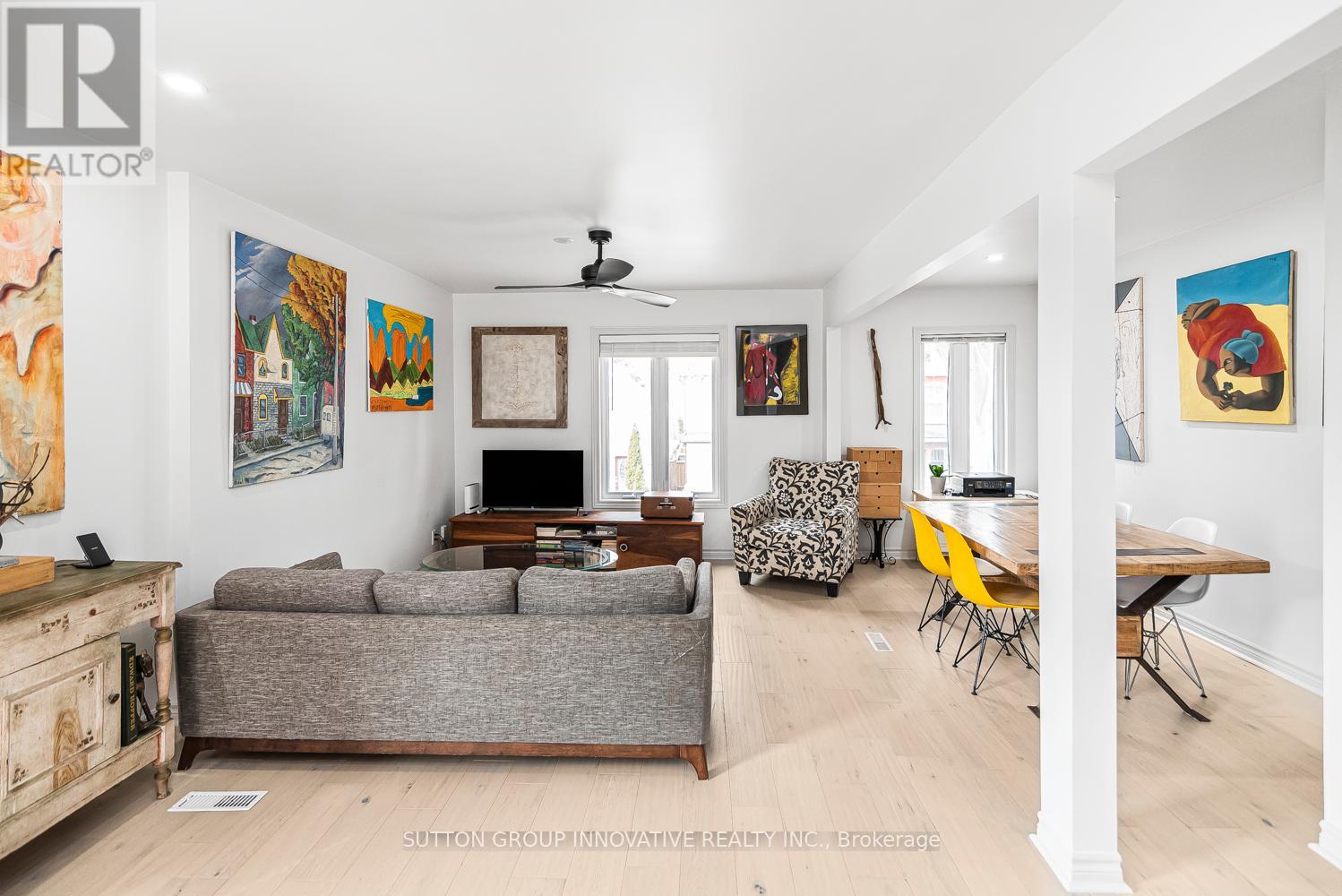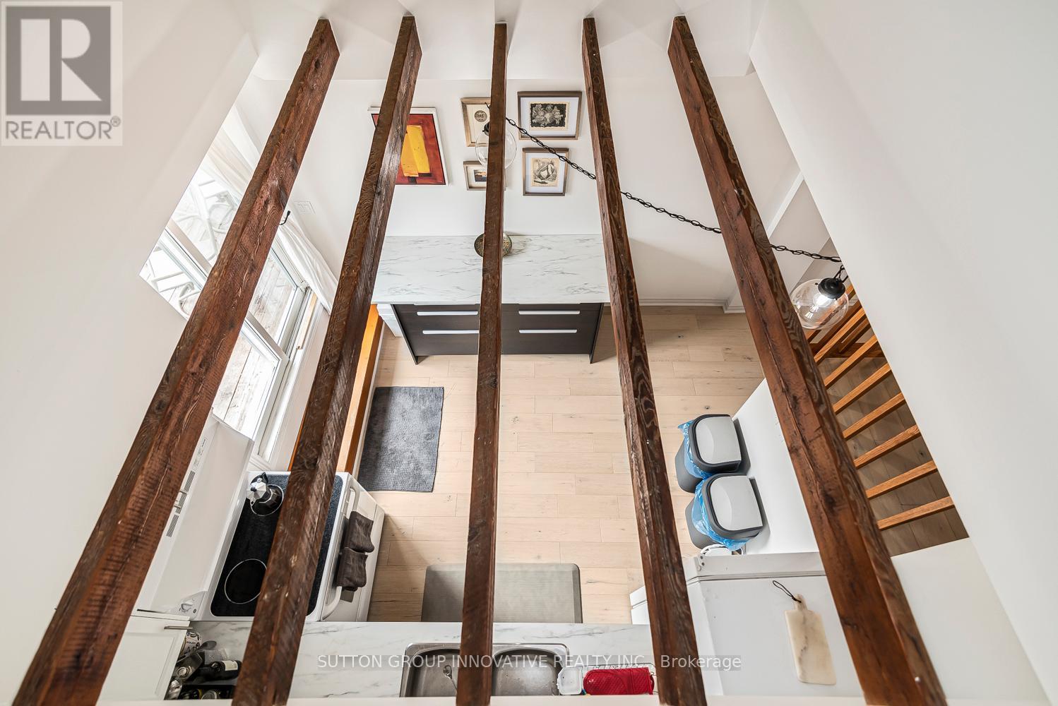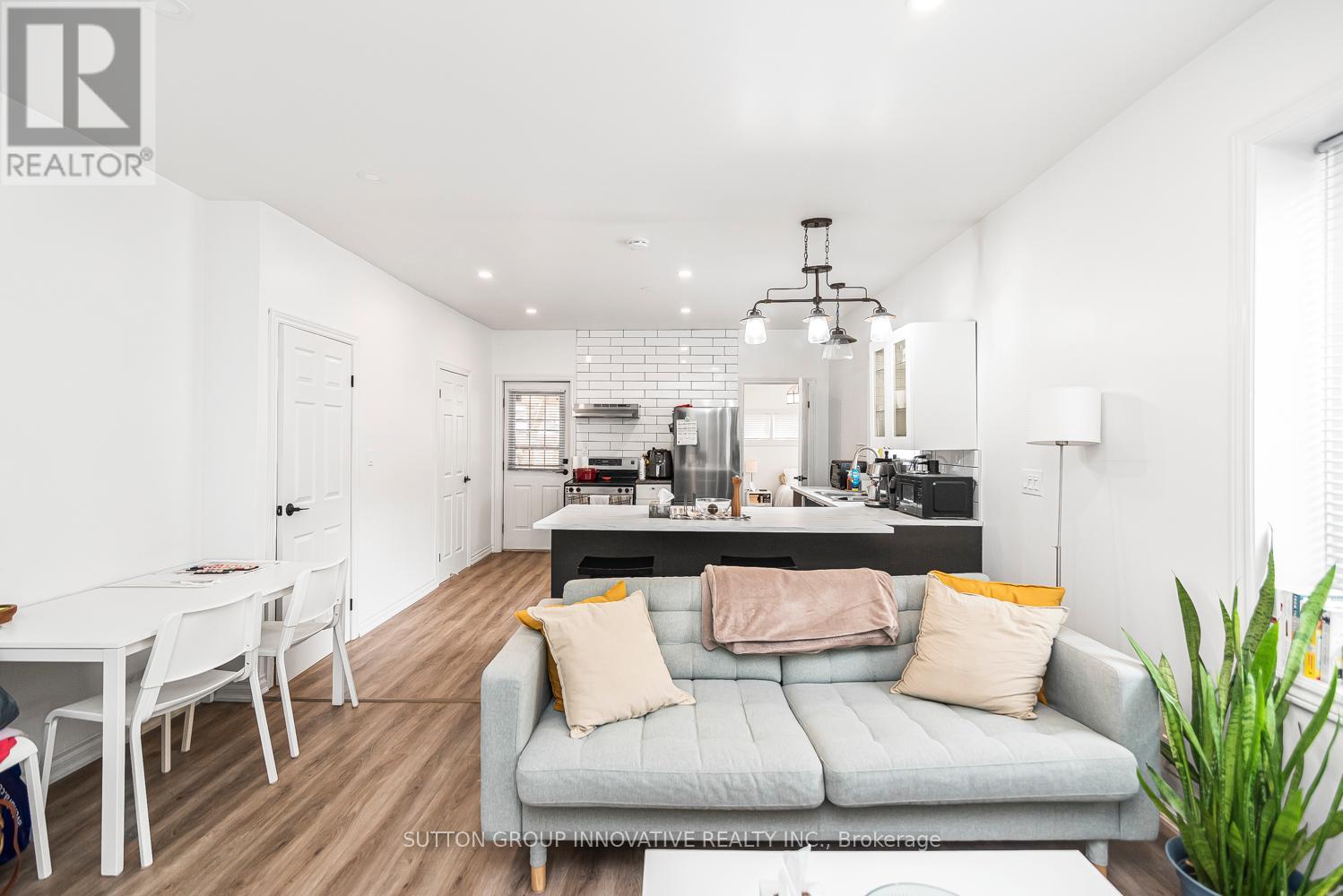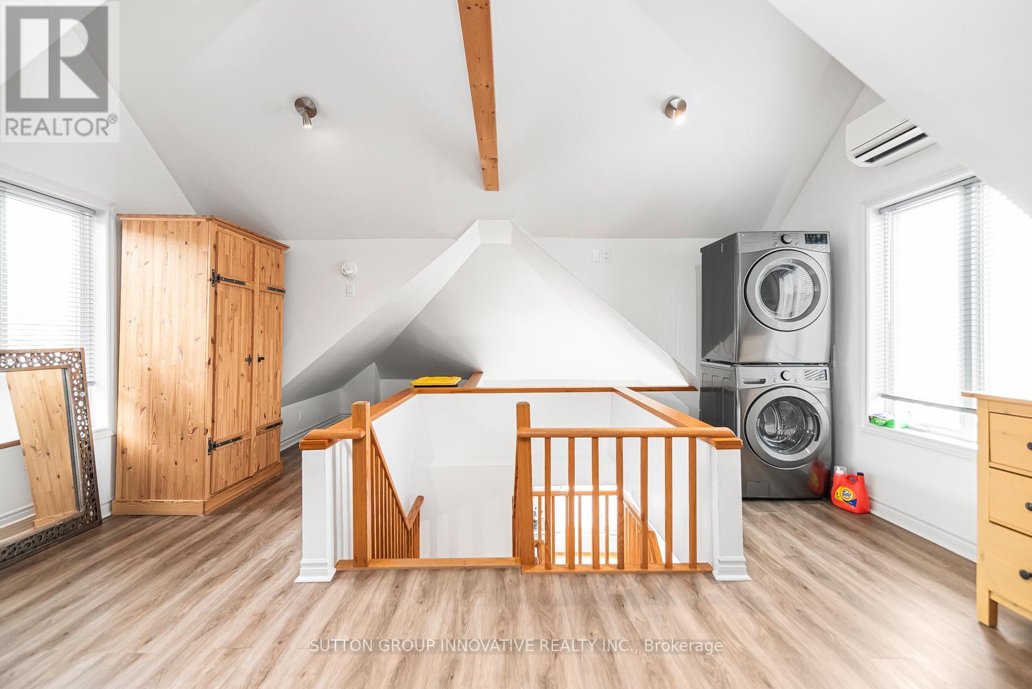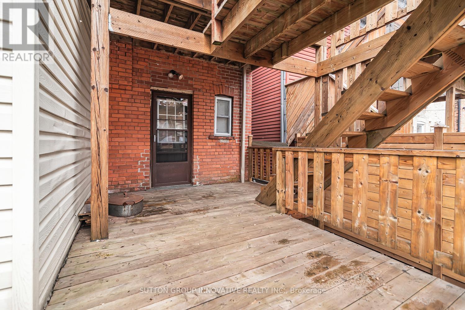 Two family home set up with separate entrances and separate hydro, offering flexibility for investors or buyers looking to live in one unit and use the other for extended family or income potential.Main floor unit is currently rented and features 2 bedrooms, open-concept kitchen with eating area and living room, 3-piece bathroom, and in-unit laundry. 9.5 ft ceilings and tall windows add to the sense of space, and the kitchen offers a walk out to the backyard deck. Upper unit spans the second and third floors with open-concept kitchen, dining, and living area. The 2nd floor kitchen features exposed wood beams and walks out to a generous deck with fire escape. Third-floor loft features a spacious primary bedroom with vaulted ceiling, exposed beams, heat pump for heating and cooling, and laundry.Updated flooring, freshly painted, and tasteful lighting fixtures throughout. Furnace and water heater approximately 4 years old. Unfinished basement.Double detached garage off alley plus 2-car interlocking driveway at the front. Ample green space in fully fenced backyard.Located in West Hamilton on a family-friendly street, just minutes to Locke Street shops, restaurants, and cafés, Dundurn Castle, the waterfront, and McMaster University, with convenient access to transit and major routes. (id:4555)