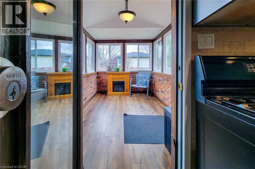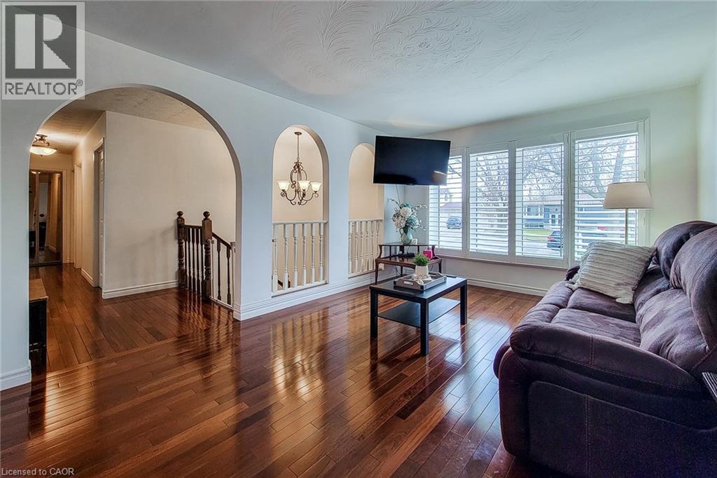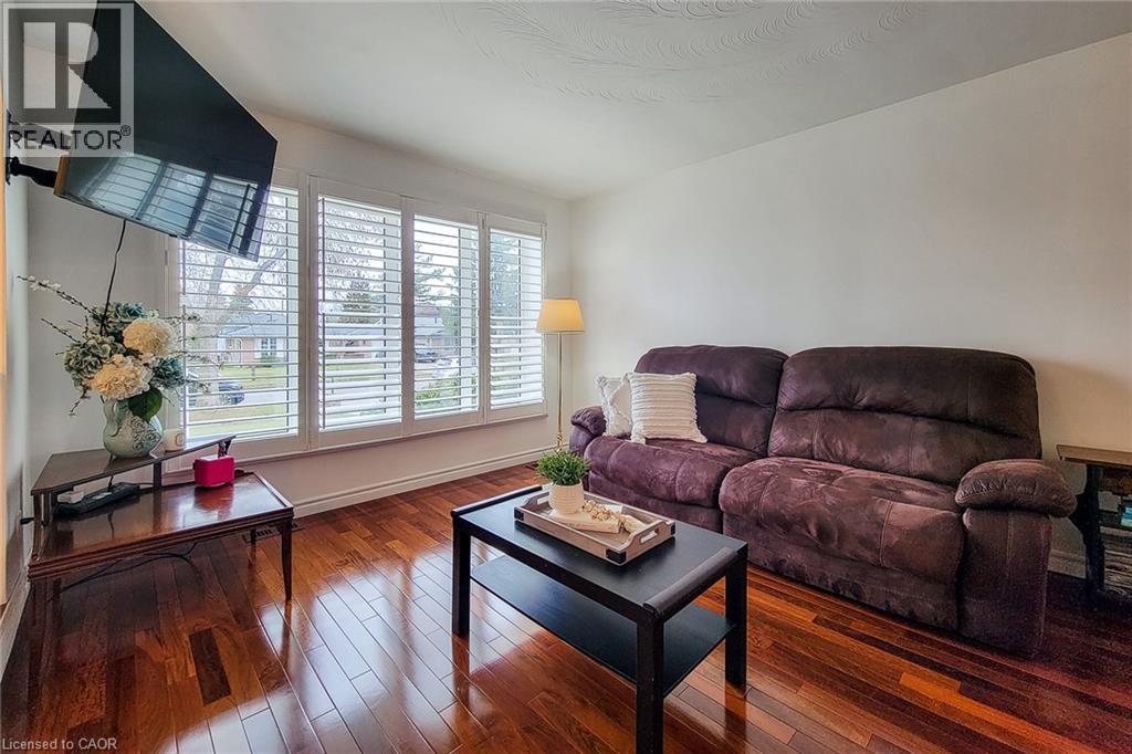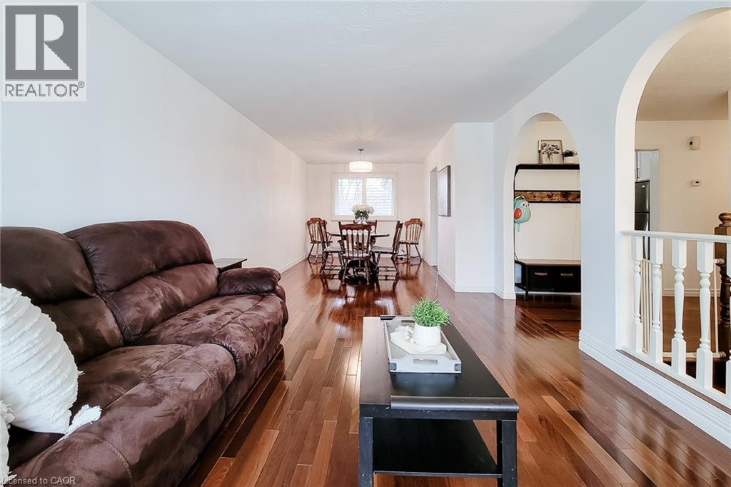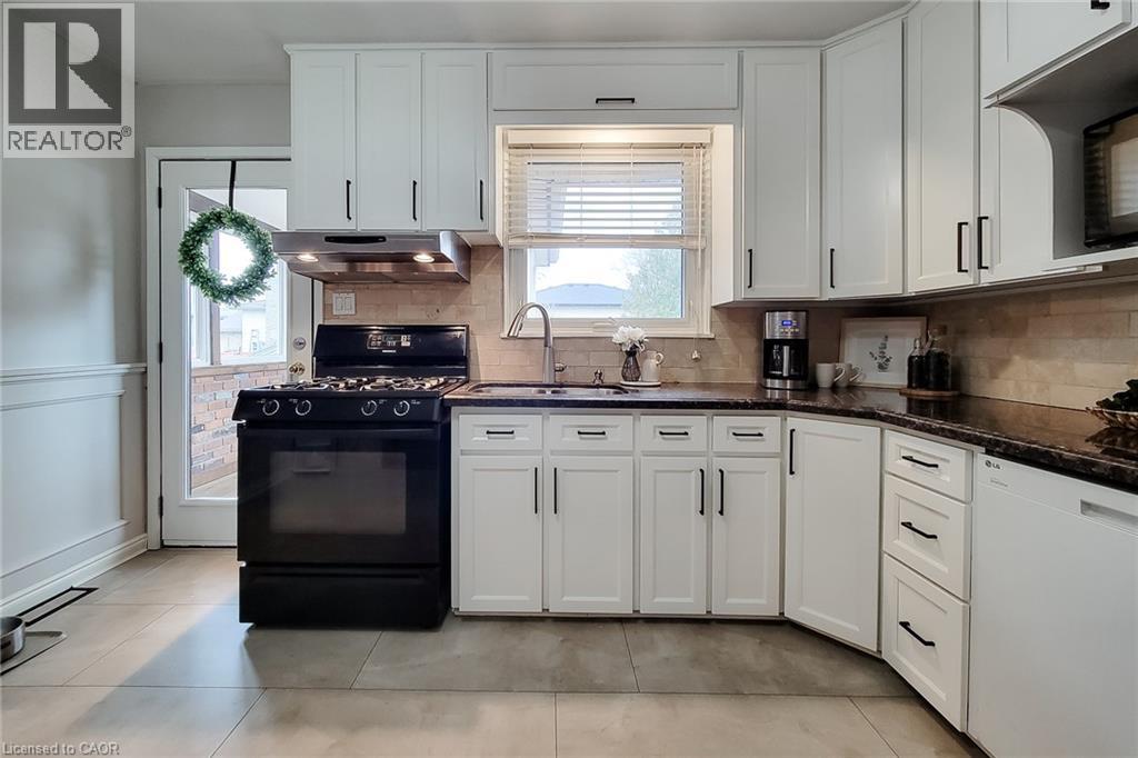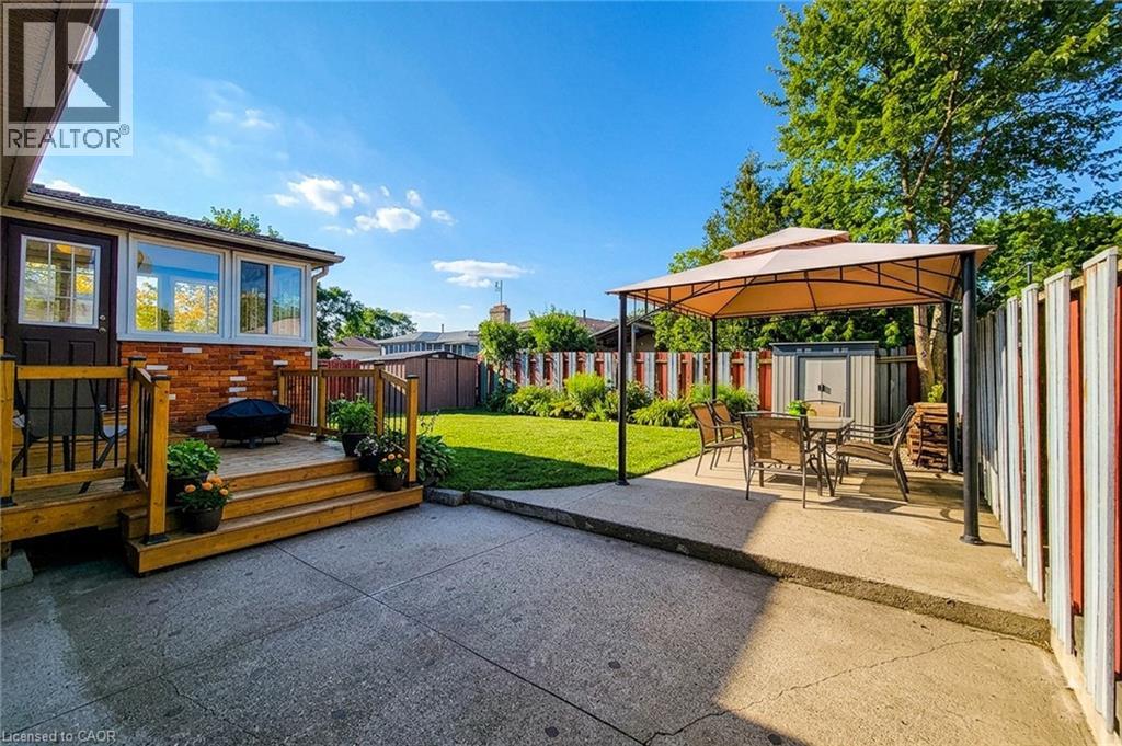 Welcome to this beautifully maintained raised ranch bungalow nestled in a quiet, family-friendly court in desirable Stoney Creek—where kids play, neighbours connect, and lasting memories are made. Offering just over 1,150 sq ft of bright, functional living space, this home features gleaming hardwood floors, California shutters, and a spacious open-concept living and dining area filled with natural light from large windows. The updated kitchen includes a brand new dishwasher and flows seamlessly into a sunroom addition, creating the perfect space to relax and enjoy views of the backyard. The main level offers three generously sized bedrooms and beautifully updated bathrooms finished in a modern white palette with stylish black accents. The raised ranch design provides a bright, fully finished lower level featuring a cozy family room with a wood-burning fireplace, an additional bedroom or office space, laundry, and ample storage. The lower level bedroom offers flexibility and can be converted back to a garage if desired. Step outside to your fully fenced backyard retreat, complete with a gazebo, updated deck, and two storage sheds—perfect for entertaining or relaxing. This home also boasts excellent curb appeal with a durable metal roof, new eavestroughs, and a furnace updated in 2025 for added peace of mind. Located within walking distance to schools, parks, and public transit, and just minutes from highway access, this home offers the perfect blend of comfort, convenience, and community. (id:4555)