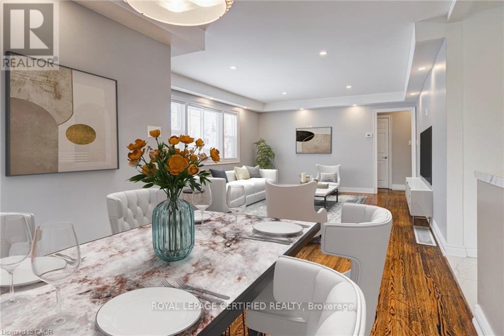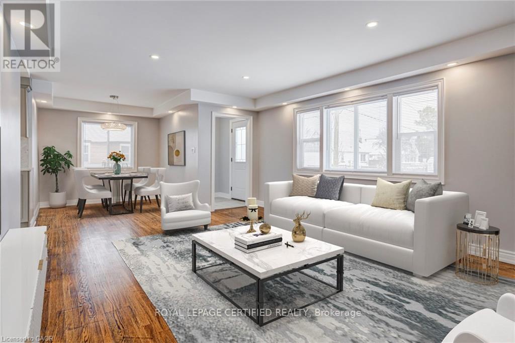 Welcome to this impeccably updated and meticulously maintained 3+2 bedroom raised bungalow, offering a full in-law suite with a separate side entrance and parking for up to five vehicles. Perfectly situated in a quiet family-friendly Hamilton Mountain neighbourhood and close to all amenities, this turn-key home delivers comfort, style, and exceptional versatility for multi-generational living or investment potential. The main level features a bright, open-concept living and dining area enhanced by smooth ceilings, recessed lighting and tasteful modern finishes throughout. The spacious kitchen offers ample cabinetry and convenient in-suite laundry. Three generous bedrooms and an updated 4-piece bathroom complete this level creating an inviting space ideal for families. A private side entrance leads to the beautifully finished lower-level in-law suite designed with comfort and independence in mind. This impressive space includes a large living area, an updated kitchen, two sizable bedrooms with large egress windows, a contemporary 4-piece bathroom with semi-ensuite access and its own oversized laundry area complete with abundant cabinetry and a custom folding counter. Additional highlights include a fully fenced backyard, a recently built custom garden shed, carpet-free interior and a fire suppression sprinkler system for added peace of mind. A rare opportunity in a prime location, move in and enjoy or take advantage of exceptional income and multi-family living options, this home truly has it all. Offering outstanding value, this property boasts an endless list of upgrades including a new roof (2022), new furnace/AC/hot water tank/windows/exterior doors/basement sprinkler system/Type X fire-rated barrier/upgraded attic and exterior wall insulation (2019), updated plumbing and electrical (2016). *** Some images have been virtually staged *** (id:4555)