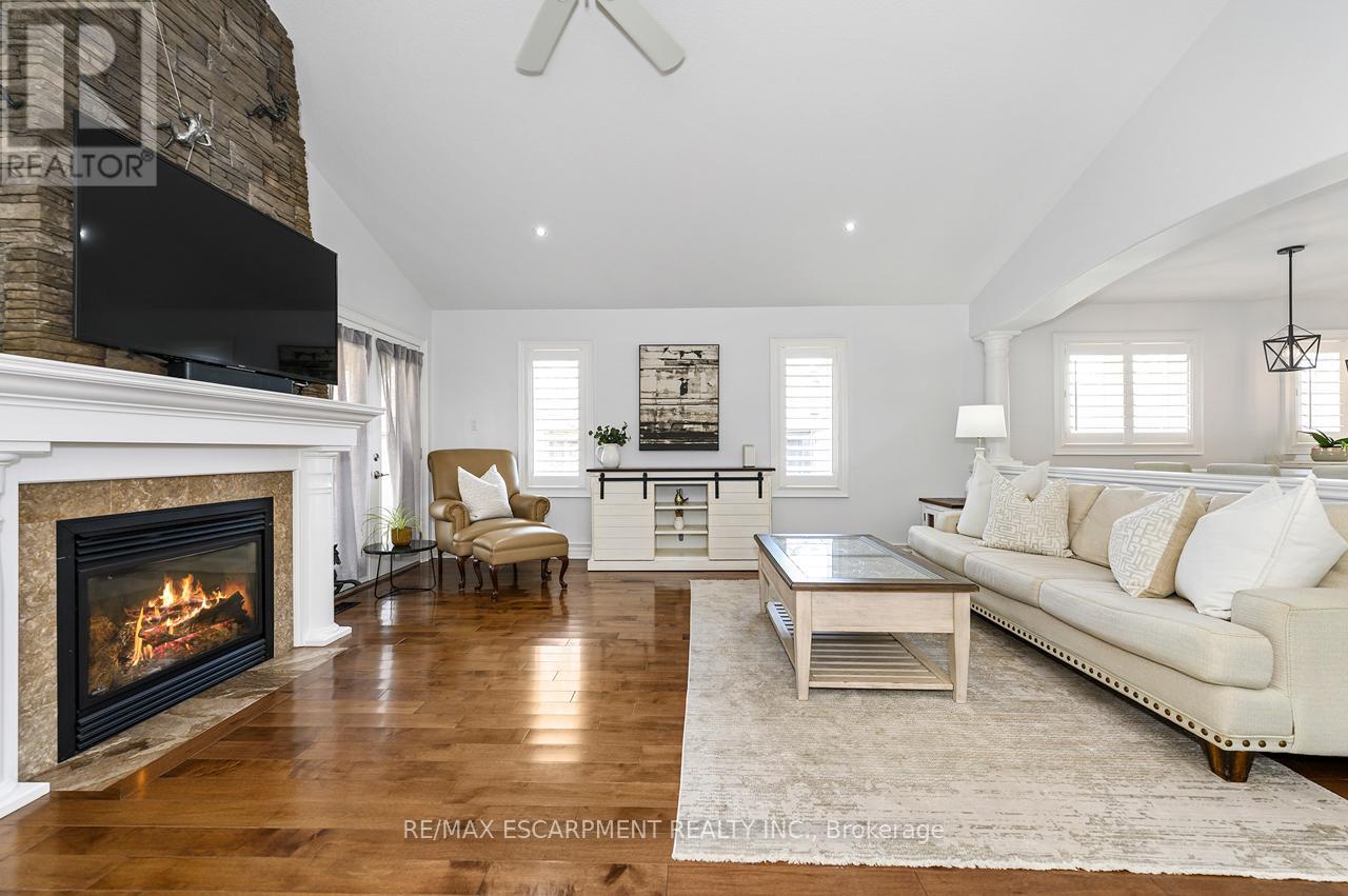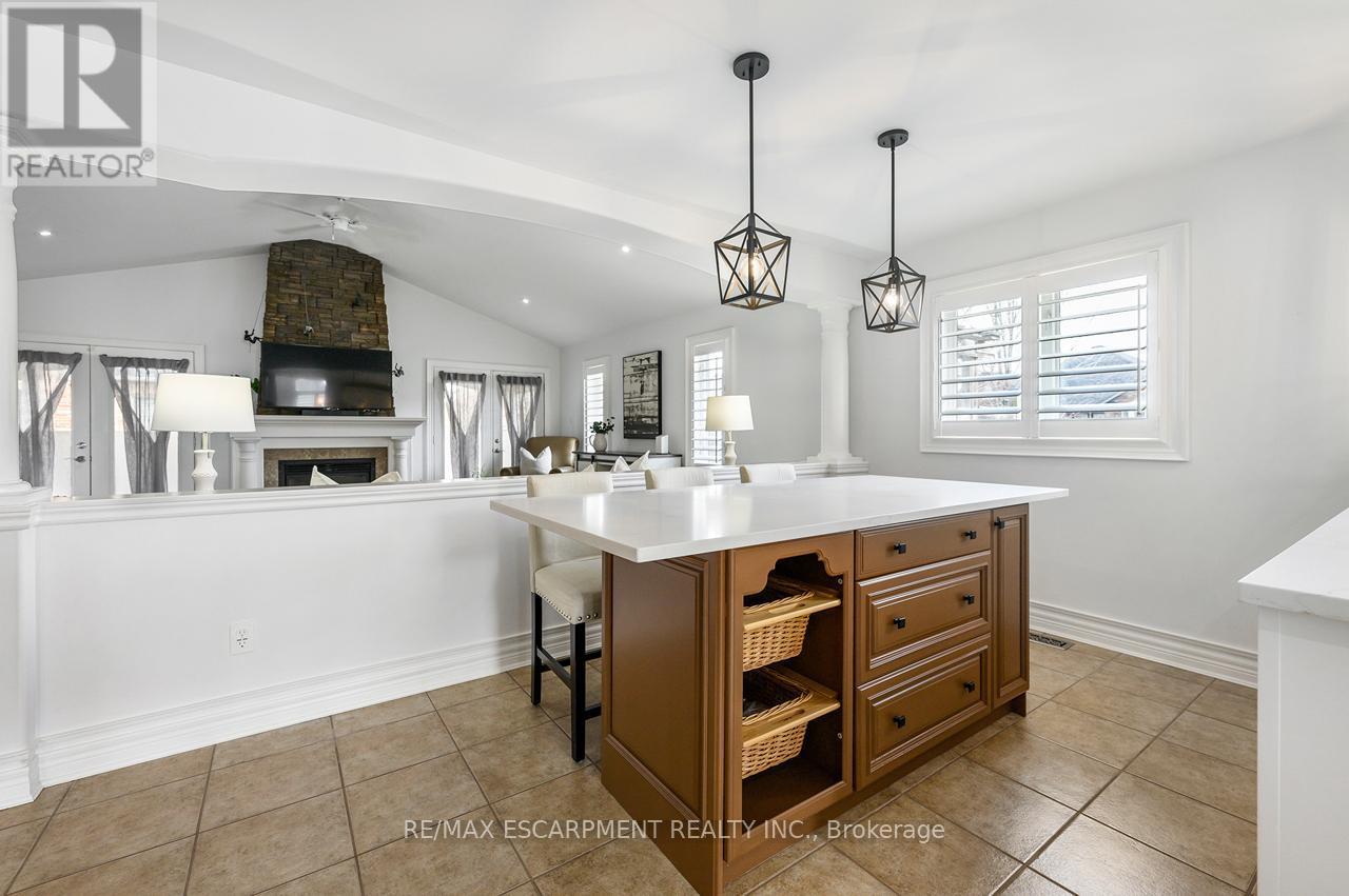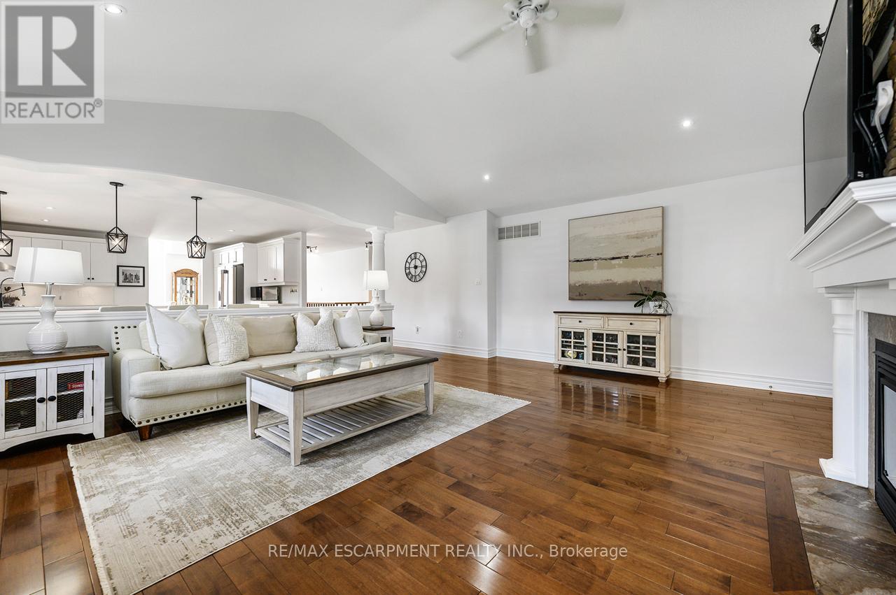 Rare offering of an absolutely gorgeous, impeccably maintained sprawling bungalow with a double car garage and parking for an additional 4 vehicles in the driveway. Set on beautifully landscaped grounds featuring thoughtful hardscaping, an in-ground sprinkler system, and exceptional curb appeal. Offering over 3500 sq ft of fully finished living space, this impressive home delivers comfort, functionality, and elegance throughout. A spacious entryway welcomes you into the sun-filled vaulted dining area that flows seamlessly into the open-concept kitchen, complete with stainless steel appliances, gas stove, quartz countertops, a large peninsula, and centre island overlooking the grand family room with gas fireplace. French doors lead to a charming gazebo, creating the perfect setting for indoor and outdoor entertaining. The main floor features a spacious primary bedroom with walk-in closet and updated ensuite bathroom with glass shower, along with a second generously sized bedroom, a 4-piece bathroom, and convenient main floor laundry. The fully finished lower level offers excellent additional living space including a large rec room, home office, third bedroom, updated 3-piece bathroom, and a versatile fourth room ideal for a gym, office, or playroom, plus abundant storage throughout. This exceptional home truly has it all inside and out, ideally suited for downsizers, empty nesters, or anyone seeking the ease of one-level living, all set on a quiet, tranquil street close to amenities. (id:4555)