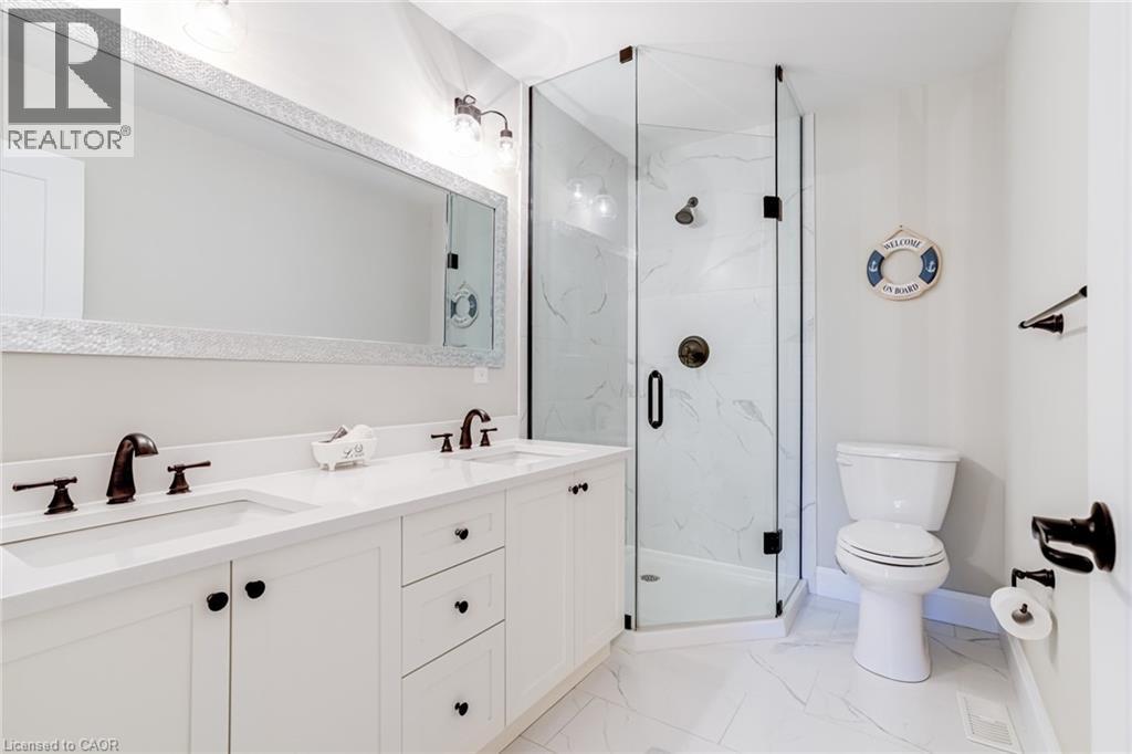 Custom constructed home in the Hamilton Beach Community steps from Lake Ontario!! This 3 bedroom, 2.5 bathroom has over 1700 square feet and was built in 2018 with wonderful finishes throughout! The main floor’s open concept floor plan features a gorgeous all white kitchen with tiled backsplash, stainless steel appliances, beautiful glass decorative cupboards, large island with added seating and is combined with the dining area for more formal dinners. The expansive family room boasts functionality and flexibility with many options for arranging lounge space and a gas fireplace focal point. The main level is complete with a spacious foyer, 2-piece powder room, and inside entry to the garage. The second level features 3 spacious bedrooms, an additional 4-piece bathroom and a highly desirable second level laundry room with an abundance of storage. The primary bedrooms boasts a large walk-in closet and 4-piece ensuite. Large trees cascade over the fully fenced backyard with a newly added two-tiered deck for outdoor dining and lounging. Situated on a 40 x 100 foot lot with enough parking for 3 cars and located STEPS away from the entrance to the Waterfront Trail with gorgeous views of Lake Ontario. Amazing location with a quick drive to all the amenities of Hamilton and Burlington and the vineyards of Niagara! (id:4555)