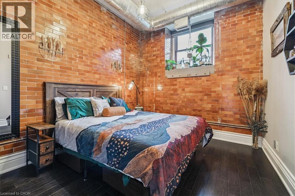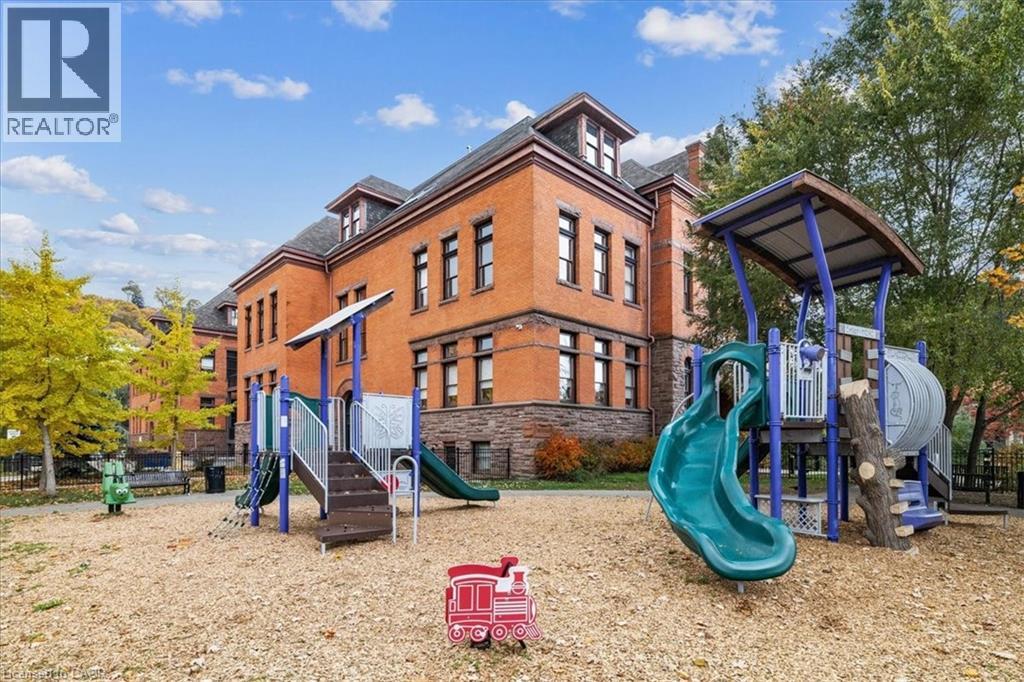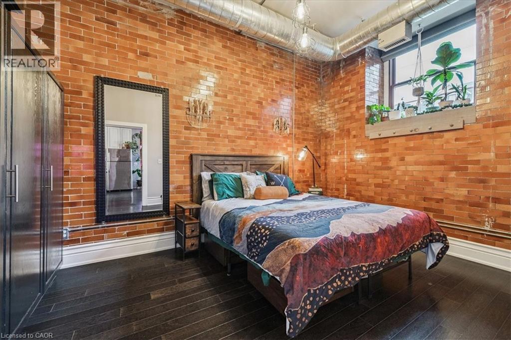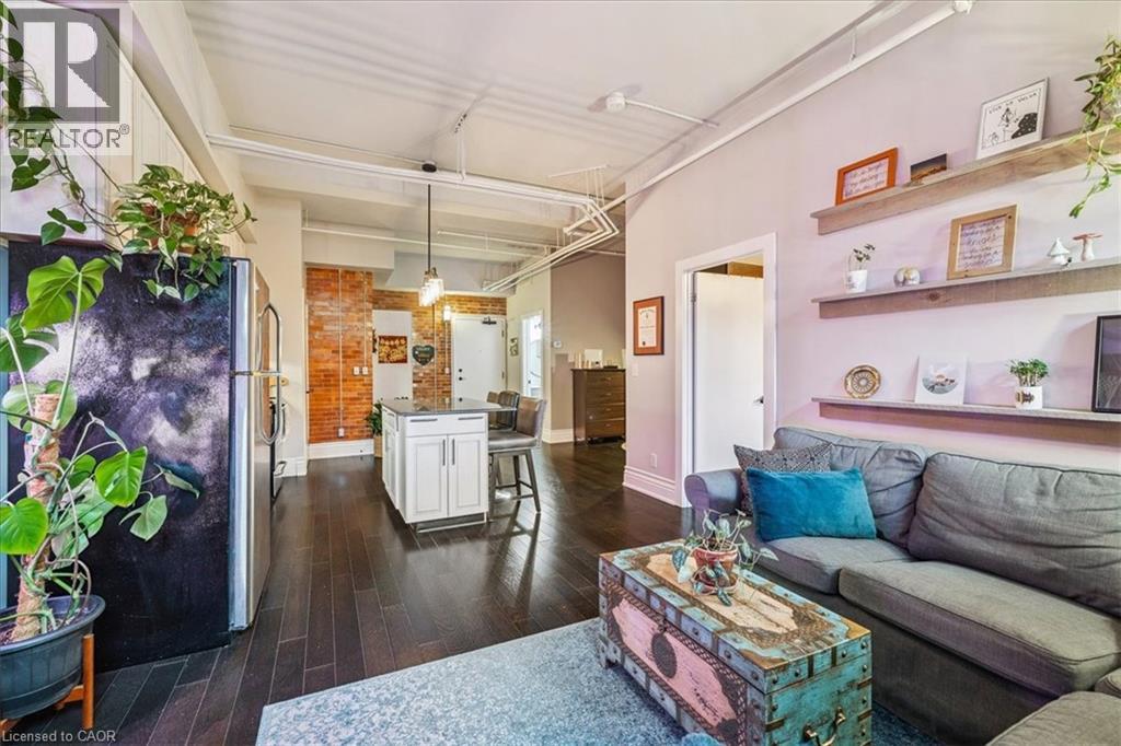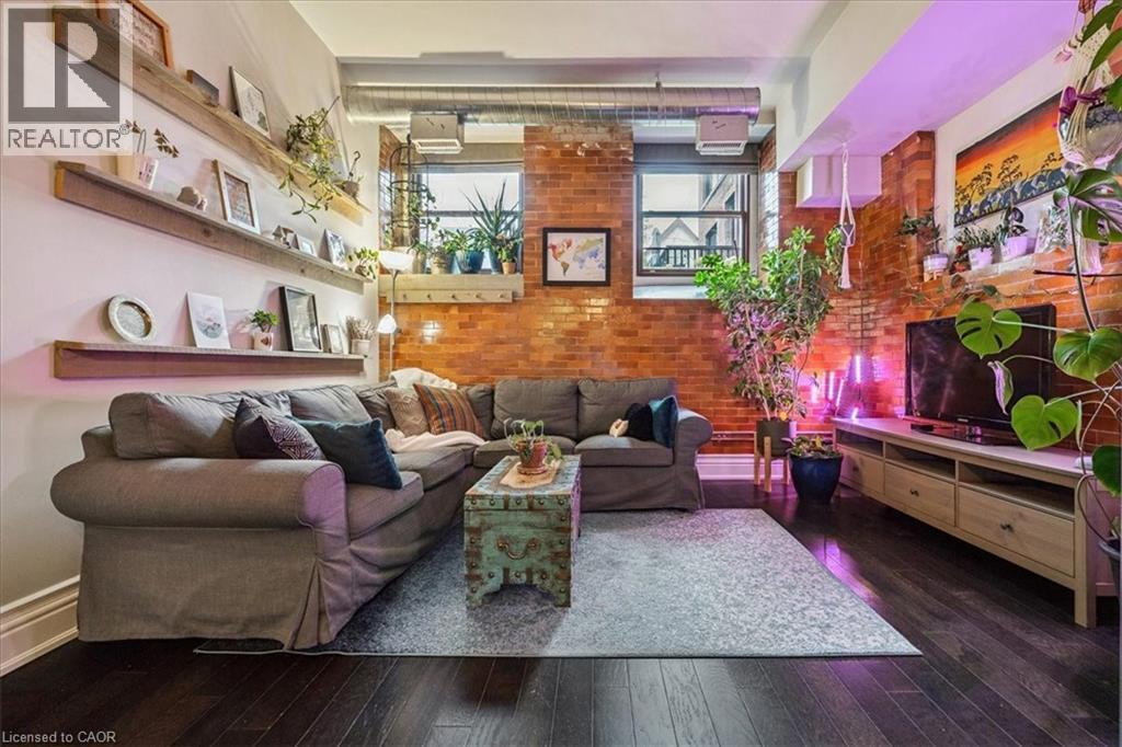 Charming loft-style condo in the heart of Hamilton, set within a beautifully converted schoolhouse dating back to 1894 and rich in architectural character. This spacious open-concept one bedroom, one bathroom offers an ideal blend of historic charm and modern updates. Featuring soaring 10' ceilings, large windows that flood the space with natural light, and glazed ceramic exposed brick accents, this carpet-free unit exudes warmth and style. The designer kitchen is complete with a centre island, granite countertops and stainless steel appliances which flows seamlessly into the living area. A versatile additional flex space offers the opportunity for a home office, den, library or separate dining area. Additional highlights include in-suite laundry, a renovated four-piece bathroom and hardwood flooring throughout. Perfect for professionals, first-time buyers, or downsizers. Conveniently located just minutes from the city centre with easy access to highways, transit, and a wide range of amenities. Don't miss it! (id:4555)