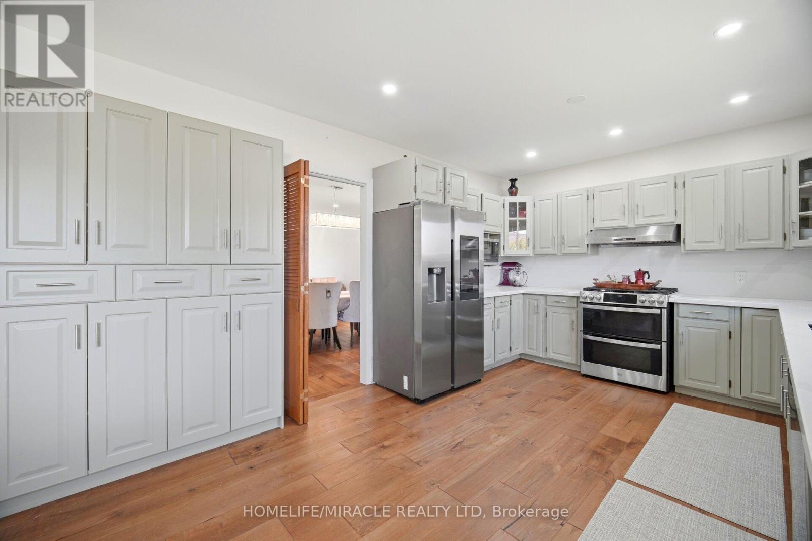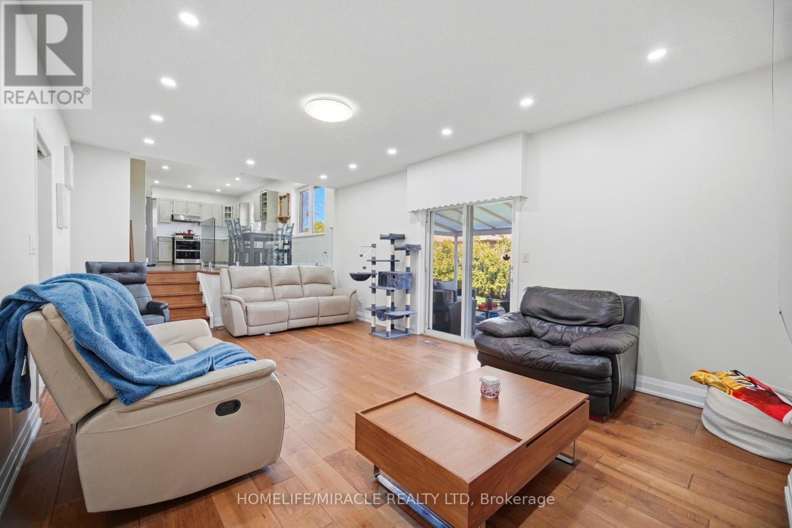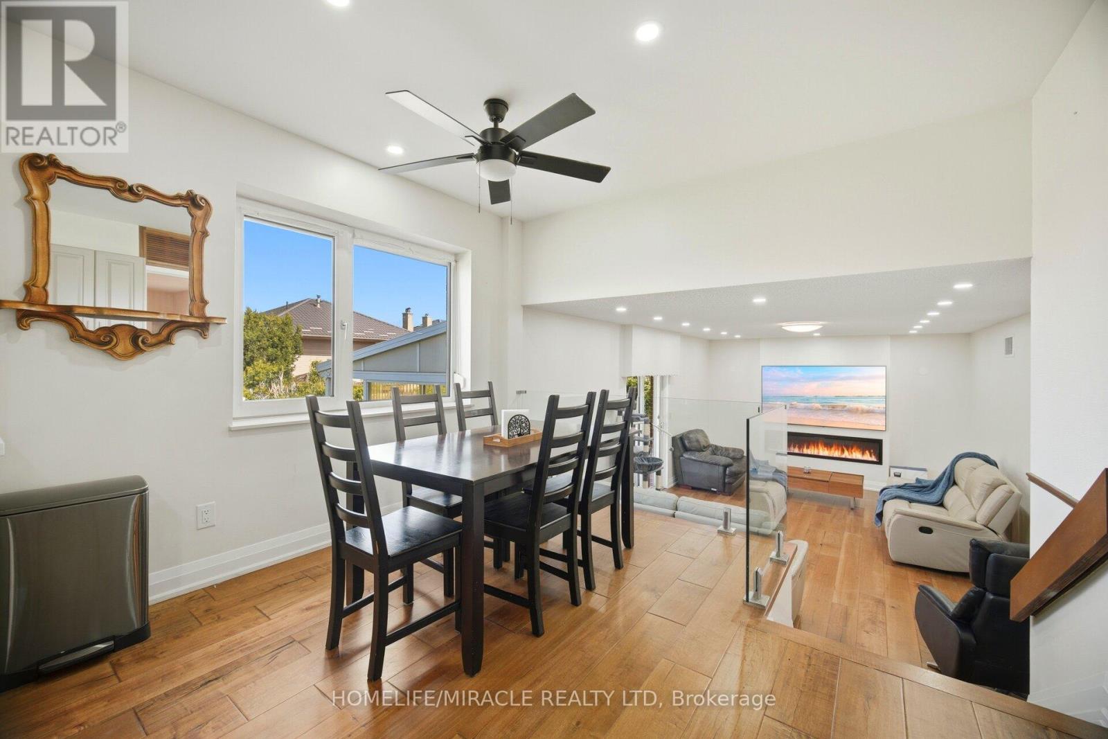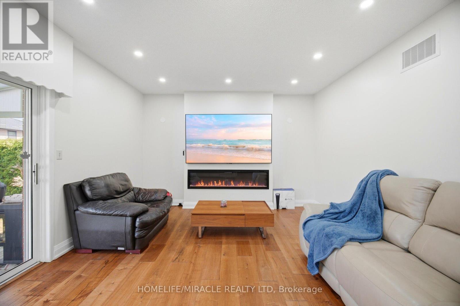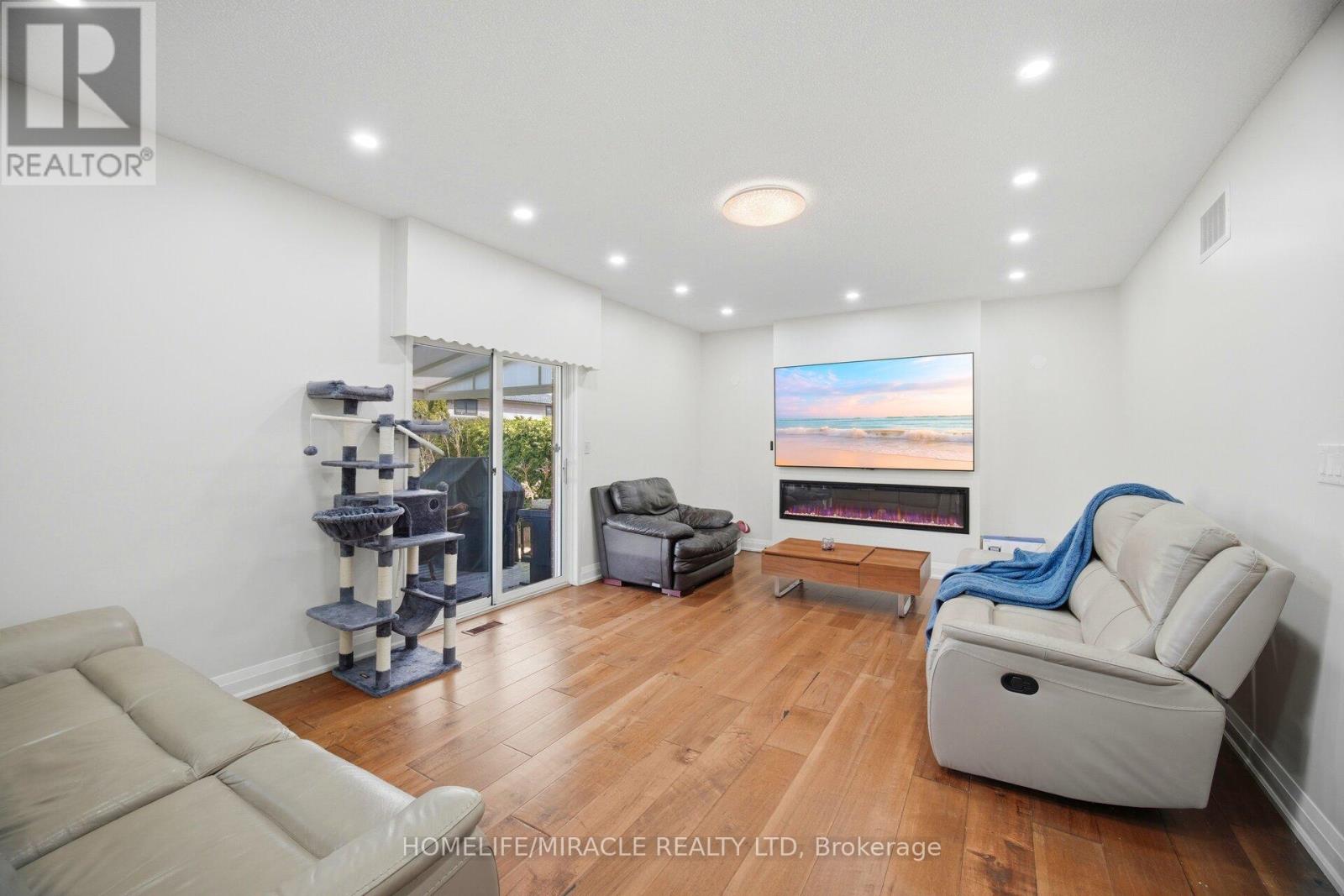Nestled on a quiet, tree-lined street, this beautifully renovated custom-built solid brick home sits on a rare pie-shaped lot, offering exceptional privacy, curb appeal, and charm in a highly desirable and family-friendly neighborhood. Featuring premium German-engineered inward-opening windows (2010) for enhanced energy efficiency and durability, the home was extensively renovated in 2023 with new hardwood flooring, a sleek stainless steel gas stove and refrigerator, and a striking electric fireplace with a mounted 85-inch television, creating a warm, modern, and inviting living environment throughout with high-quality finishes. The spacious eat-in kitchen with contemporary glass railings overlooks a sunken family room filled with natural light and offers a seamless walkout to a large, private backyard with a covered patio-ideal for entertaining, outdoor dining, or relaxing in a peaceful setting. The main level also includes customized baseboards, remotely operable dimmable pot lights, a well-appointed 3-piece bathroom, and a thoughtfully designed laundry room with full-size washer and dryer, built-in bottom drawers, and upper cabinets for ample storage. Direct access to an oversized two-car garage with automatic openers, a side entry door, and an additional refrigerator provides added convenience, functionality, and everyday peace of mind. Upstairs features three generously sized bedrooms, including a spacious primary suite with a fully renovated ensuite. The updated main bathroom offers a double vanity and a full-size custom cabinet for enhanced storage and practicality. With approximately 2,800 sq. ft. of living space, a basement crawl space behind built-in bookshelves, enhanced security shutters, and close proximity to highways, top-rated schools, shopping, parks, and scenic surroundings, this move-in-ready home delivers exceptional comfort, style, and location, making it a perfect choice for families and discerning buyers alike. (id:4555)