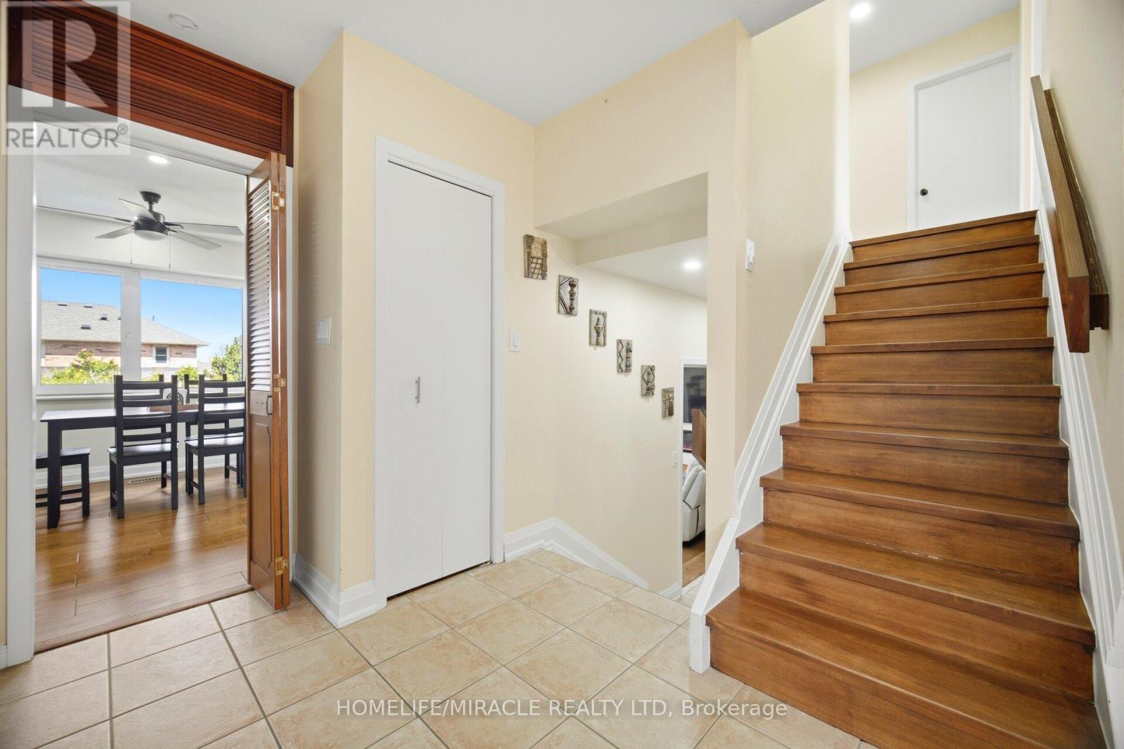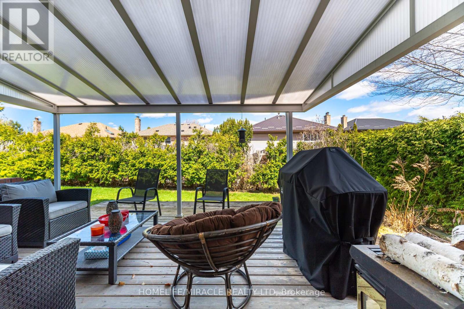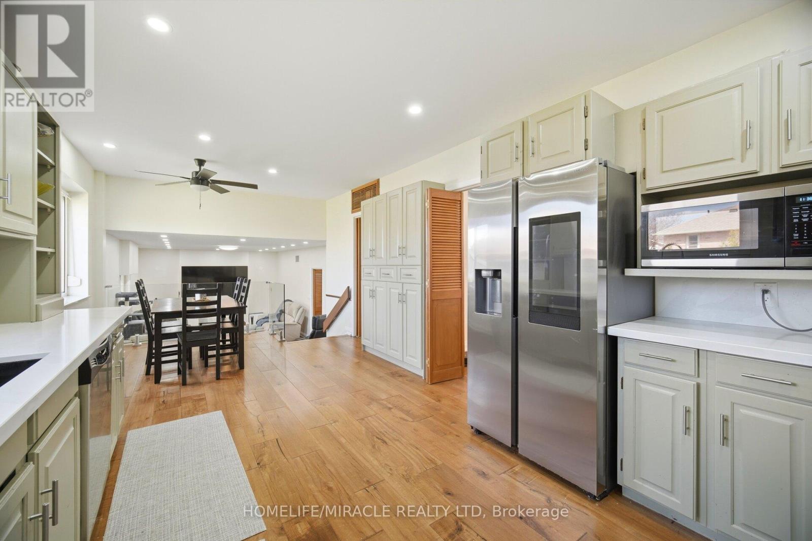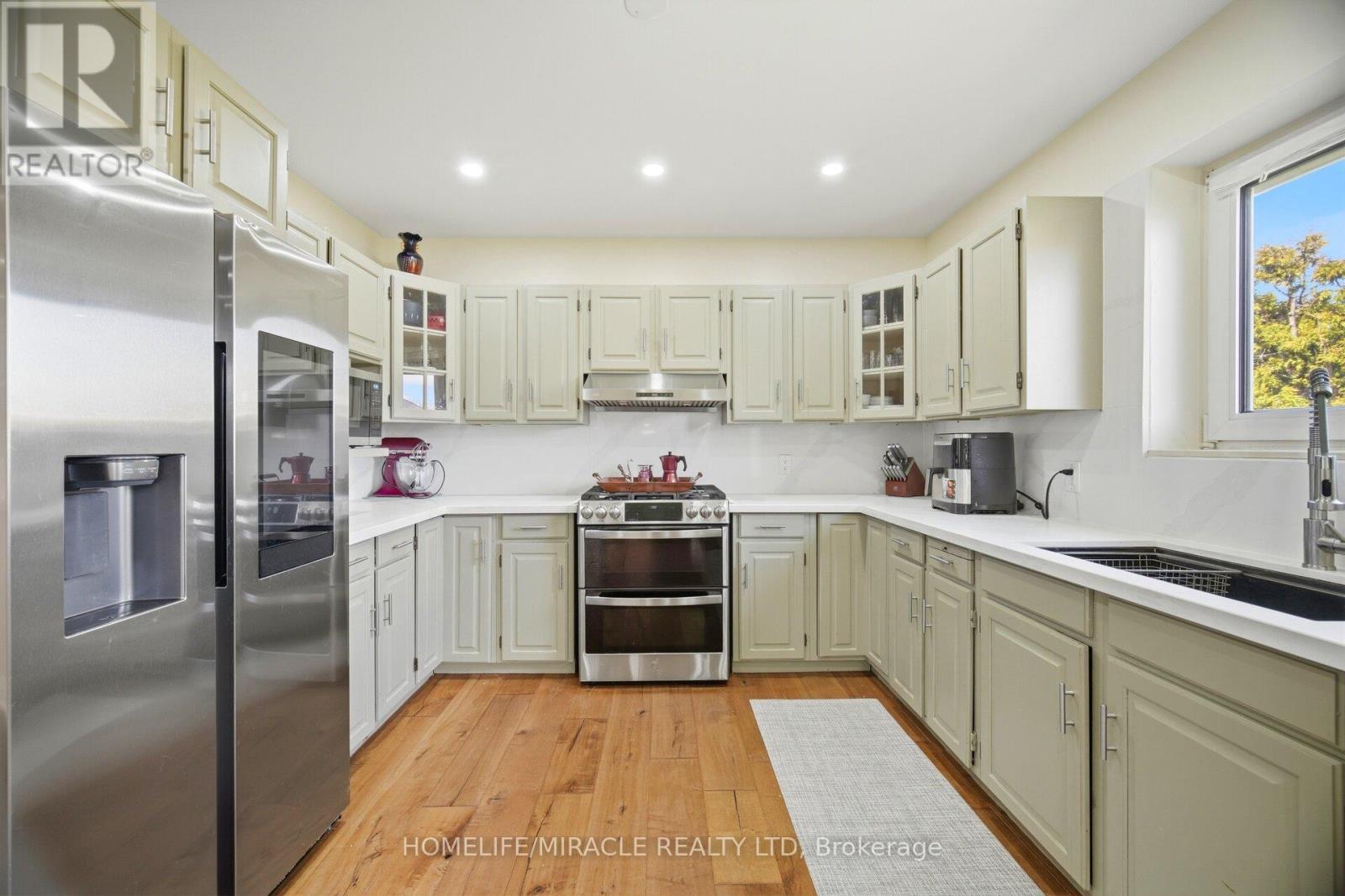 Nestled on a quiet, tree-lined street, this beautifully renovated custom-built solid brick home sits on a rare pie-shaped lot, offering exceptional privacy, curb appeal, and charm in a highly desirable and family-friendly neighborhood. Featuring premium German-engineered inward-opening windows (2010) for enhanced energy efficiency and durability, the home was extensively renovated in 2023 with new hardwood flooring, a sleek stainless steel gas stove and refrigerator, and a striking electric fireplace with a mounted 85-inch television, creating a warm, modern, and inviting living environment throughout with high-quality finishes. The spacious eat-in kitchen with contemporary glass railings overlooks a sunken family room filled with natural light and offers a seamless walkout to a large, private backyard with a covered patio-ideal for entertaining, outdoor dining, or relaxing in a peaceful setting. The main level also includes customized baseboards, remotely operable dimmable pot lights, a well-appointed 3-piece bathroom, and a thoughtfully designed laundry room with full-size washer and dryer, built-in bottom drawers, and upper cabinets for ample storage. Direct access to an oversized two-car garage with automatic openers, a side entry door, and an additional refrigerator provides added convenience, functionality, and everyday peace of mind. Upstairs features three generously sized bedrooms, including a spacious primary suite with a fully renovated ensuite. The updated main bathroom offers a double vanity and a full-size custom cabinet for enhanced storage and practicality. With approximately 2,800 sq. ft. of living space, a basement crawl space behind built-in bookshelves, enhanced security shutters, and close proximity to highways, top-rated schools, shopping, parks, and scenic surroundings, this move-in-ready home delivers exceptional comfort, style, and location, making it a perfect choice for families and discerning buyers alike. (id:4555)