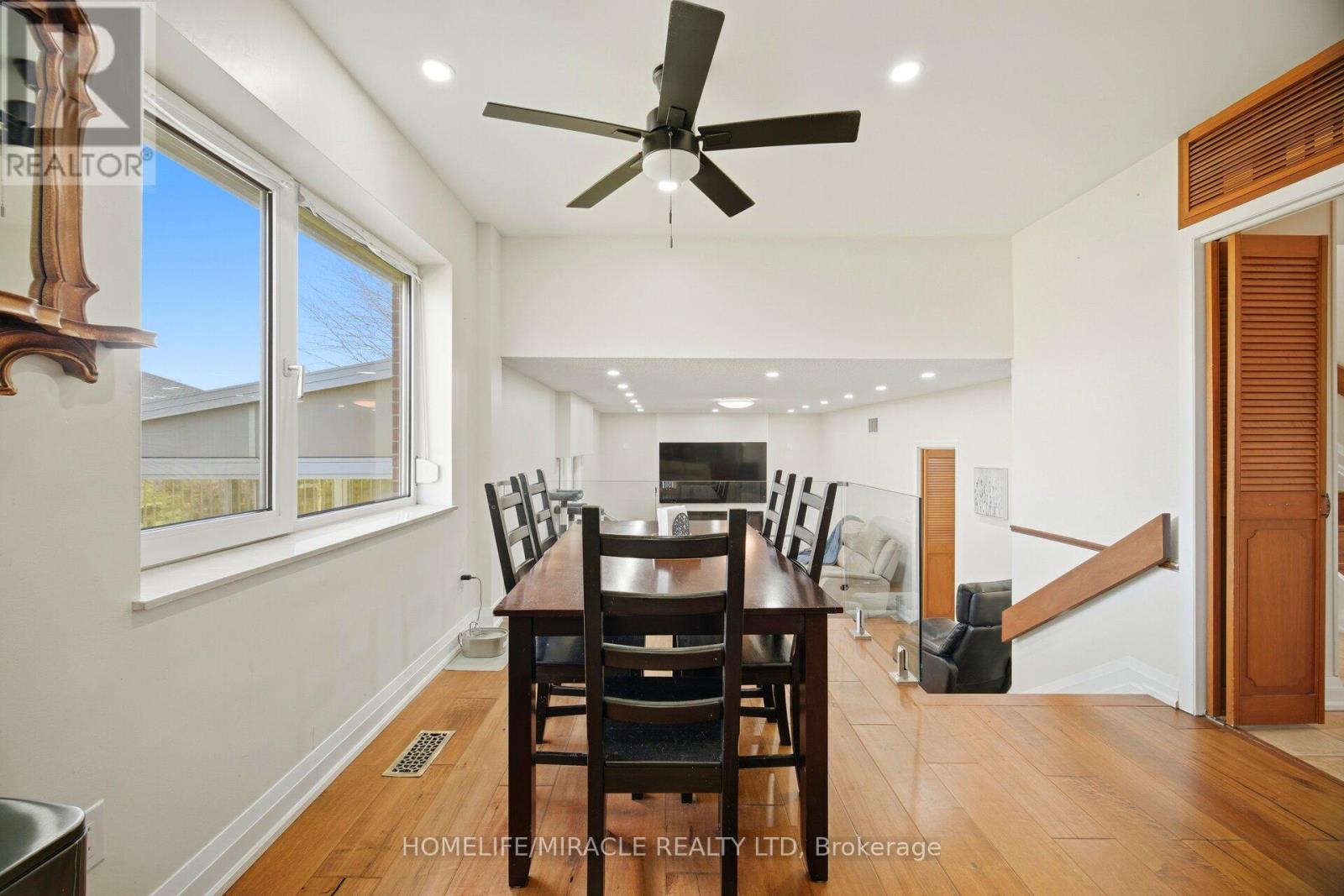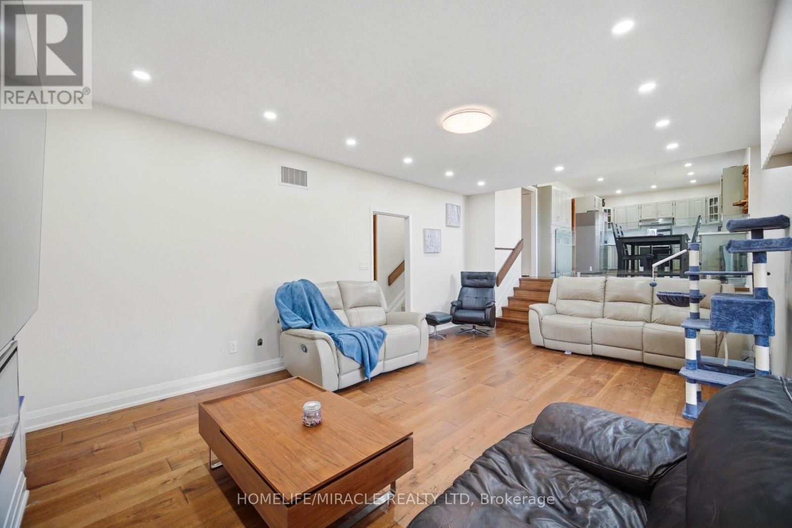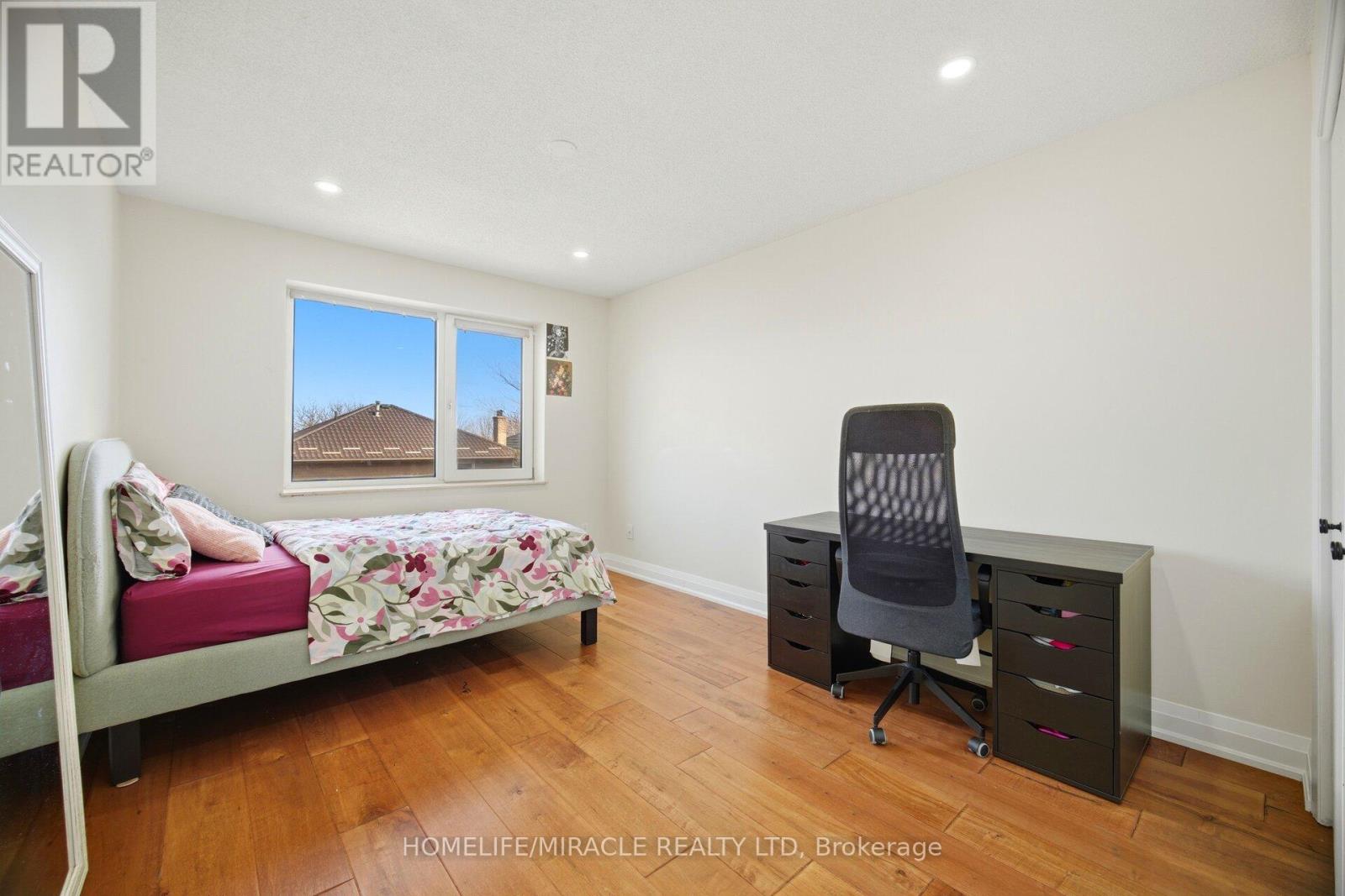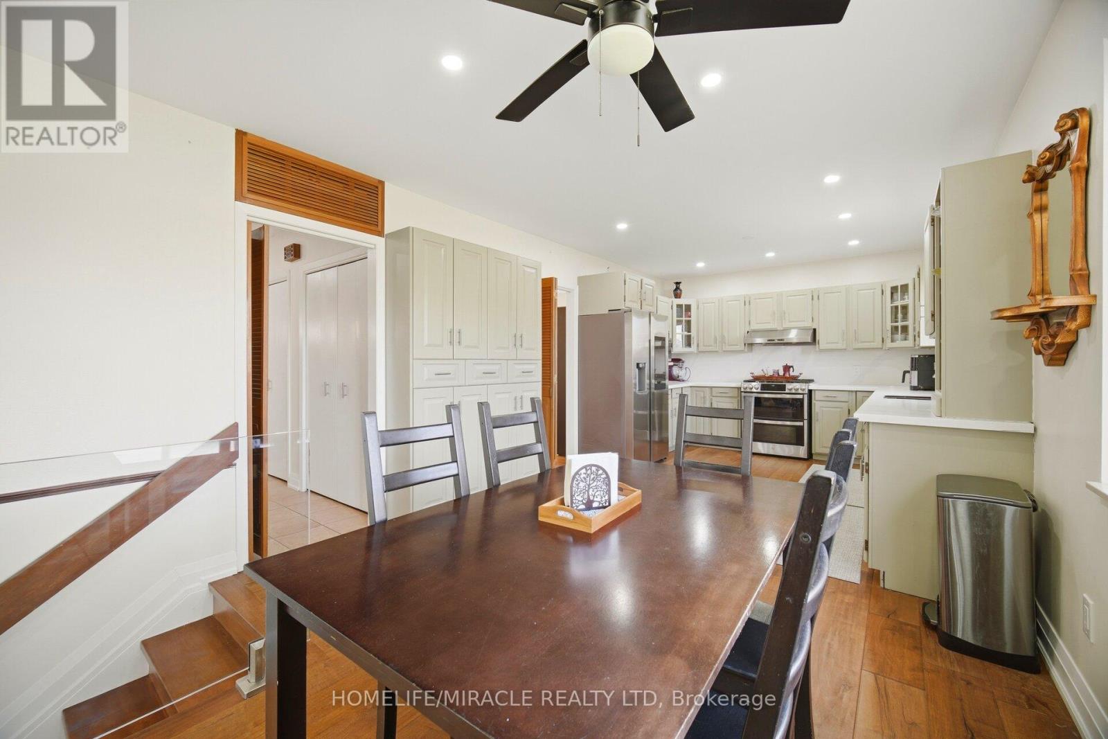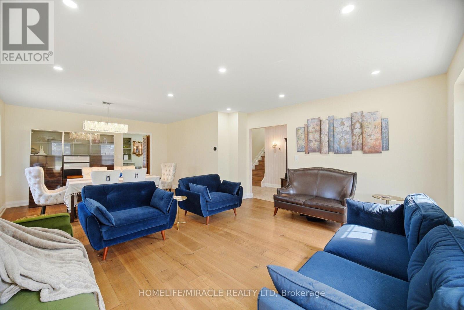Nestled on a quiet, tree-lined street, this beautifully renovated custom-built solid brick home sits on a rare pie-shaped lot, offering exceptional privacy, curb appeal, and charm in a highly desirable and family-friendly neighborhood. Featuring premium German-engineered inward-opening windows (2010) for enhanced energy efficiency and durability, the home was extensively renovated in 2023 with new hardwood flooring, a sleek stainless steel gas stove and refrigerator, and a striking electric fireplace with a mounted 85-inch television, creating a warm, modern, and inviting living environment throughout with high-quality finishes. The spacious eat-in kitchen with contemporary glass railings overlooks a sunken family room filled with natural light and offers a seamless walkout to a large, private backyard with a covered patio-ideal for entertaining, outdoor dining, or relaxing in a peaceful setting. The main level also includes customized baseboards, remotely operable dimmable pot lights, a well-appointed 3-piece bathroom, and a thoughtfully designed laundry room with full-size washer and dryer, built-in bottom drawers, and upper cabinets for ample storage. Direct access to an oversized two-car garage with automatic openers, a side entry door, and an additional refrigerator provides added convenience, functionality, and everyday peace of mind. Upstairs features three generously sized bedrooms, including a spacious primary suite with a fully renovated ensuite. The updated main bathroom offers a double vanity and a full-size custom cabinet for enhanced storage and practicality. With approximately 2,800 sq. ft. of living space, a basement crawl space behind built-in bookshelves, enhanced security shutters, and close proximity to highways, top-rated schools, shopping, parks, and scenic surroundings, this move-in-ready home delivers exceptional comfort, style, and location, making it a perfect choice for families and discerning buyers alike. (id:4555)