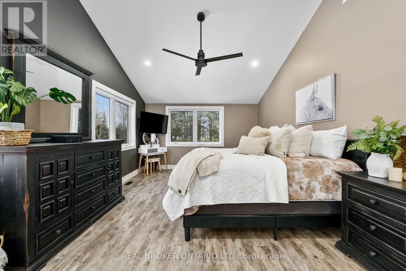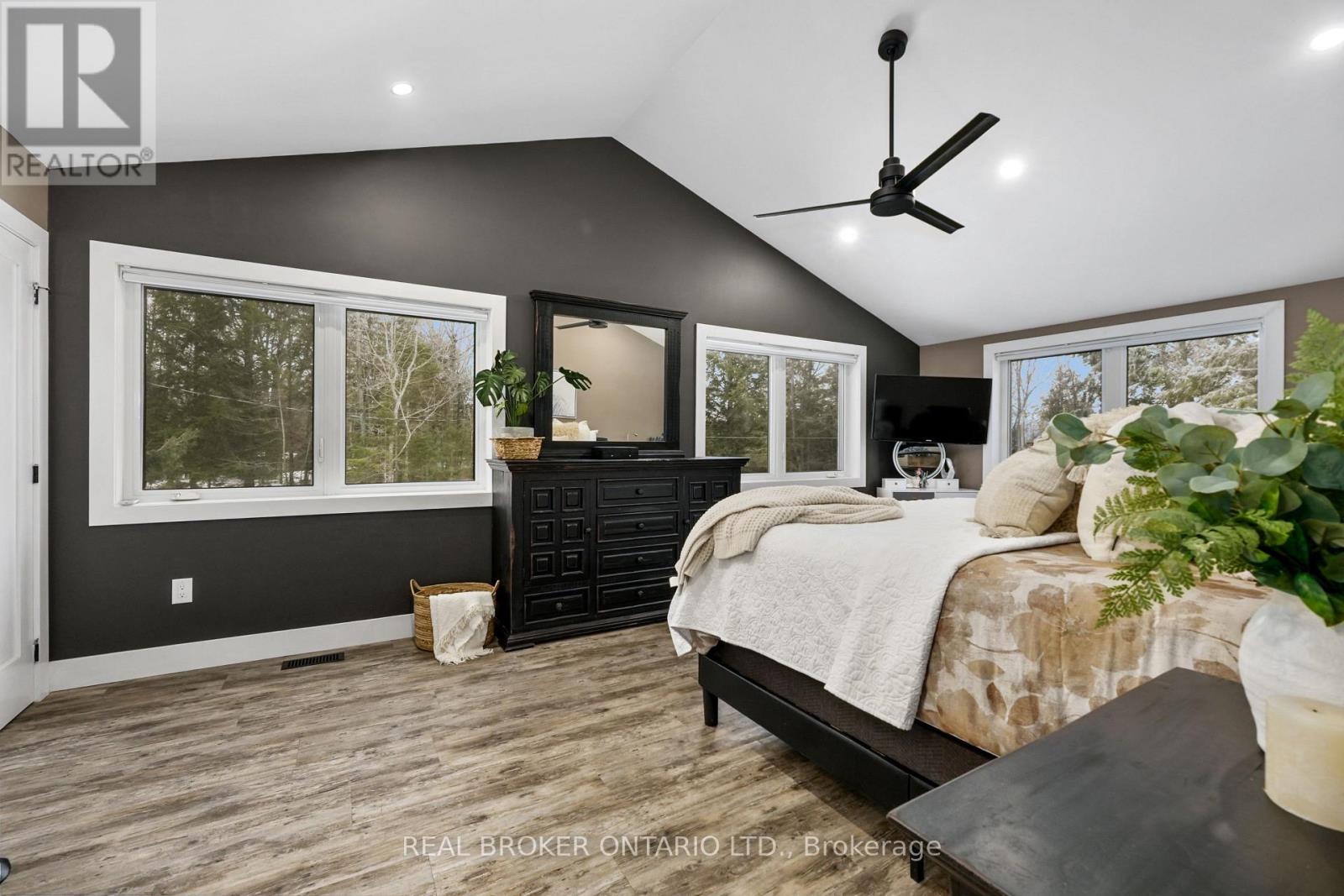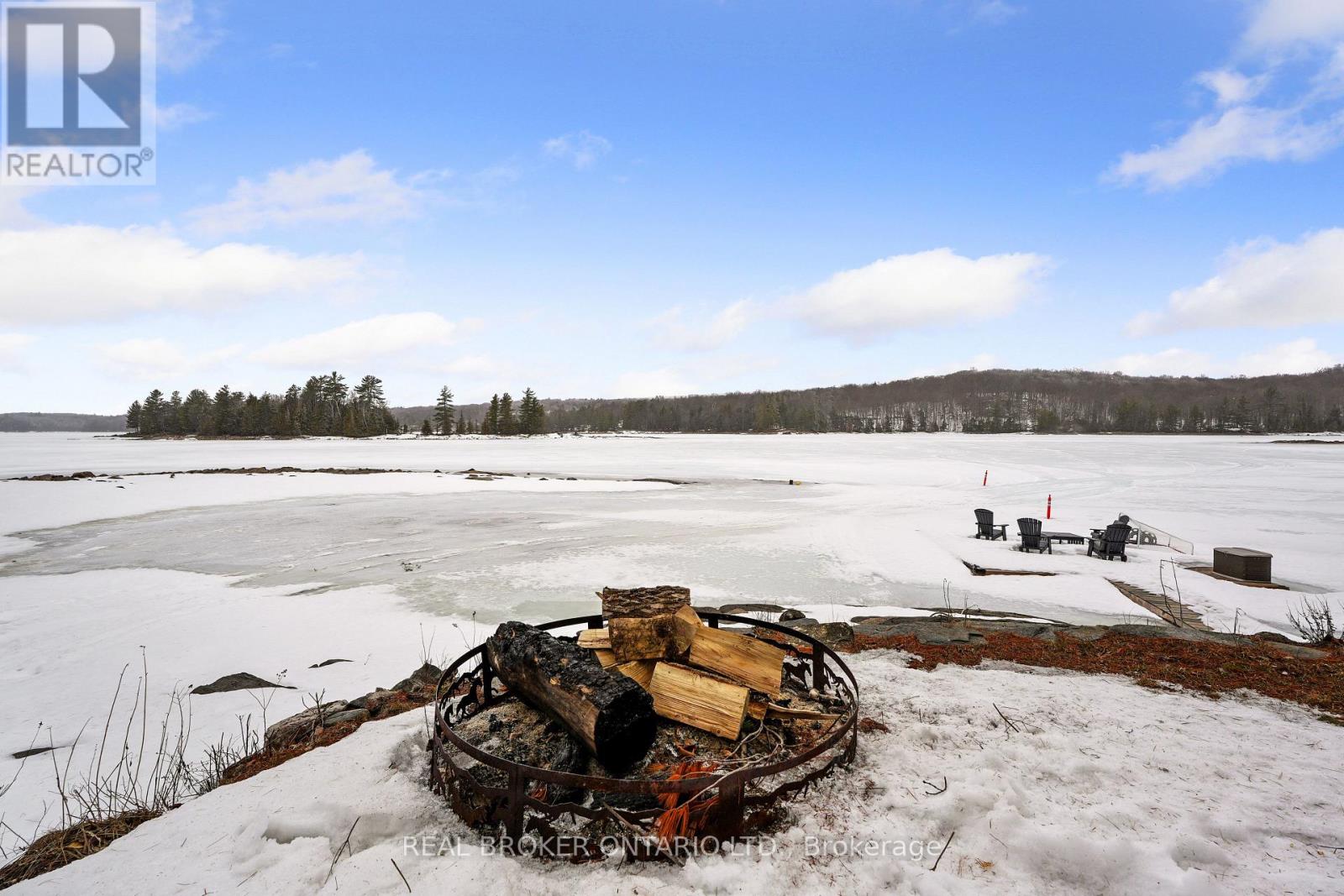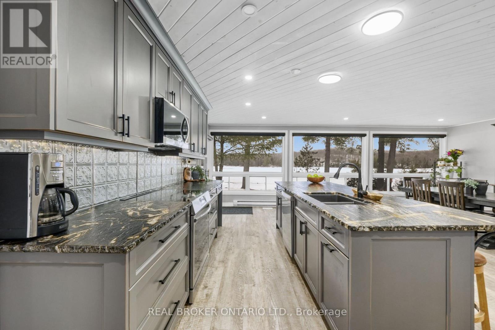 Once-in-a-lifetime opportunity on Eels Lake. This exceptional waterfront property offers one of the few truly flat, level lots on the lake, with 118 feet of private sandy beachfront and coveted western exposure for unforgettable sunsets. Set at the end of a quiet dead-end road with Crown land beside, it provides outstanding privacy and year-round enjoyment.Inside, soaring cathedral ceilings and walls of windows fill the home with natural light, while the gourmet chef's kitchen features leathered granite countertops and premium cabinetry. The main living area flows seamlessly to lakeside stamped concrete decking, creating the perfect indoor-outdoor space for entertaining or relaxing by the water. The home offers 3 bedrooms and 2 bathrooms, including a bath with heated floors and a soaker tub for added comfort. A cozy wood-burning fireplace, propane heating, and a 2-car garage with abundant storage ensure convenience in every season. A private bunkie and adjacent Crown land further enhance the sense of space and seclusion.Located just two hours from the GTA, this is a rare chance to own a flat, western-exposure waterfront property with exceptional privacy, luxury, and storage on one of the Kawarthas' most desirable lakes. (id:4555)