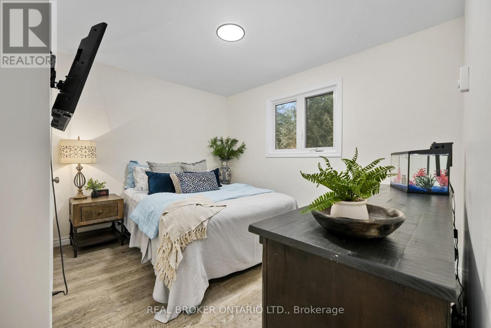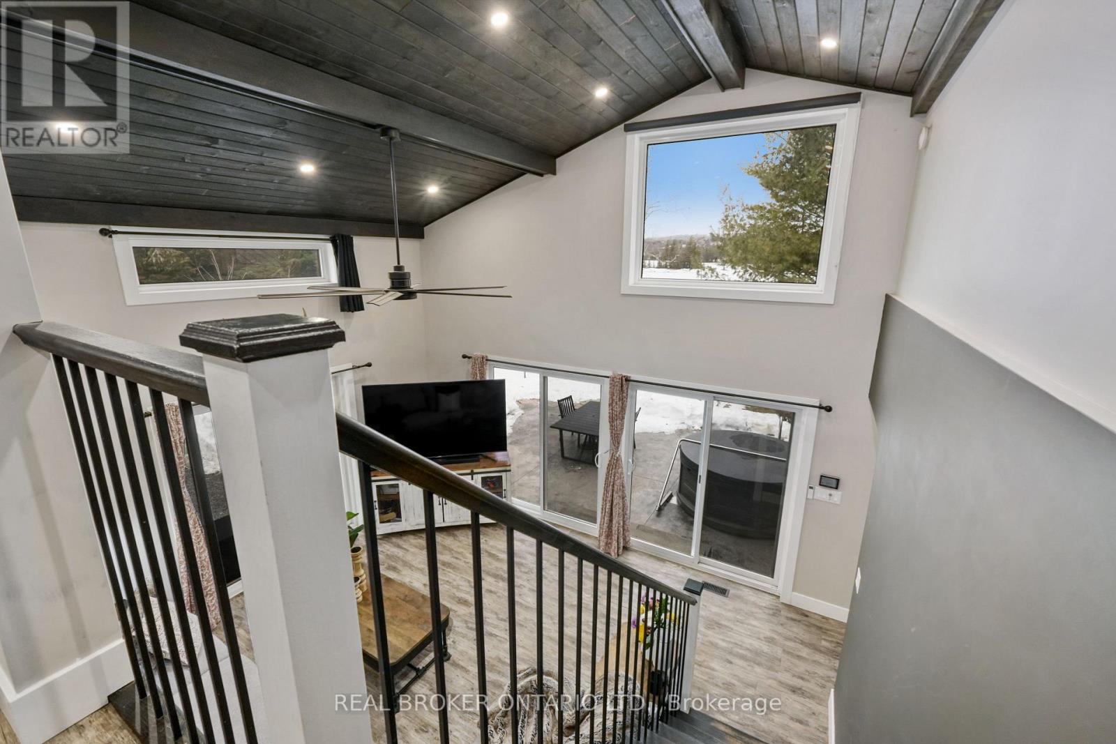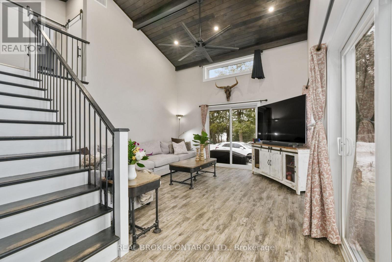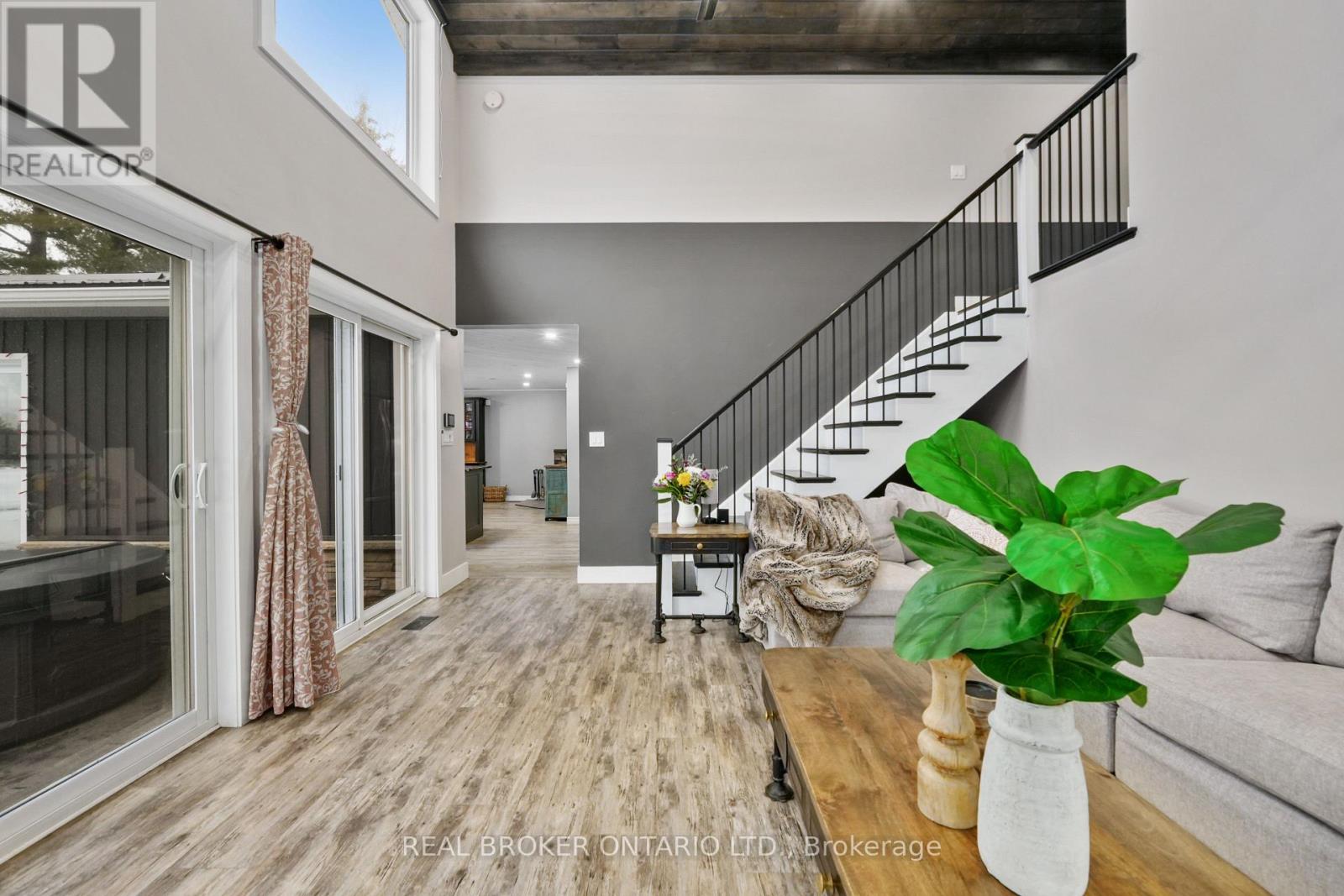 Once-in-a-lifetime opportunity on Eels Lake. This exceptional waterfront property offers one of the few truly flat, level lots on the lake, with 118 feet of private sandy beachfront and coveted western exposure for unforgettable sunsets. Set at the end of a quiet dead-end road with Crown land beside, it provides outstanding privacy and year-round enjoyment.Inside, soaring cathedral ceilings and walls of windows fill the home with natural light, while the gourmet chef's kitchen features leathered granite countertops and premium cabinetry. The main living area flows seamlessly to lakeside stamped concrete decking, creating the perfect indoor-outdoor space for entertaining or relaxing by the water. The home offers 3 bedrooms and 2 bathrooms, including a bath with heated floors and a soaker tub for added comfort. A cozy wood-burning fireplace, propane heating, and a 2-car garage with abundant storage ensure convenience in every season. A private bunkie and adjacent Crown land further enhance the sense of space and seclusion.Located just two hours from the GTA, this is a rare chance to own a flat, western-exposure waterfront property with exceptional privacy, luxury, and storage on one of the Kawarthas' most desirable lakes. (id:4555)