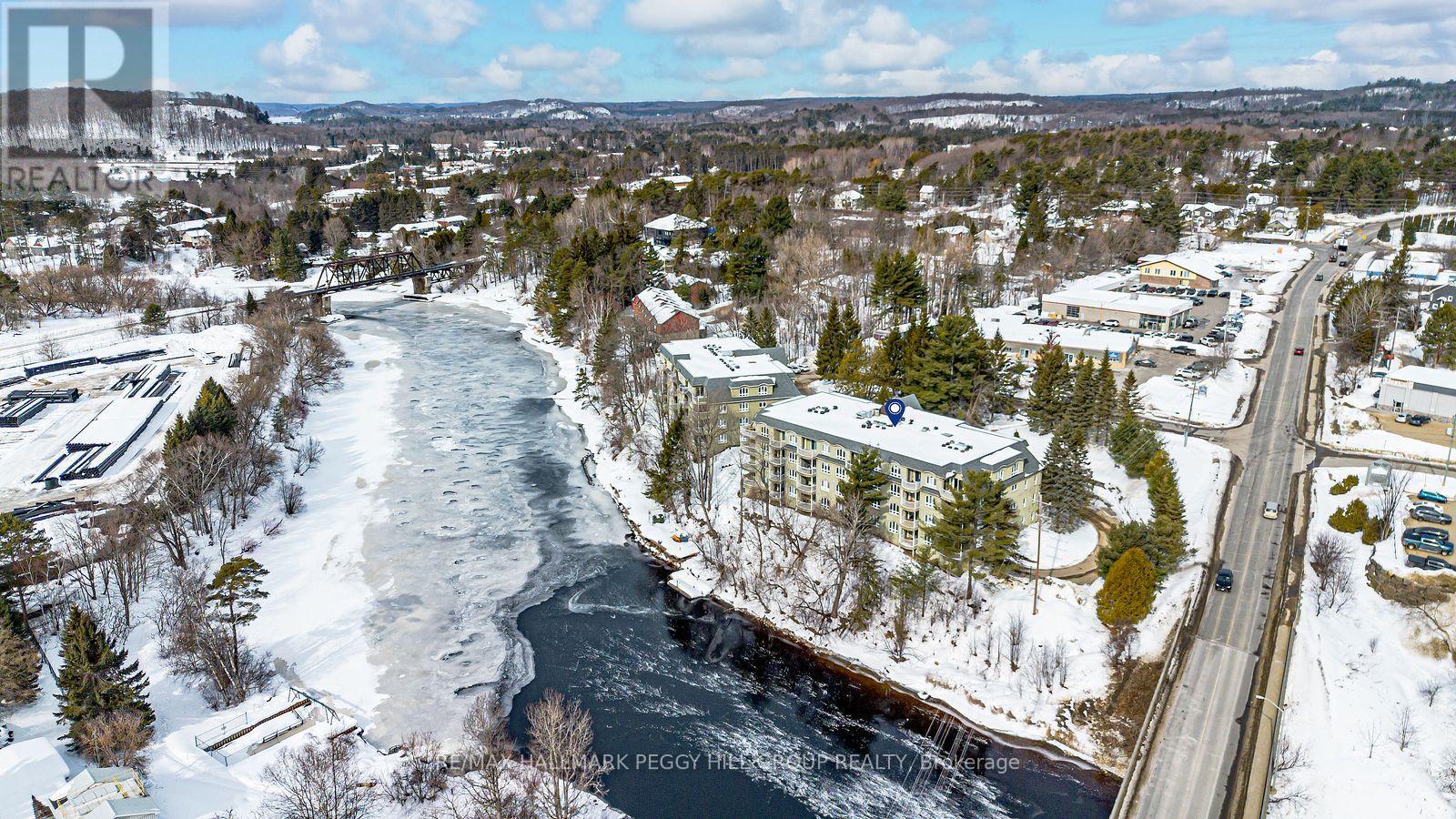 ENJOY WATERFRONT LIVING IN THE HEART OF MUSKOKA'S COTTAGE COUNTRY WITH EASY ACCESS TO NATURE & DOWNTOWN HUNTSVILLE! Experience waterfront living along the Muskoka River in this bright and inviting condo, tucked away on a quiet dead-end street yet just steps from the charming downtown core of Huntsville with riverside parks, boutique shops, dining, cultural centres, and community events. Enjoy endless outdoor adventures nearby, from scenic walks along the Hunters Bay Trail to sun-soaked days at Hutcheson Beach on Lake Vernon and exploring the natural beauty of Arrowhead Provincial Park. This well-maintained building offers shared waterfront amenities, including a private dock and community BBQ area, while your private open balcony provides a serene spot to take in the surroundings. Inside, oversized windows fill the space with light, highlighting upgraded hardwood floors throughout. The open-concept kitchen, living, and dining area features a centre island, generous prep space, and sliding glass walkout to the balcony, creating a seamless flow for entertaining or relaxing at home. A spacious bedroom and a flexible den are paired with a full 4-piece bathroom featuring a tub, and convenience is complete with a dedicated underground parking space and additional visitor parking available. This Muskoka #HomeToStay offers an inviting cottage country lifestyle, blending tranquil waterfront living, endless outdoor adventures, and the charm of a vibrant community right outside your door. (id:4555)